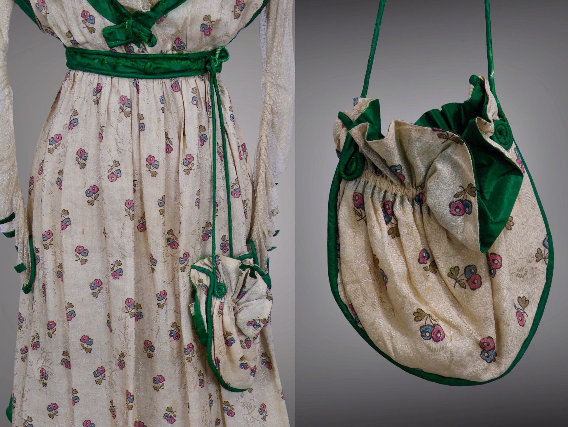 Antique 1900s Edwardian Floral Print Dress with Green Silk Trim & Matching Reticule Purse, XS