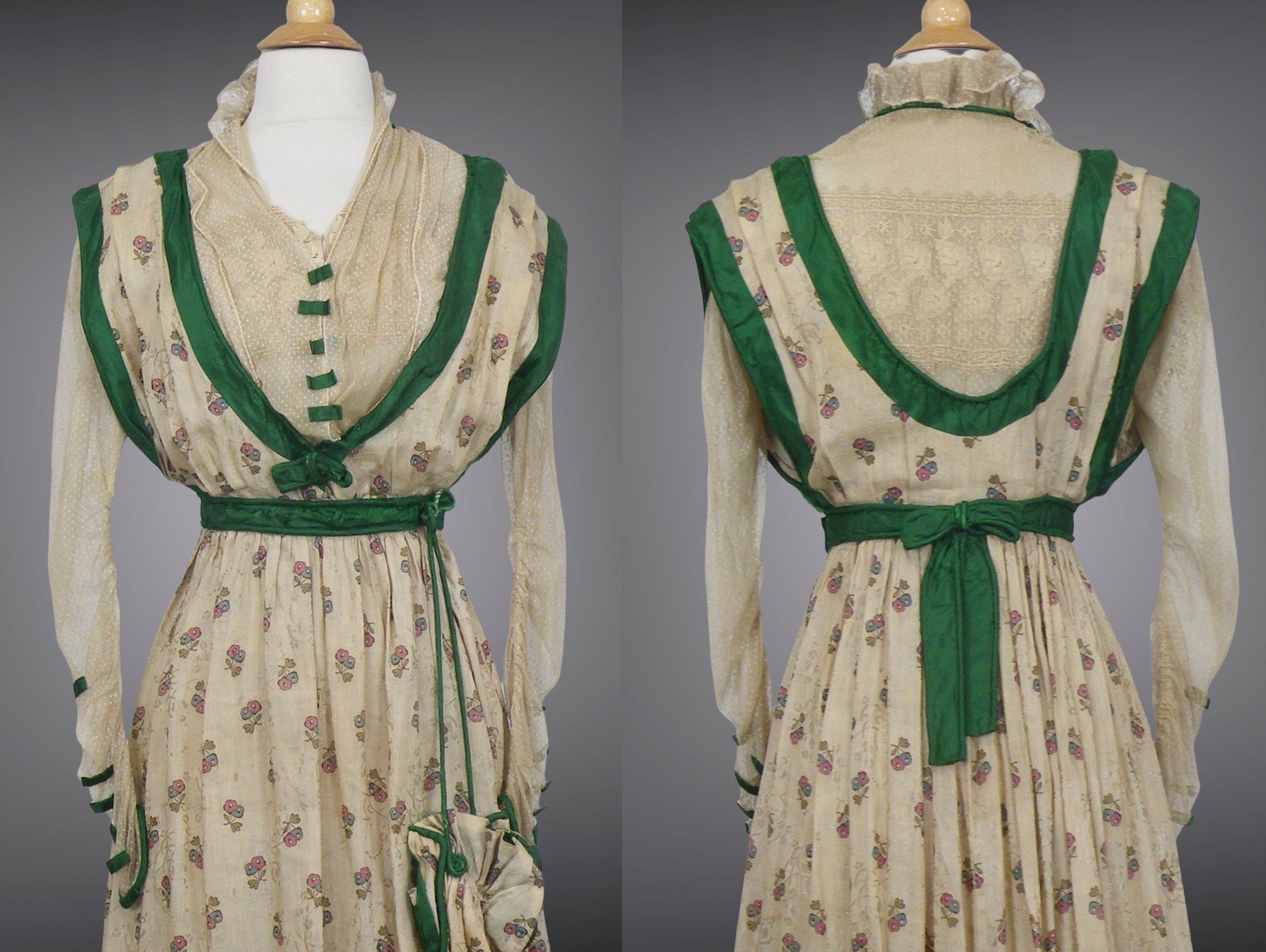 The bodice is constructed in three layers: an interior net lace foundation featuring scalloped filet lace across the bust, closing down the front with hook-and-eye fasteners; a second layer of fine dotted net embellished with small silk ribbon bows and two hook-and-loop closures; and an outer printed silk layer trimmed in wide swaths of emerald green silk, finished with a center bow accent at both the front and back. Sheer long dotted-net sleeves are ruched toward the cuffs and accented with additional emerald silk ribbon bows and rolled hems, with a short interior lace petal sleeve beneath.