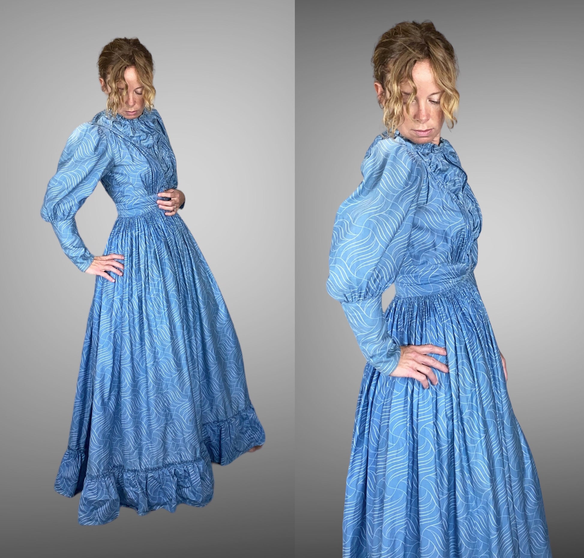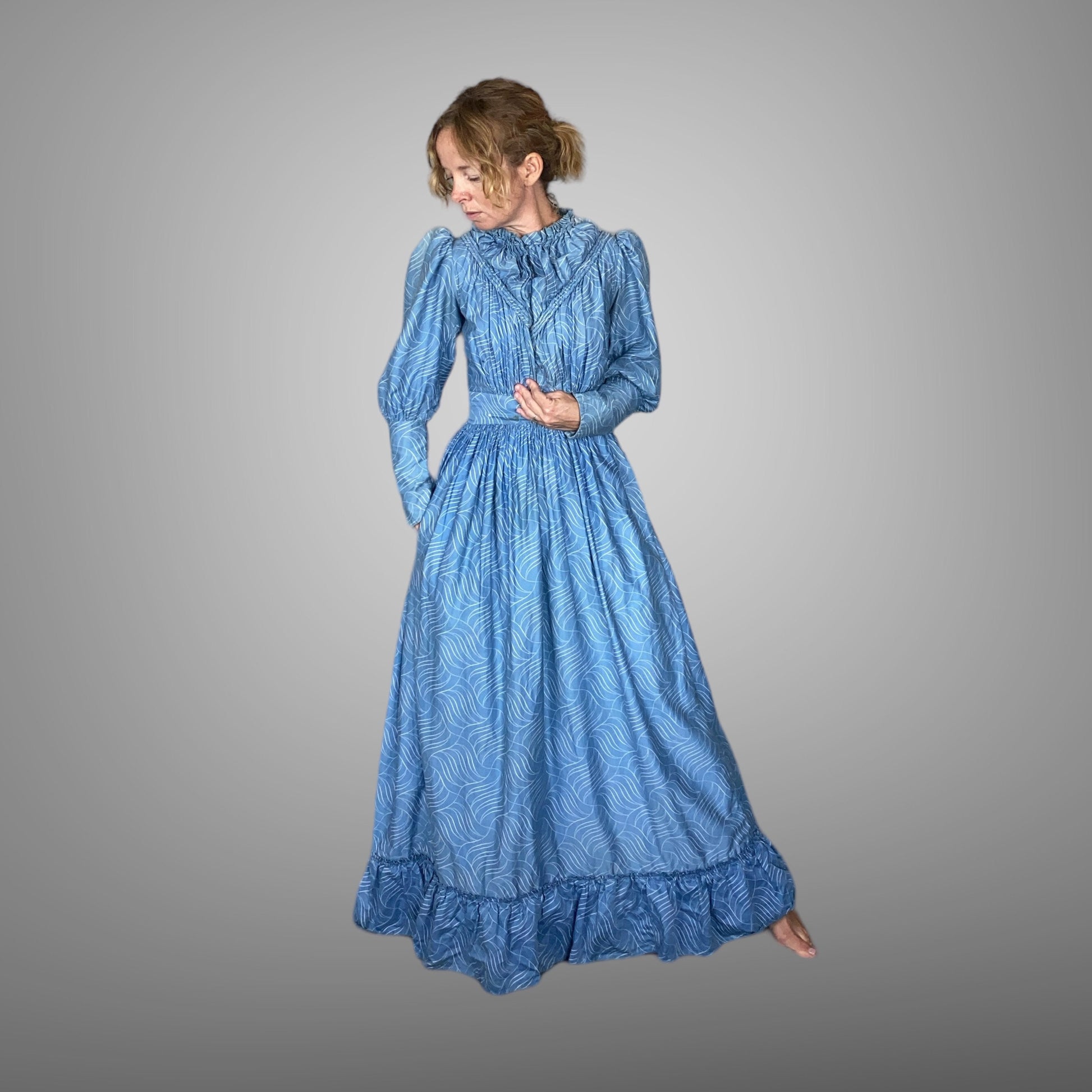 The floor-length skirt is heavily gathered below the waist, creating a sweeping, full silhouette with wonderful movement. A hidden right-side pocket is set into the skirt, and the hem is finished with a flounced edge for added period charm. The bodice, tapered sleeve sections, skirt pocket, and straight under-hem are lined in cotton muslin, providing structure and durability. The dress fastens down the front with hook-and-loop closures and at the left side waistband with one hook and two loops.
