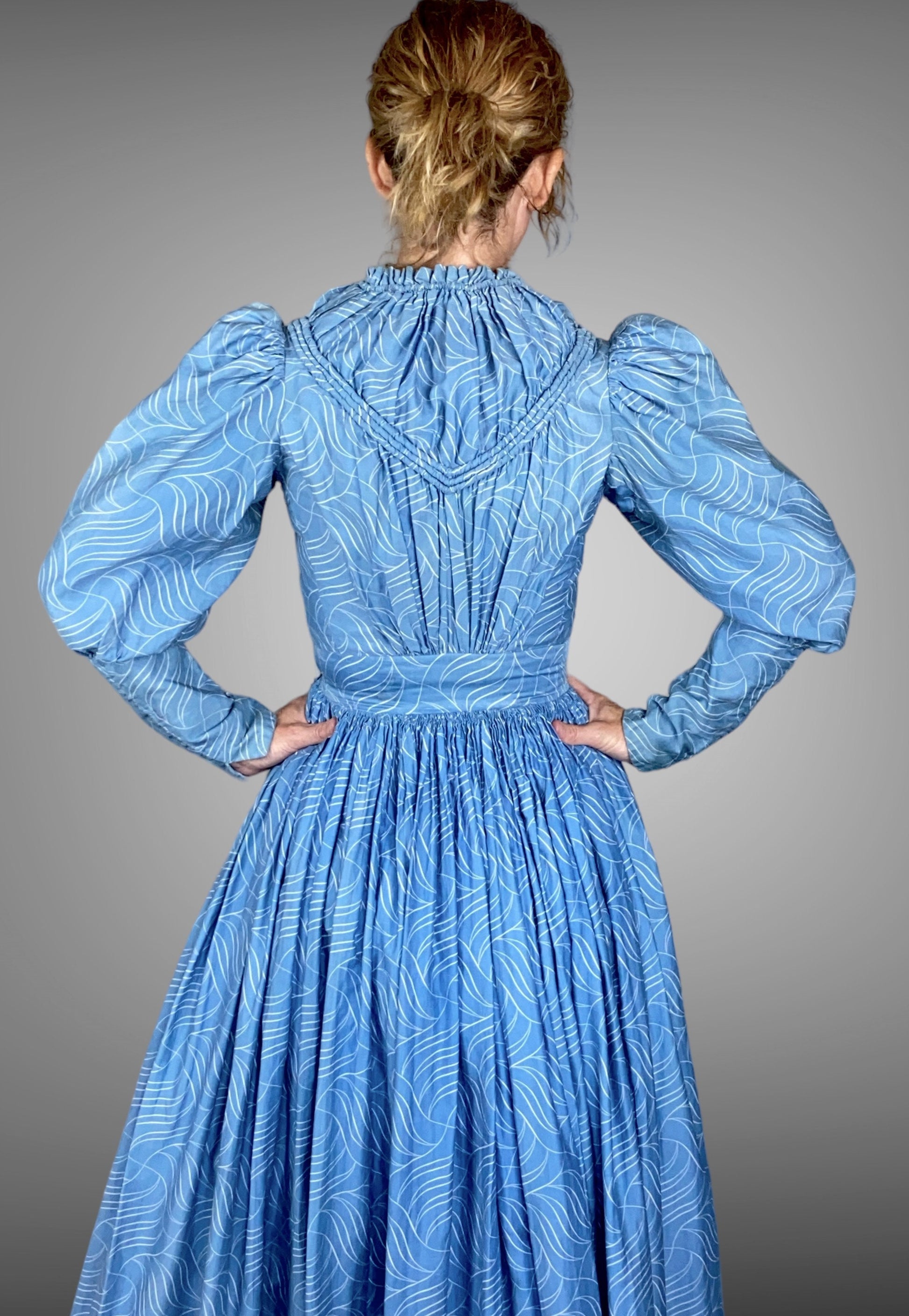 Eye-catching antique 1900s Victorian Edwardian cotton sateen day dress in a striking blue and white wavy linear leaf print. The cotton sateen has a soft sheen and substantial hand, well suited to everyday wear at the turn of the century. This dress is beautifully styled with a gathered, fitted neckline and yoke detailed with ruched piping, paired with full leg-of-mutton sleeves that taper elegantly to long fitted cuffs. A wide, nipped waistband defines the waist and anchors the silhouette.
