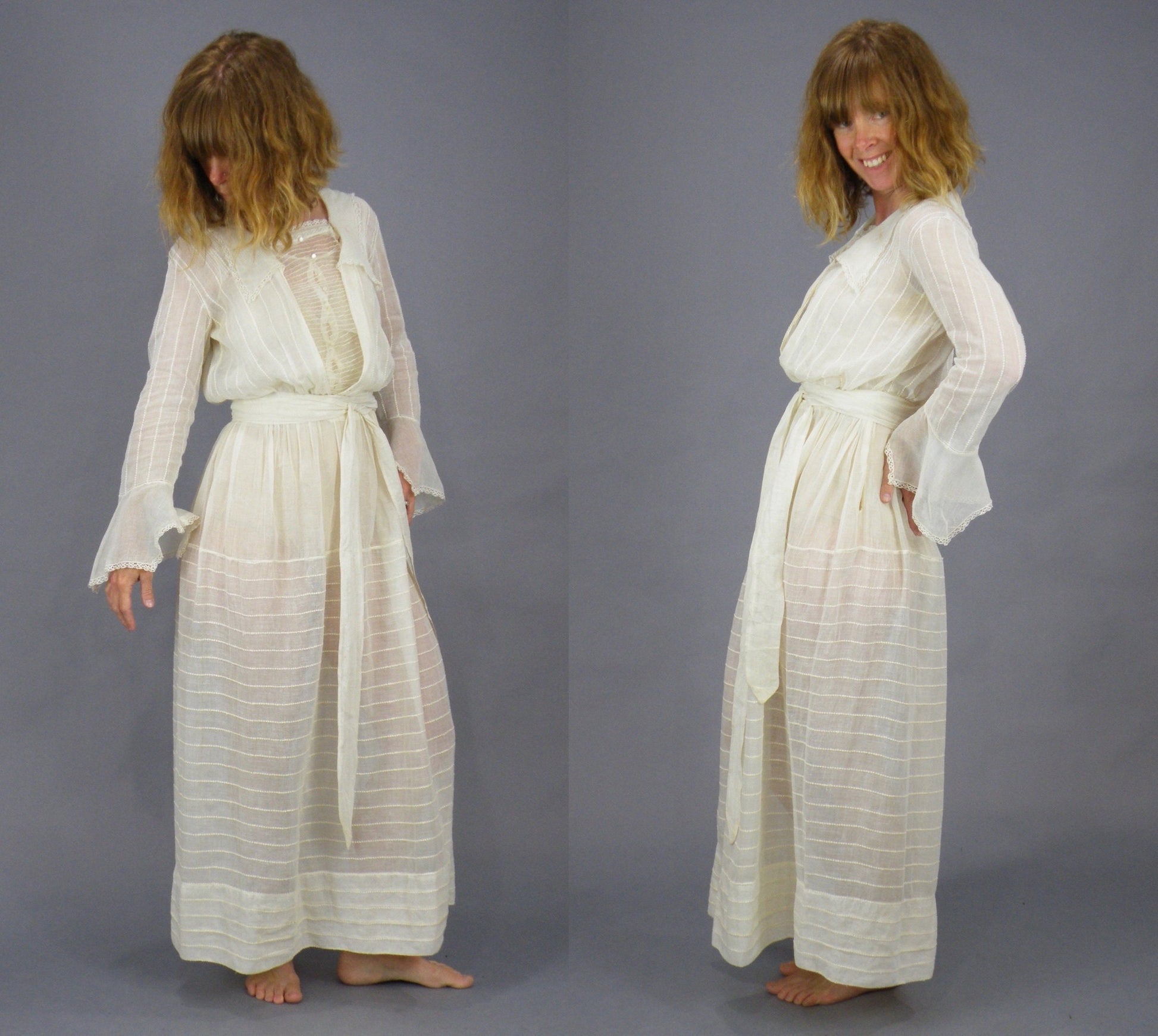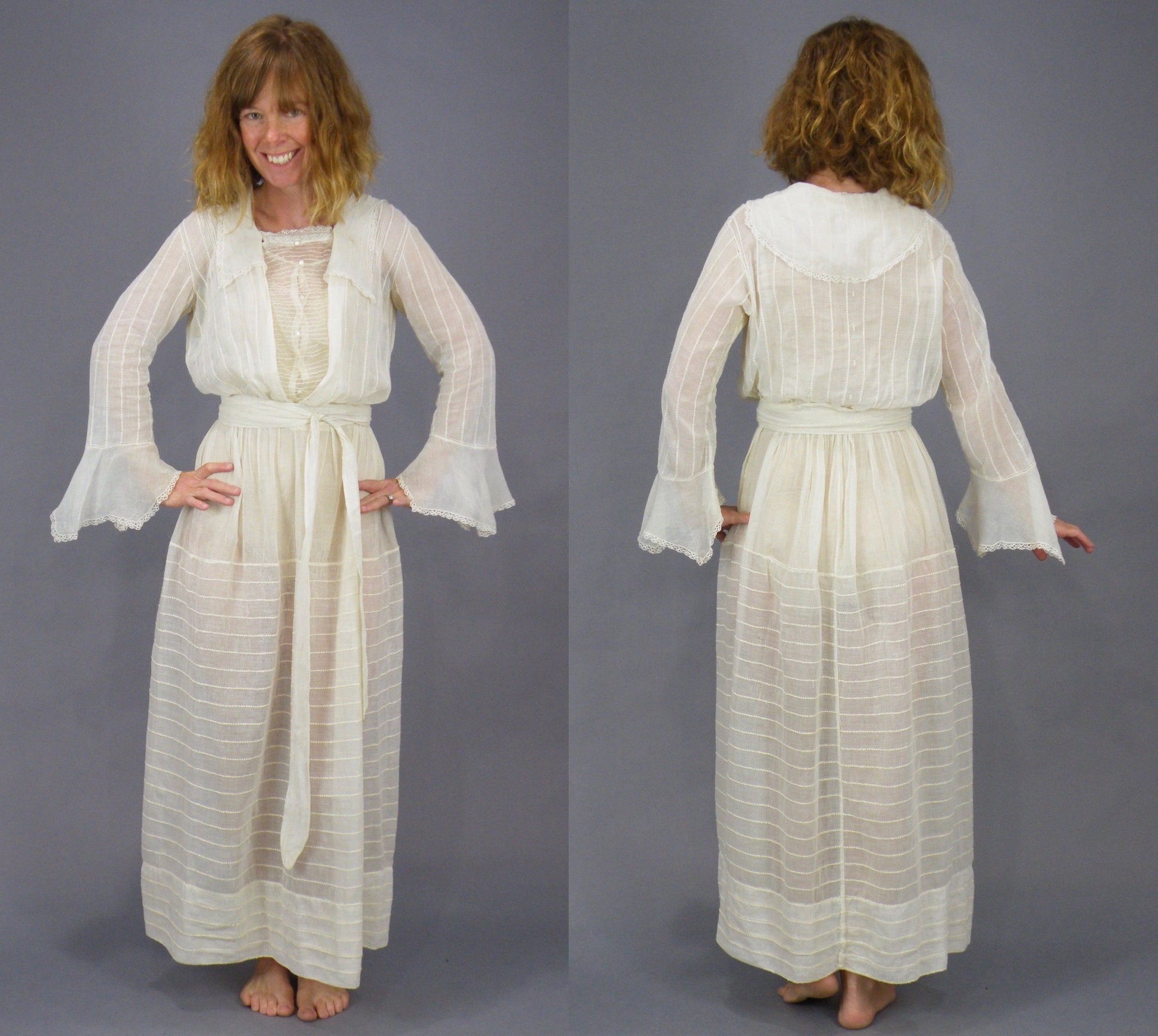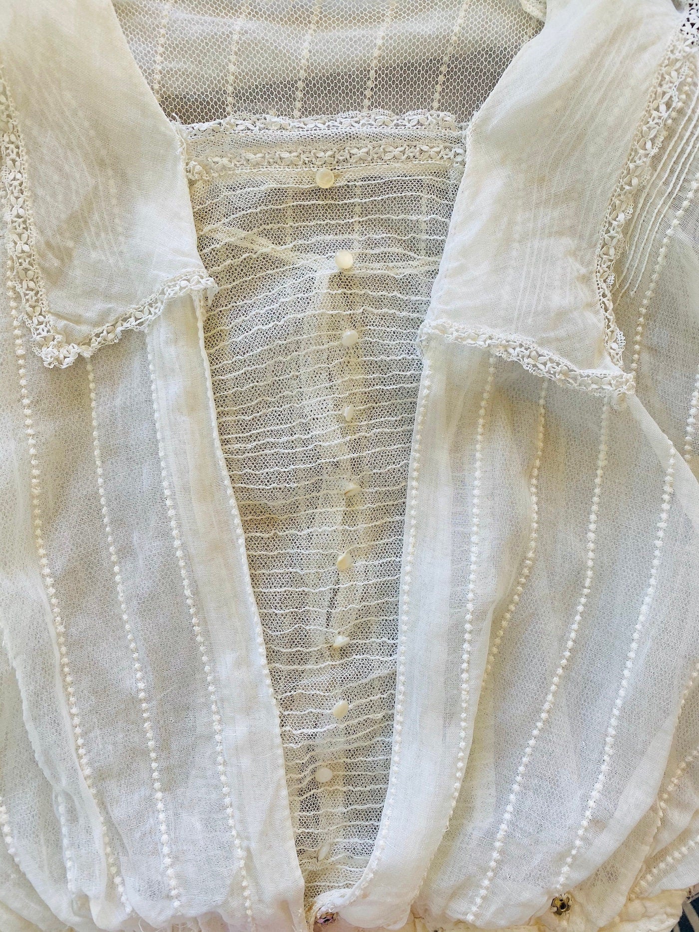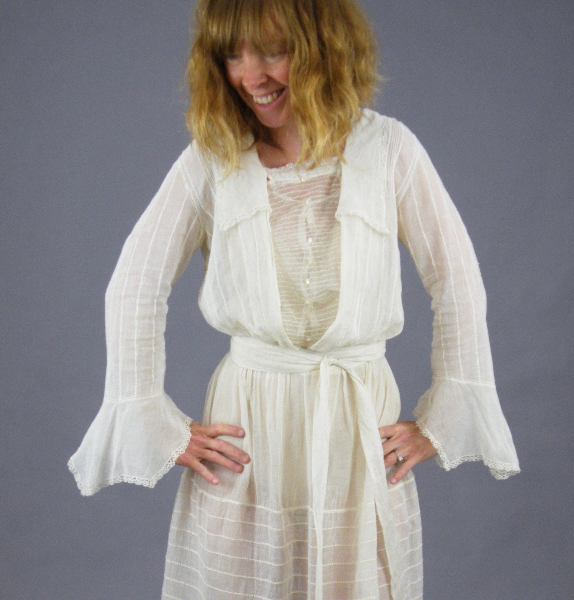 Gorgeous antique 1900s Edwardian sheer cotton and net picnic dress in a soft creamy ivory hue, featuring fabulous bell sleeves. The lightweight cotton is woven with a raised dotted pattern that creates subtle horizontal striping, adding texture and visual interest while maintaining an airy, summery feel.
