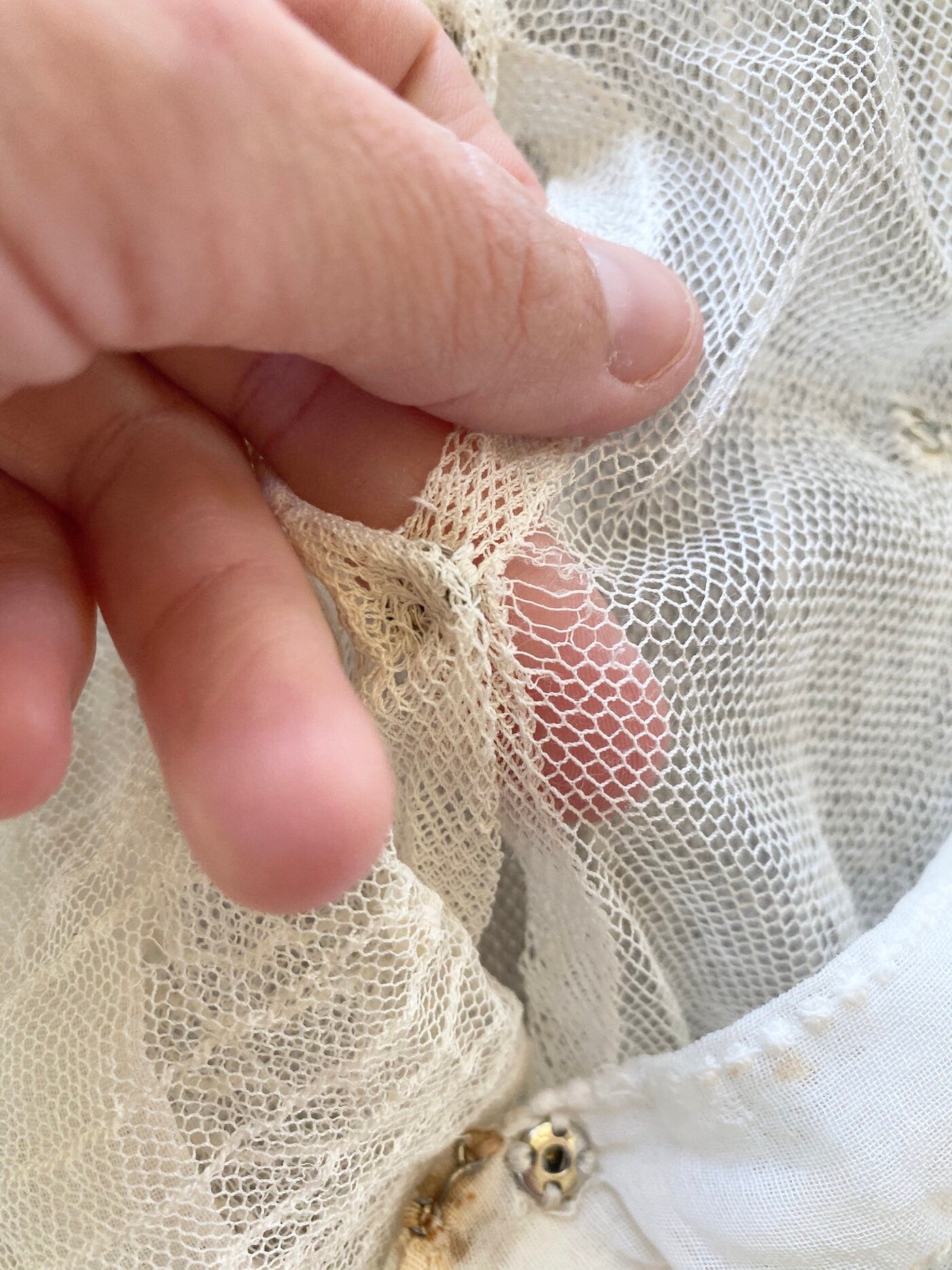 Condition: Near excellent antique condition. Cleaned and ready to wear. Faint markings are present on the left collar. A small hole is present in the innermost net at the bust, along with two tiny specks at the hem. These minor issues do not detract from the overall presentation.