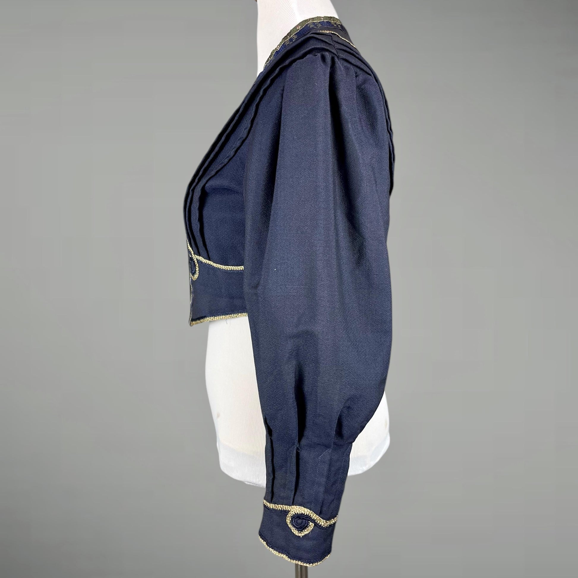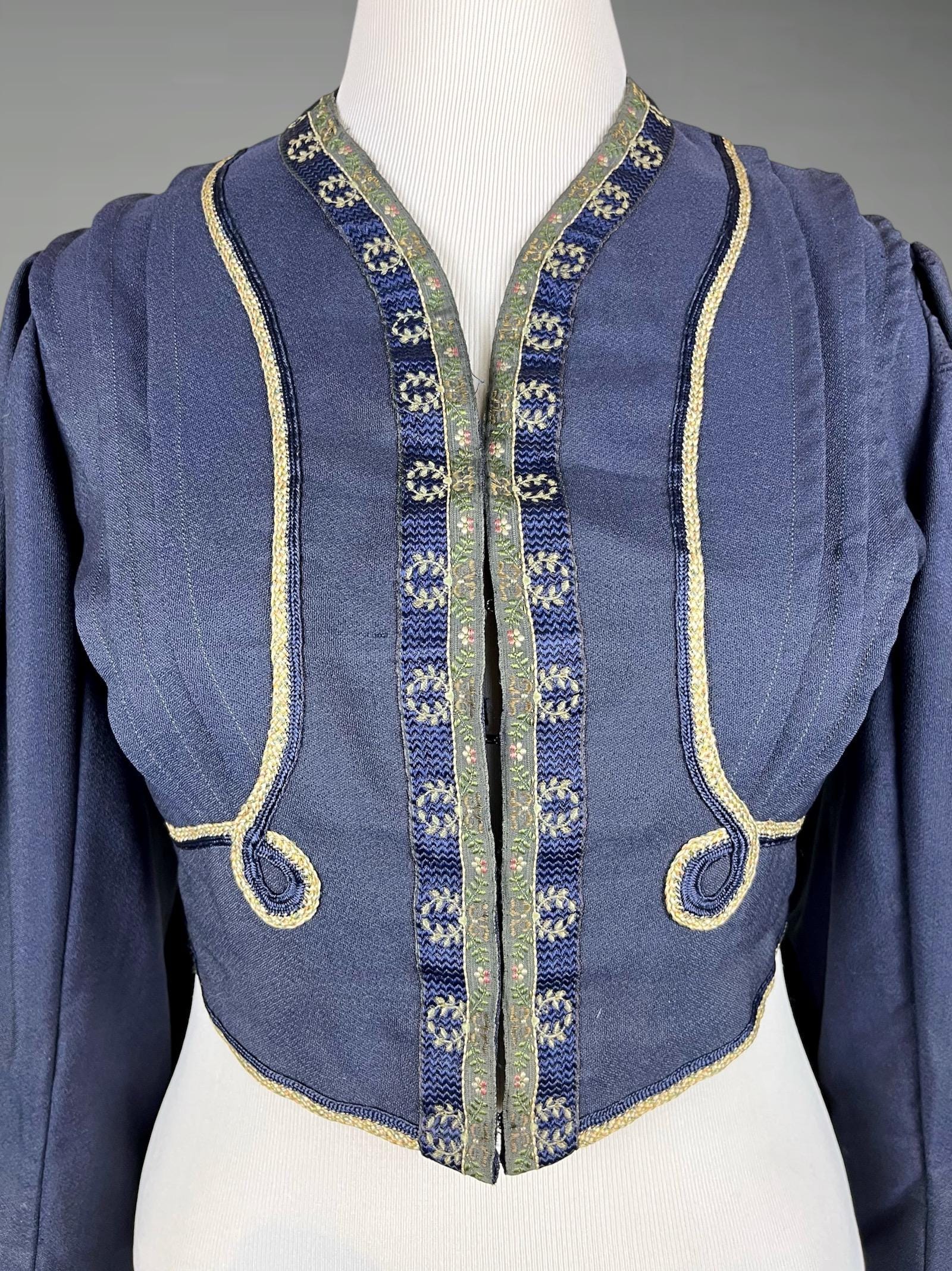 Wonderful antique Edwardian Eton jacket dating to the early 1900s, crafted in a textured silk and wool blend and richly embellished with metallic embroidered silk ribbon and multi-color braided soutache trim. This cropped jacket showcases excellent period tailoring, with tuck seams shaping the front and back bodice and continuing through the sleeve hems for a sharp, architectural silhouette.