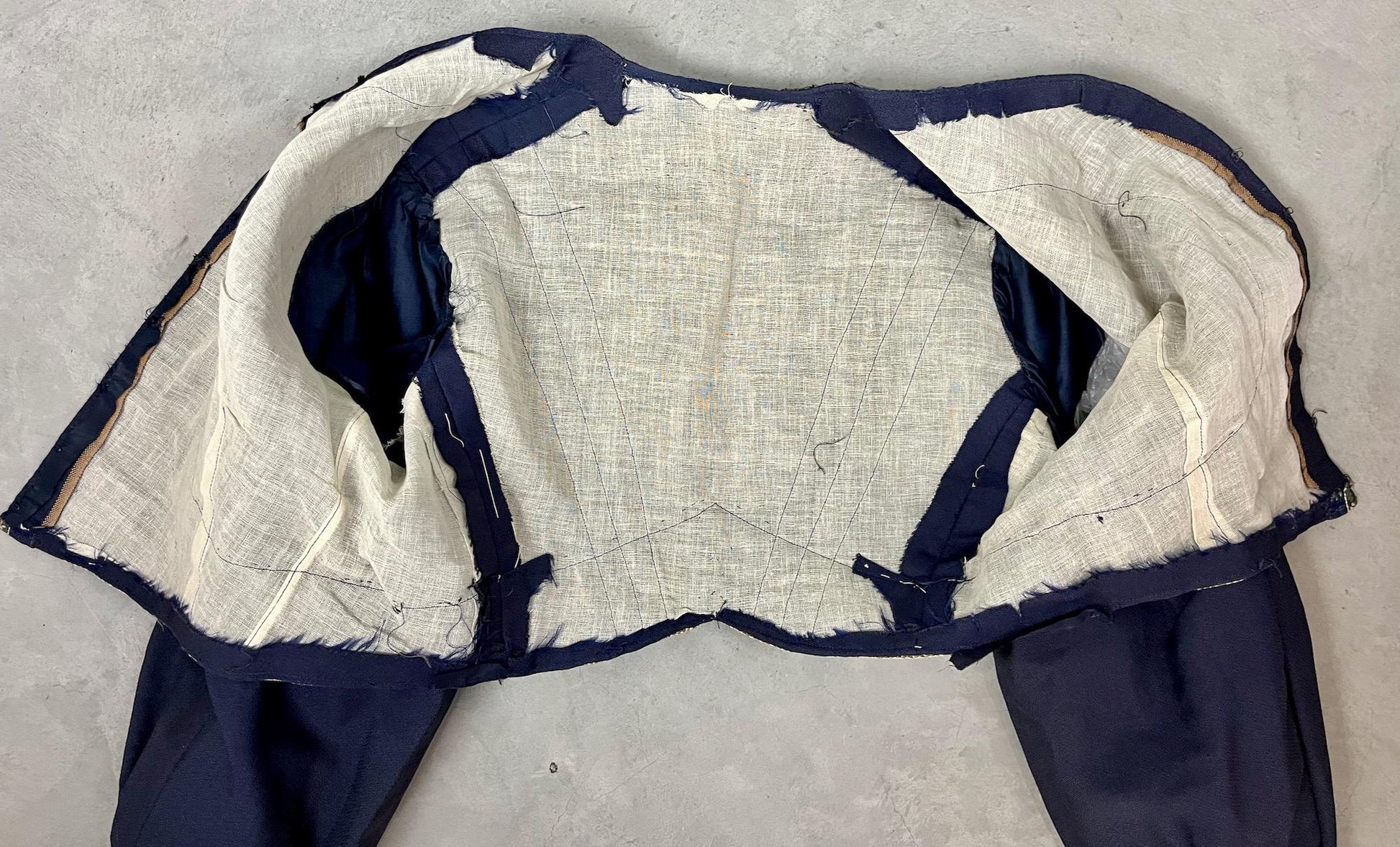 The back is cut slightly shorter than the front in classic Eton style, enhancing the tailored waistline. The jacket fastens down the front with hook and eye closures. The sleeves are fully lined in blue silk, while the body interior retains a sheer woven cotton lining; the original silk body lining is no longer present.