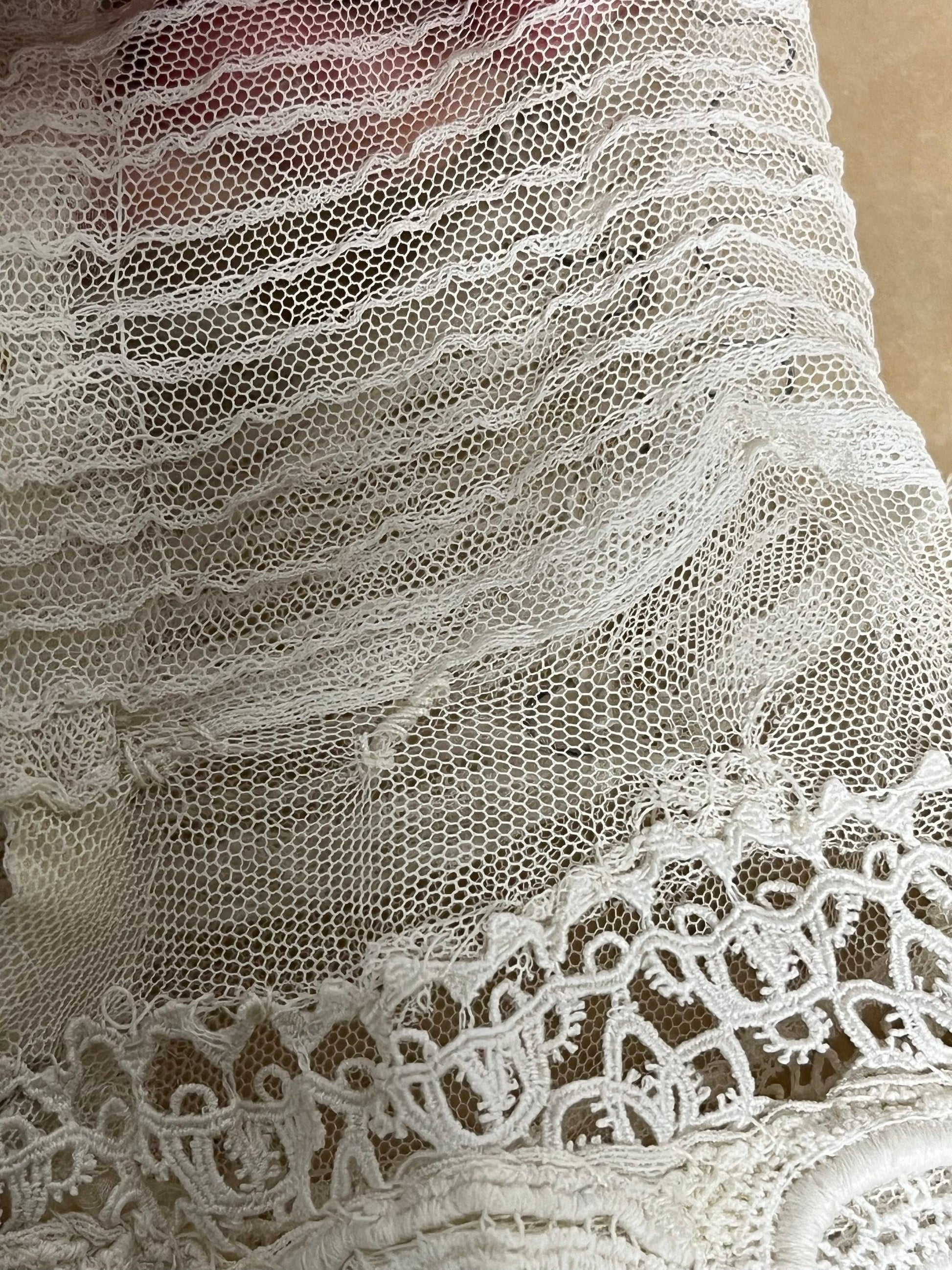 Content: Net lace, mixed lace which I believe includes Schiffli lace