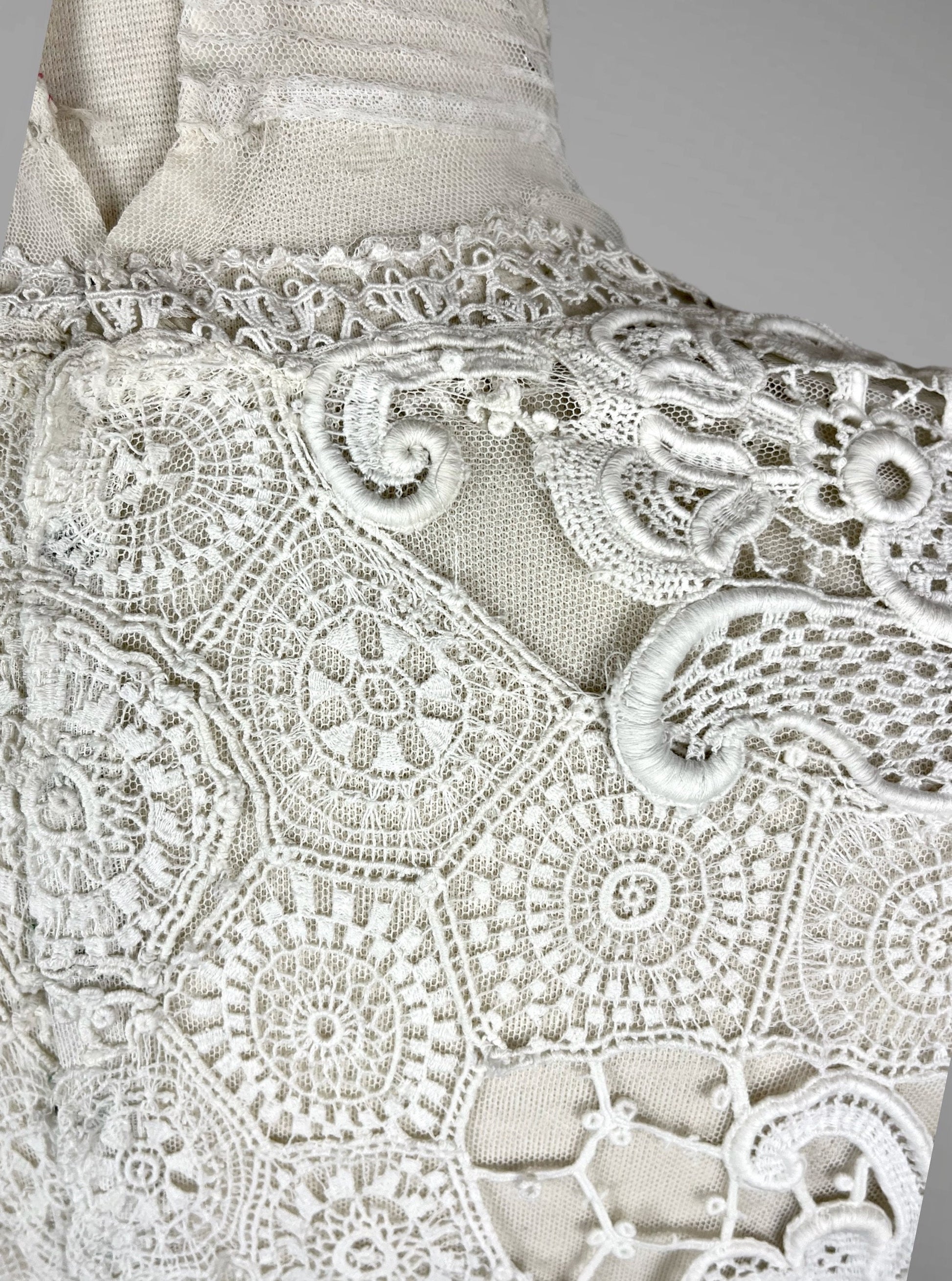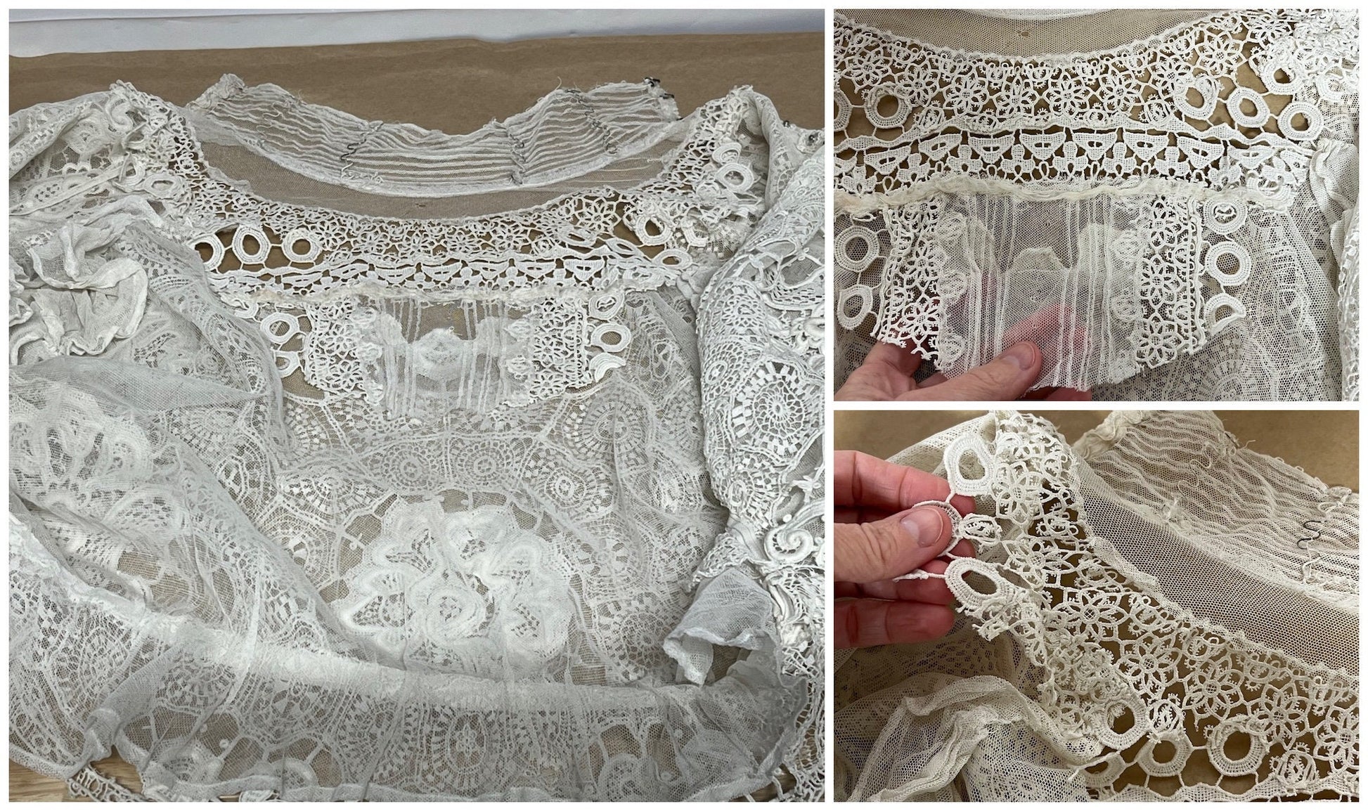 Condition: Very Good / Cleaned / Ready to Wear! A few minor holes to net lace. Very subtle faint yellow to some of the larger lace flowers. *I believe the upper lace panel with high collar was pieced together with the remainder of the lace blouse at some point - which is what the 42 would have been on - either way it looks great together.