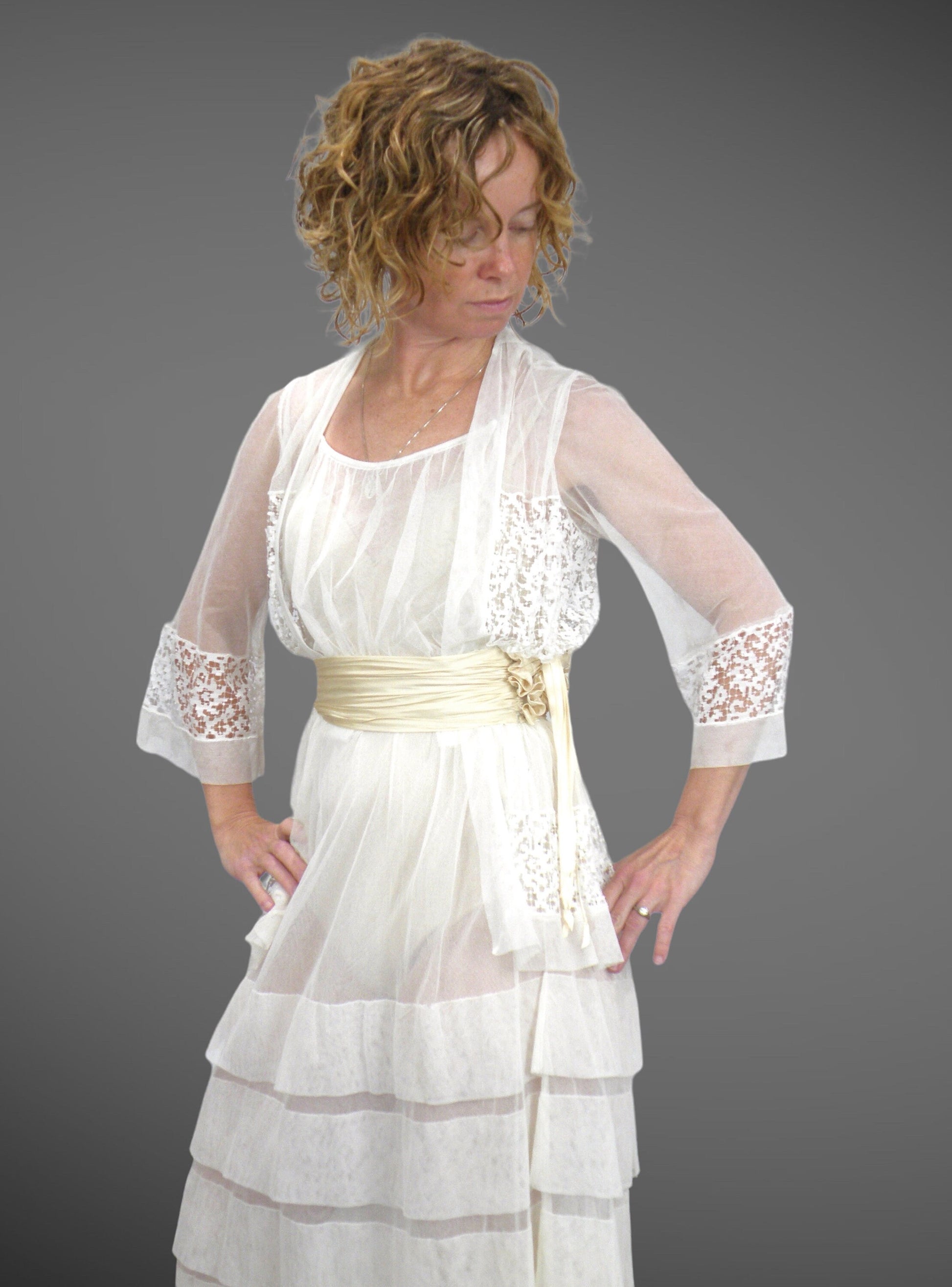 The bodice is thoughtfully constructed with a double-layered design: an inner scoop neckline is overlaid with a split-front outer layer that creates a subtle peek-a-boo effect. Delicate lace insets accent the front bodice and continue across much of the back bodice, as well as along the wide-set three-quarter-length sleeve hems. A softly gathered cream silk cummerbund encircles the waist, finished with a large fabric flower and trailing silk ribbon extensions. The cummerbund snaps into place along the waistline (allowing for slight adjustment) and fastens with hook-and-eye closures. An interior petersham waistband with hook-and-eye closures provides additional structure and support.