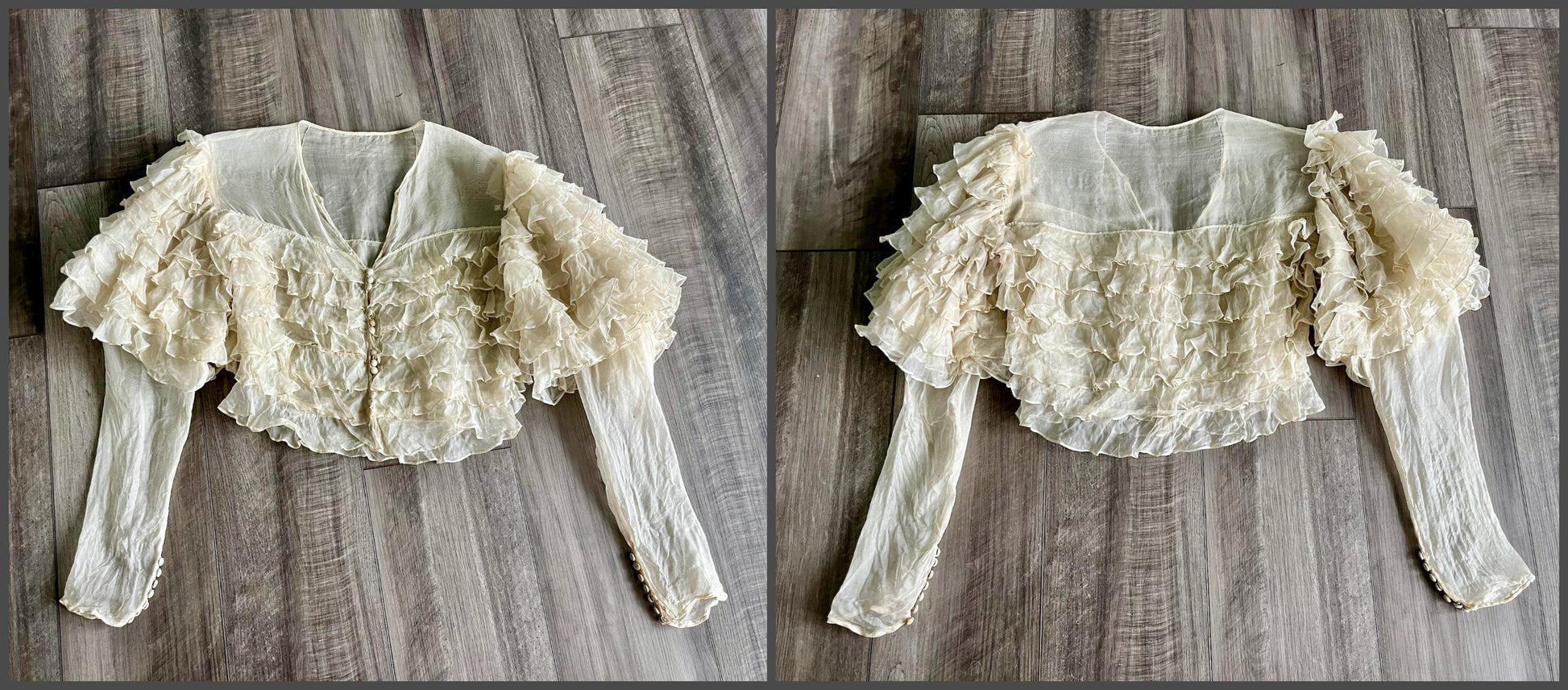 Vintage 1930s Sheer Silk Blouse with Leg-of-Mutton Sleeves & Tiered Ruffles, XS–Small