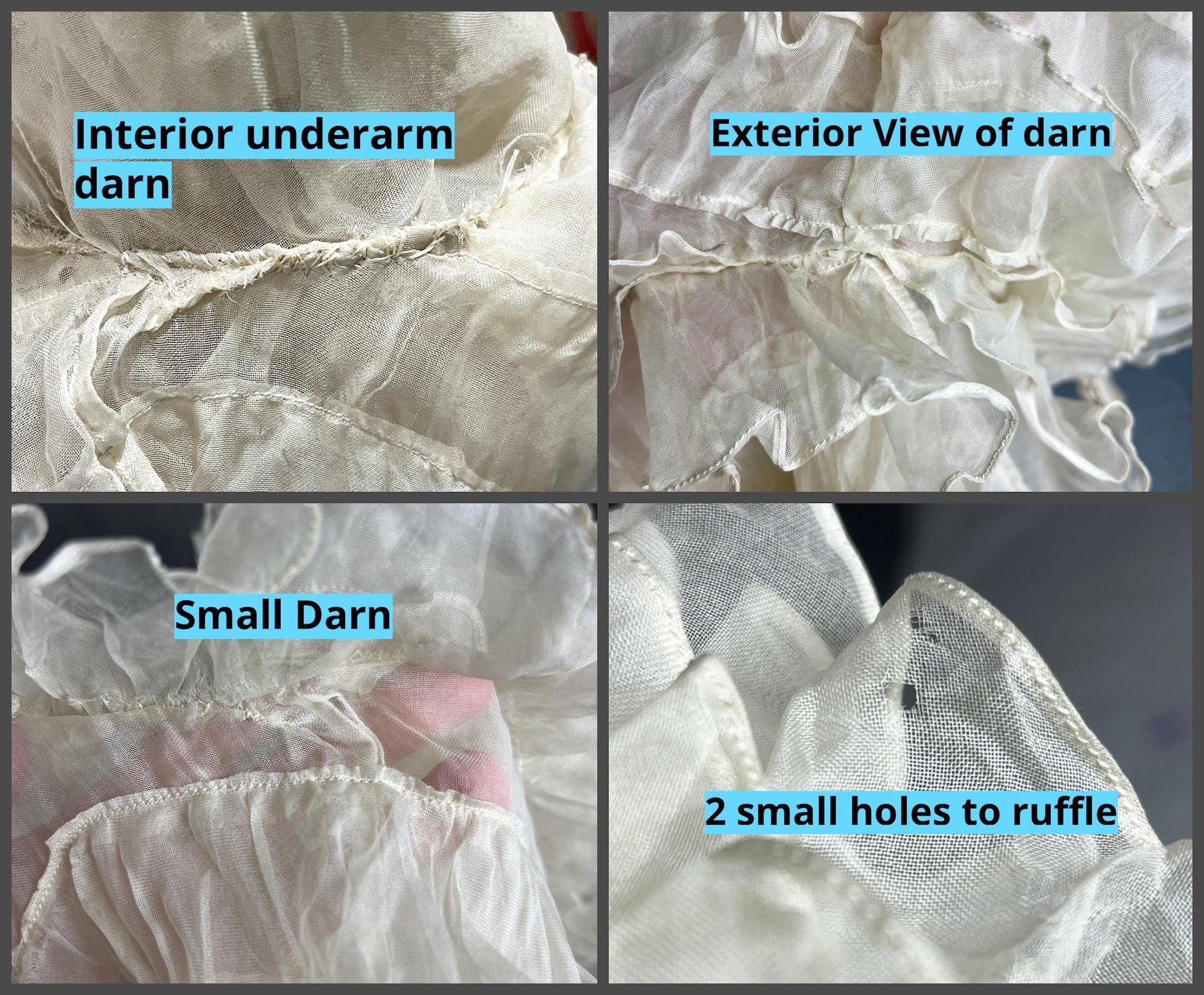 Condition: Fair+ vintage condition. Wear is present adjacent to the loop closure at the bust and at both shoulder areas, including small areas of wear and tear. Darning is present at the shoulder, sleeve hem, and underarm. Additional wear and small holes are present at the tapered sleeve and scattered throughout the sleeves and ruffles. Light seam stress and a minor wear mark are visible at the upper back, along with minor wear to one covered button. Please enlarge photos for detail or feel free to email for additional images.