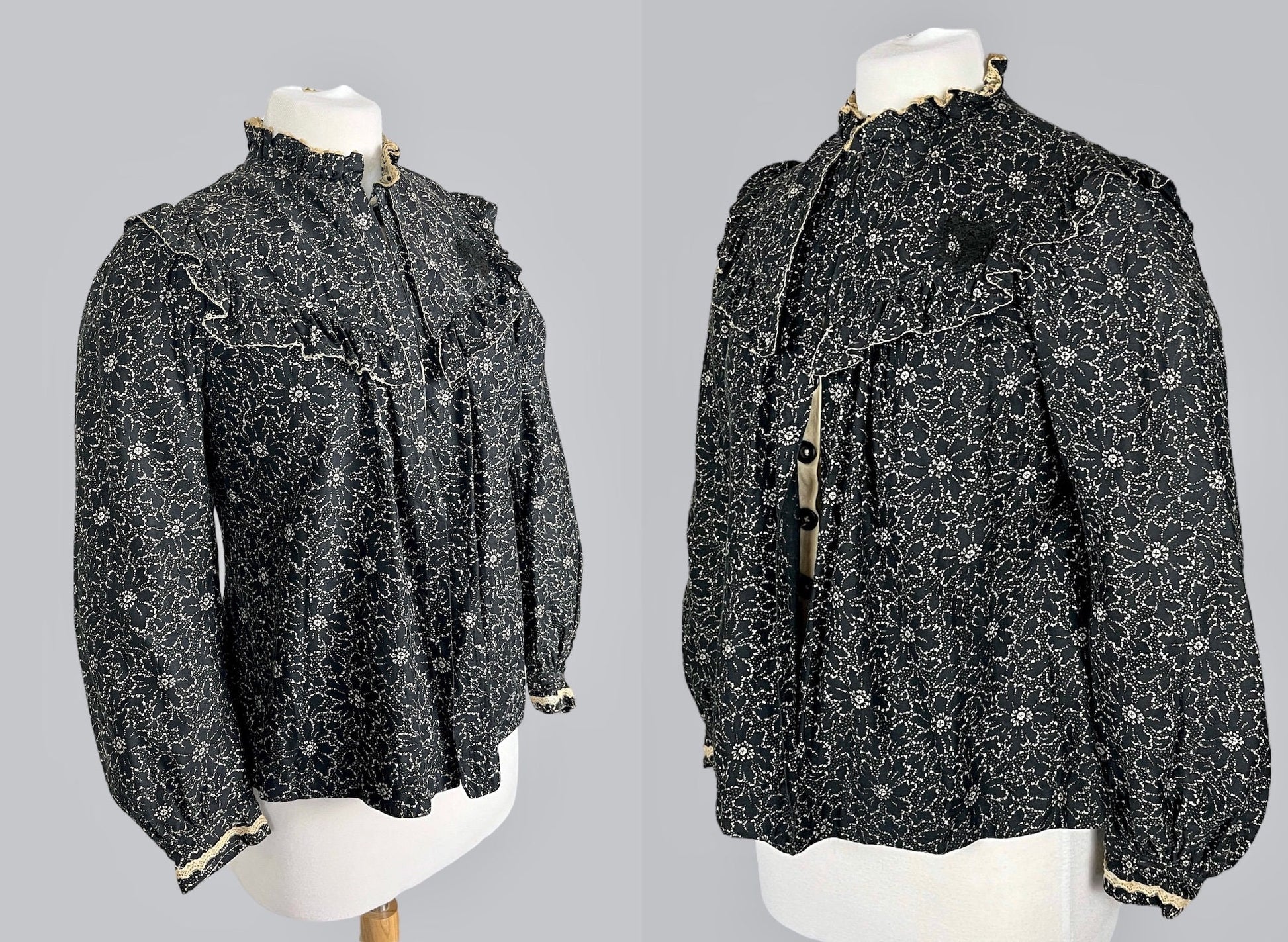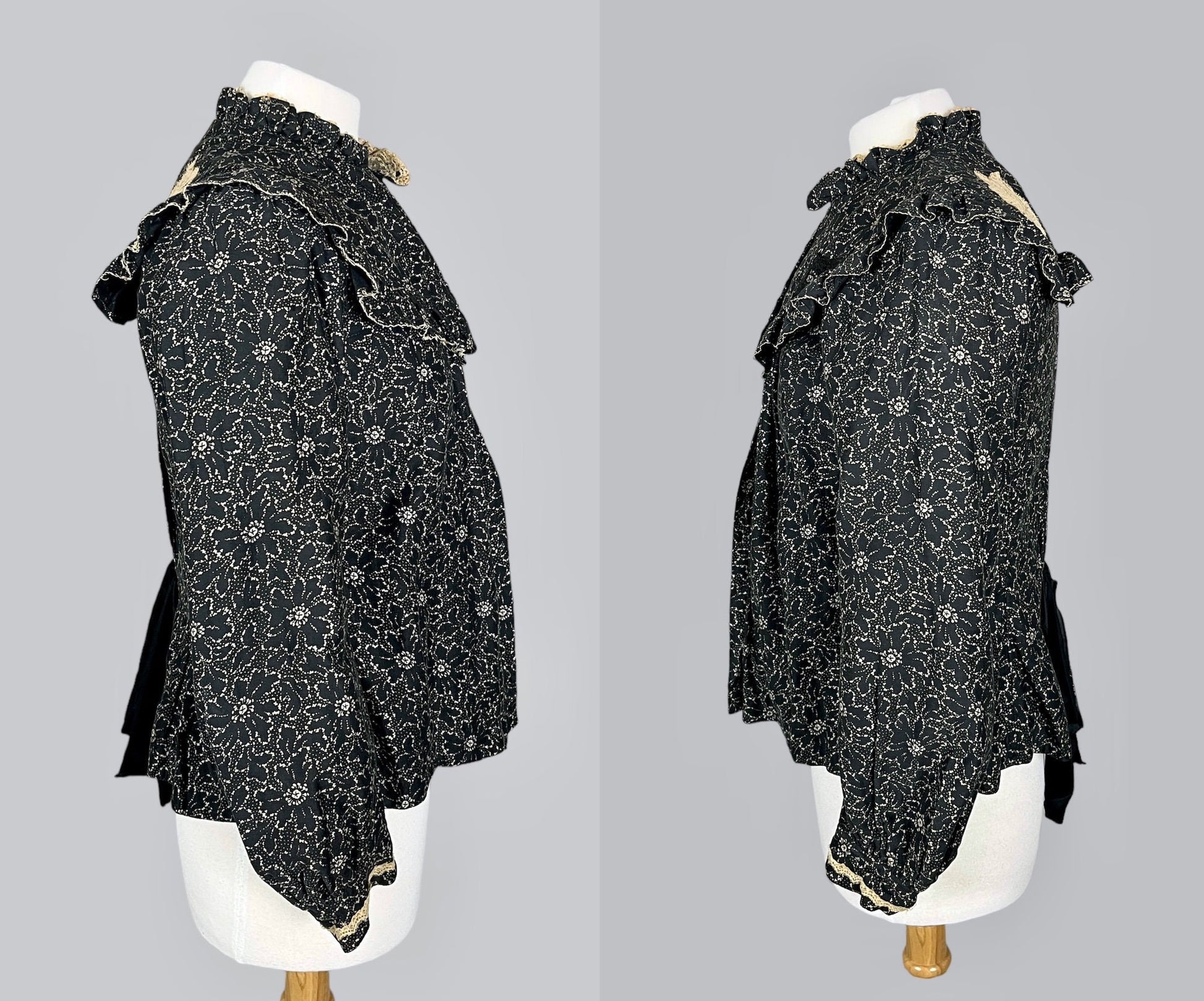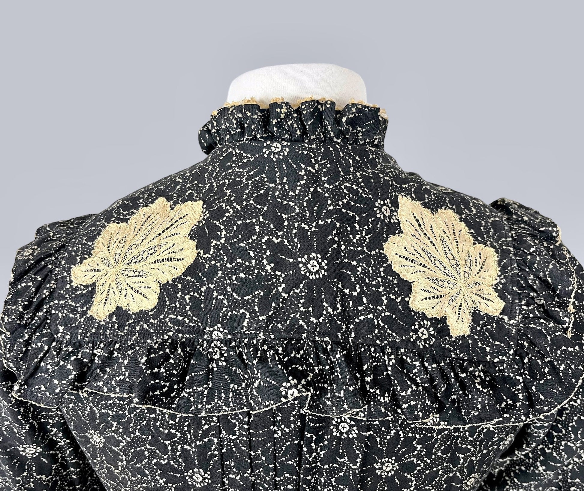 The neckline is especially lovely, styled with a gathered standing lace-trimmed collar and a dramatic shawl collar framed with a ruffled edge. Long sleeves are lightly gathered for soft volume, while the front remains loose and open, creating an easy, graceful drape. At the back, long center gathers extend from the nape to the waist. A large silk ribbon tie bow accents the center back waist, finishing the blouse with a romantic touch. Both machine and hand sewing are present.