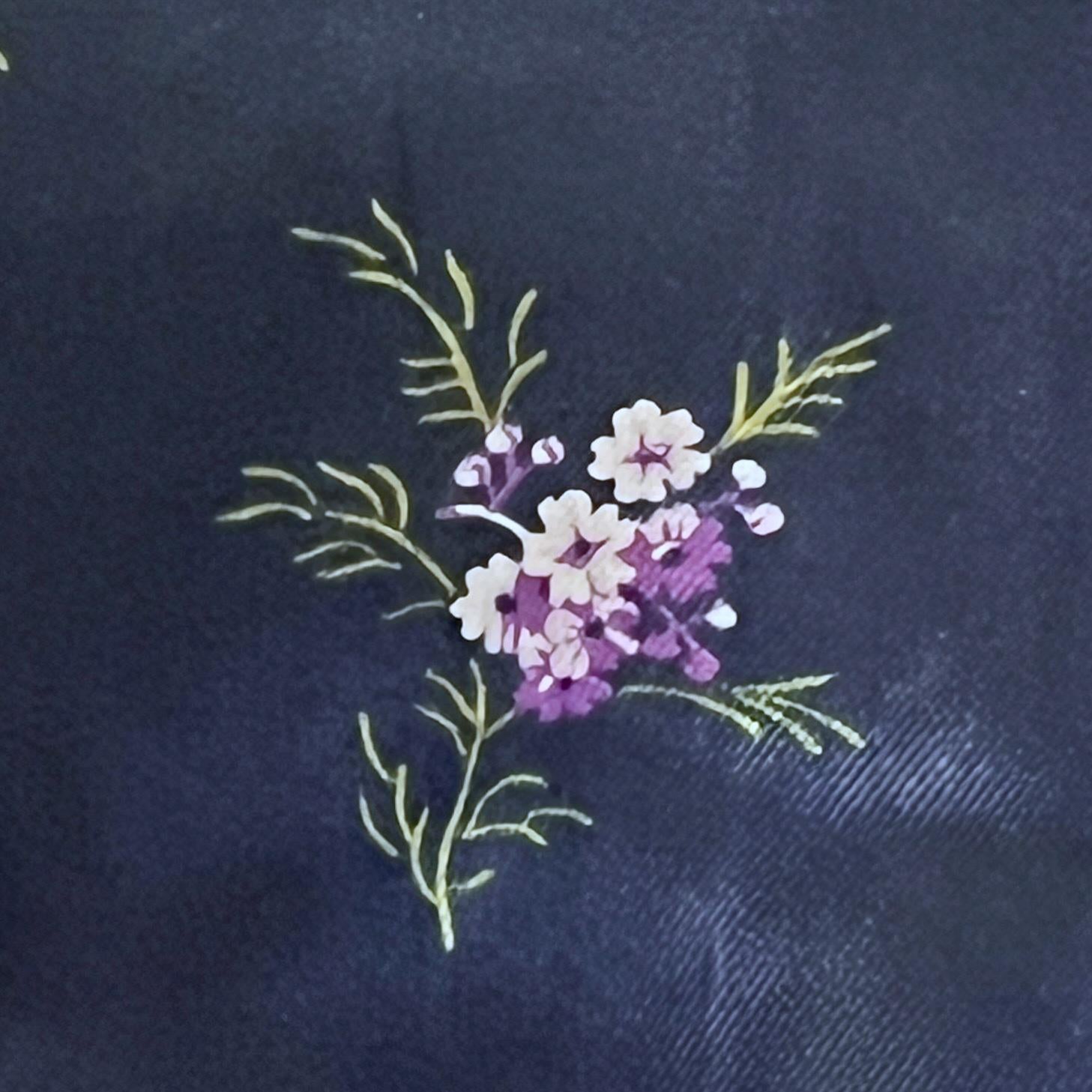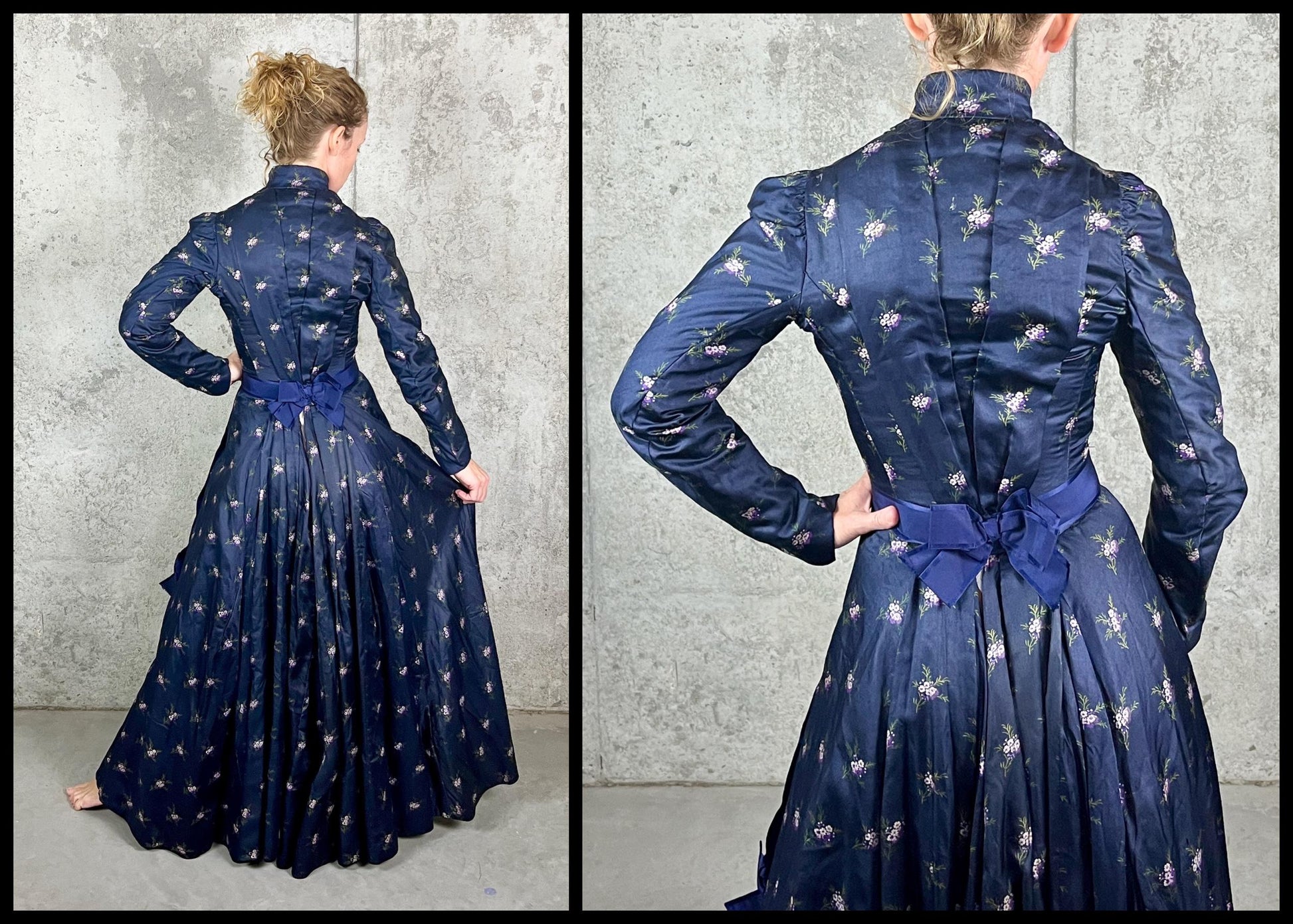 Museum-quality antique late Victorian to early Edwardian two-piece dress set, dating to circa 1898–1902. Crafted from luxurious deep midnight blue silk patterned with delicate woven floral sprigs in soft pink and lavender, the fabric has a fluid, luminous quality that drapes beautifully with movement. This exceptional ensemble is a rare and finely constructed example of transitional Gibson Girl–era dressmaking.