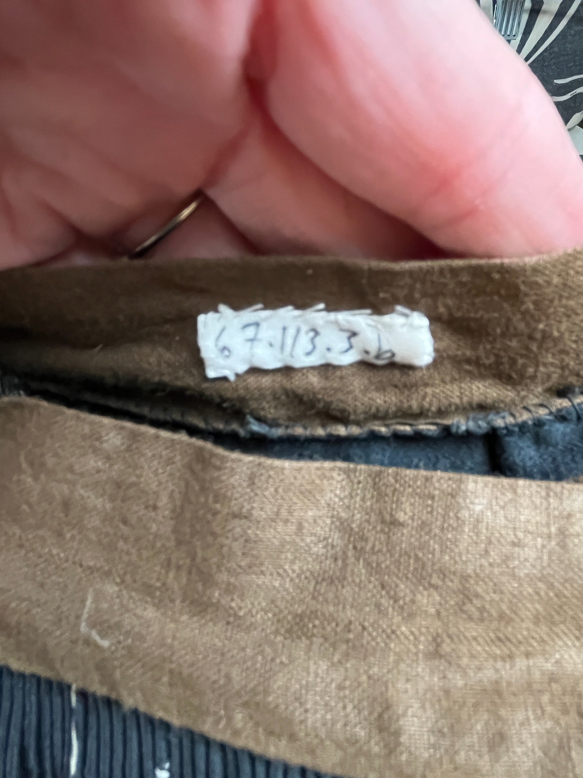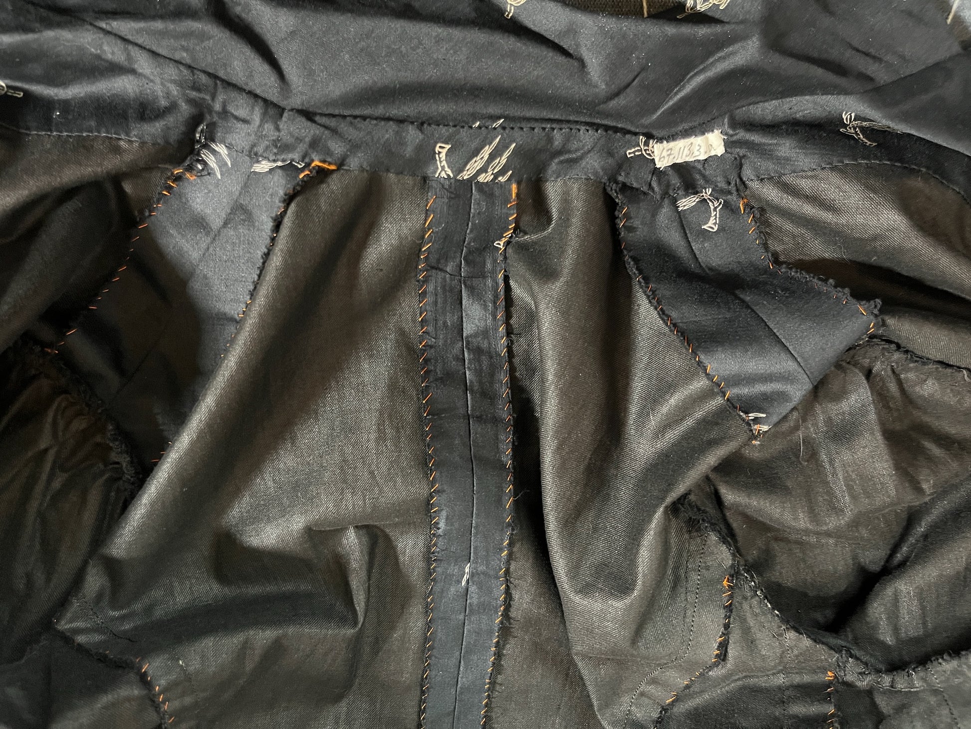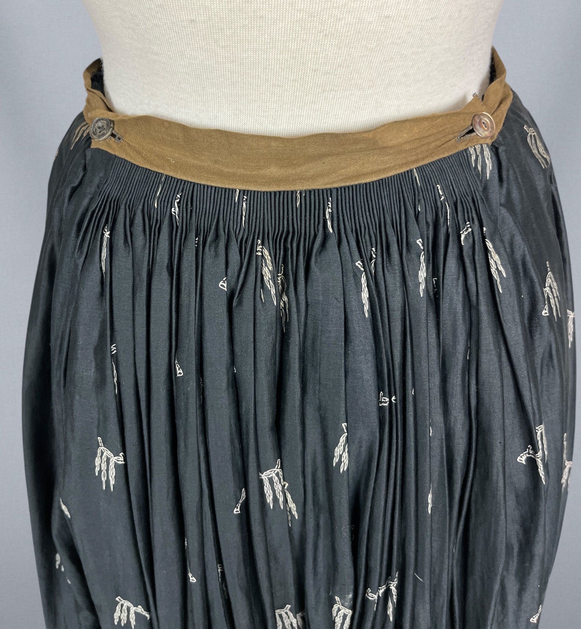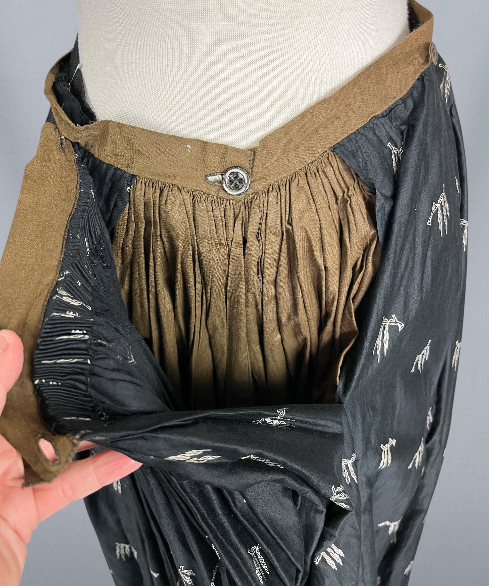 The coordinating skirt falls from a structured waistband into a full, fluid sweep with cartridge pleating at the back waist, finished with an original interior brown cotton waistband and placket closure. The bodice interior is lined in black glazed cotton with excellent seam-work and a small internal hook-and-eye placket. A striking, wearable example of late-1890s Victorian dressmaking with beautiful presence on the form.