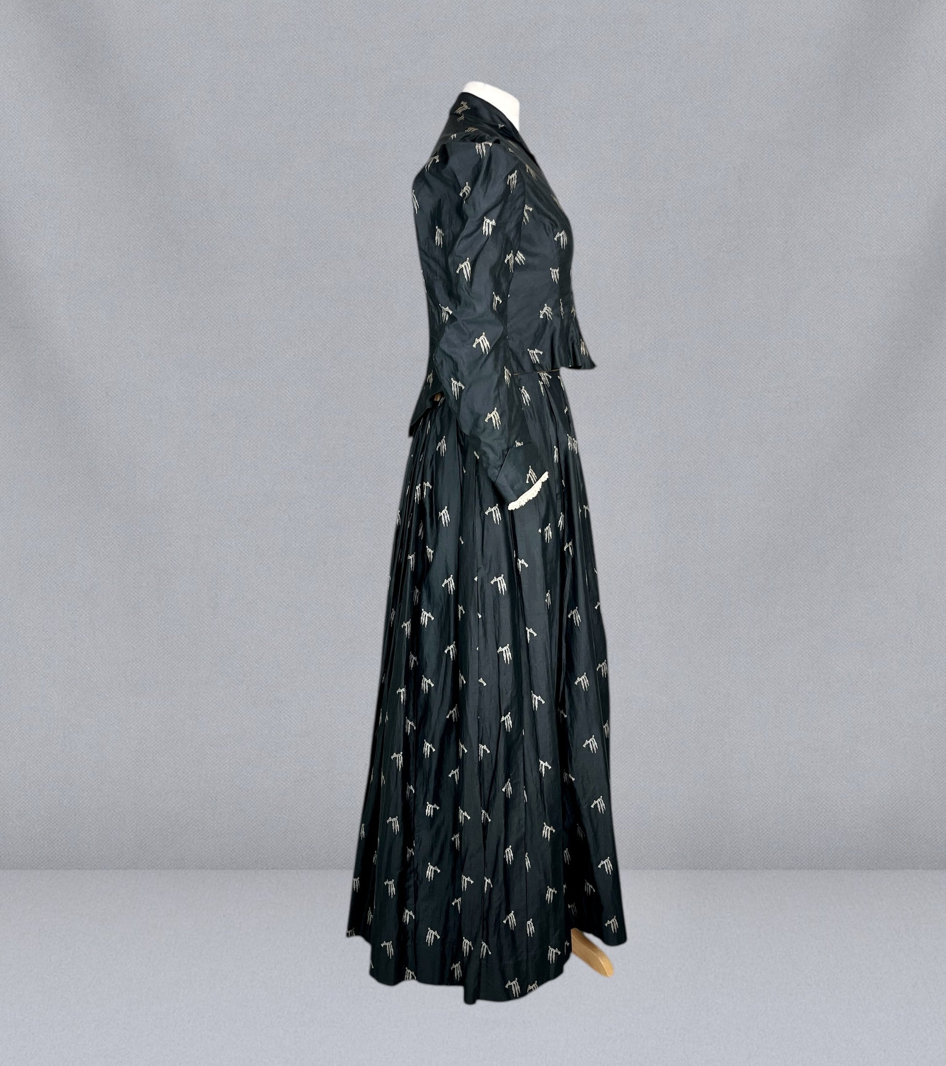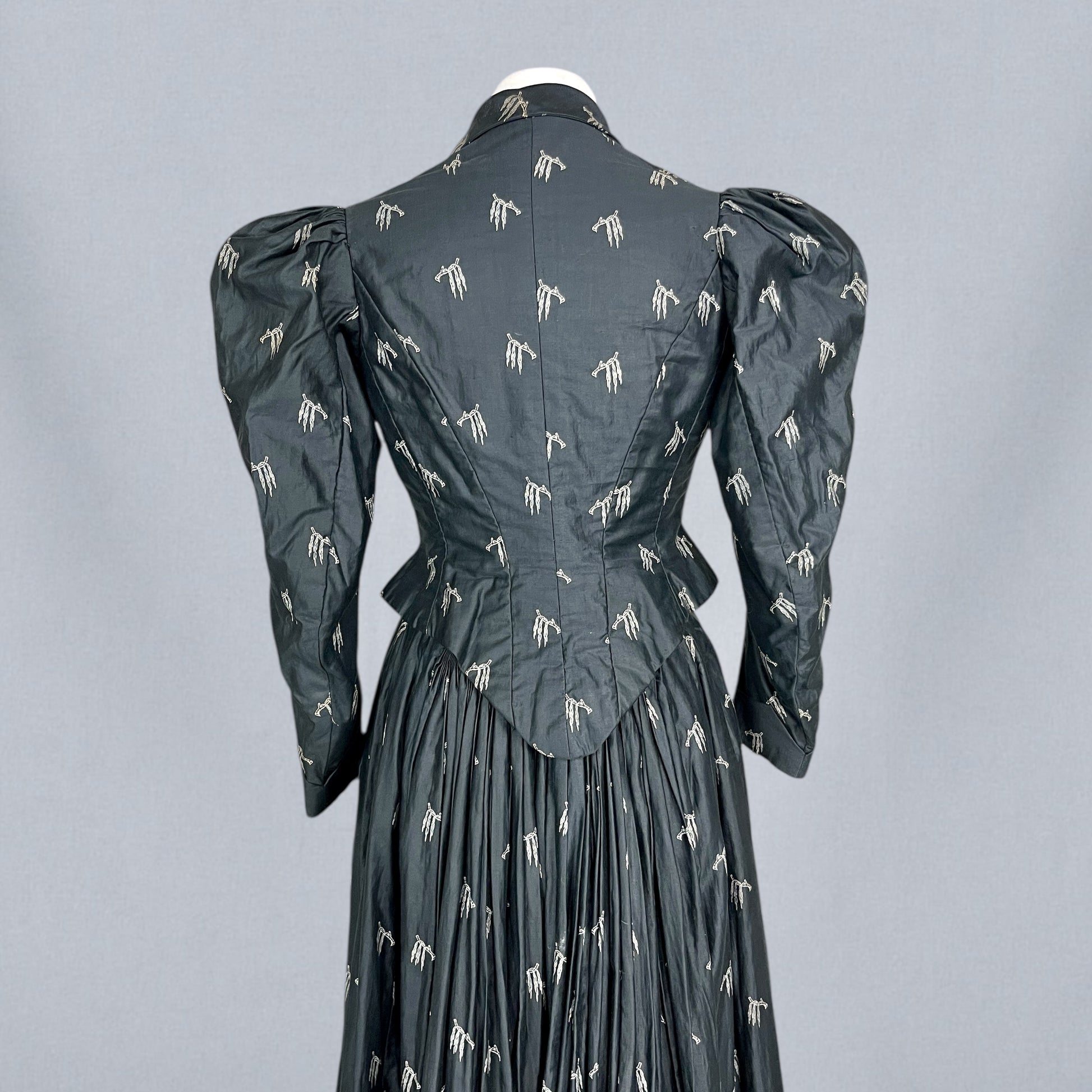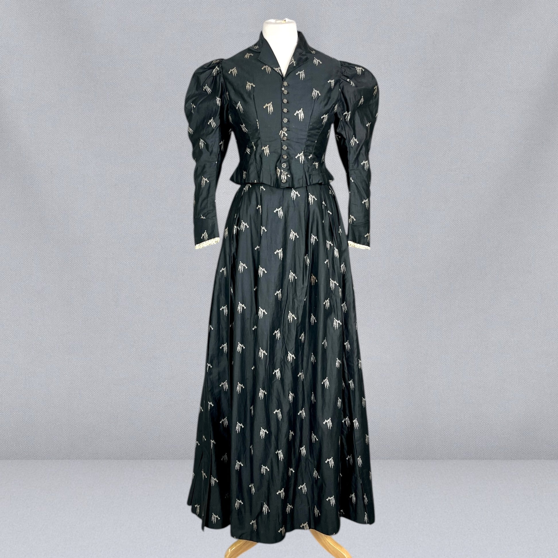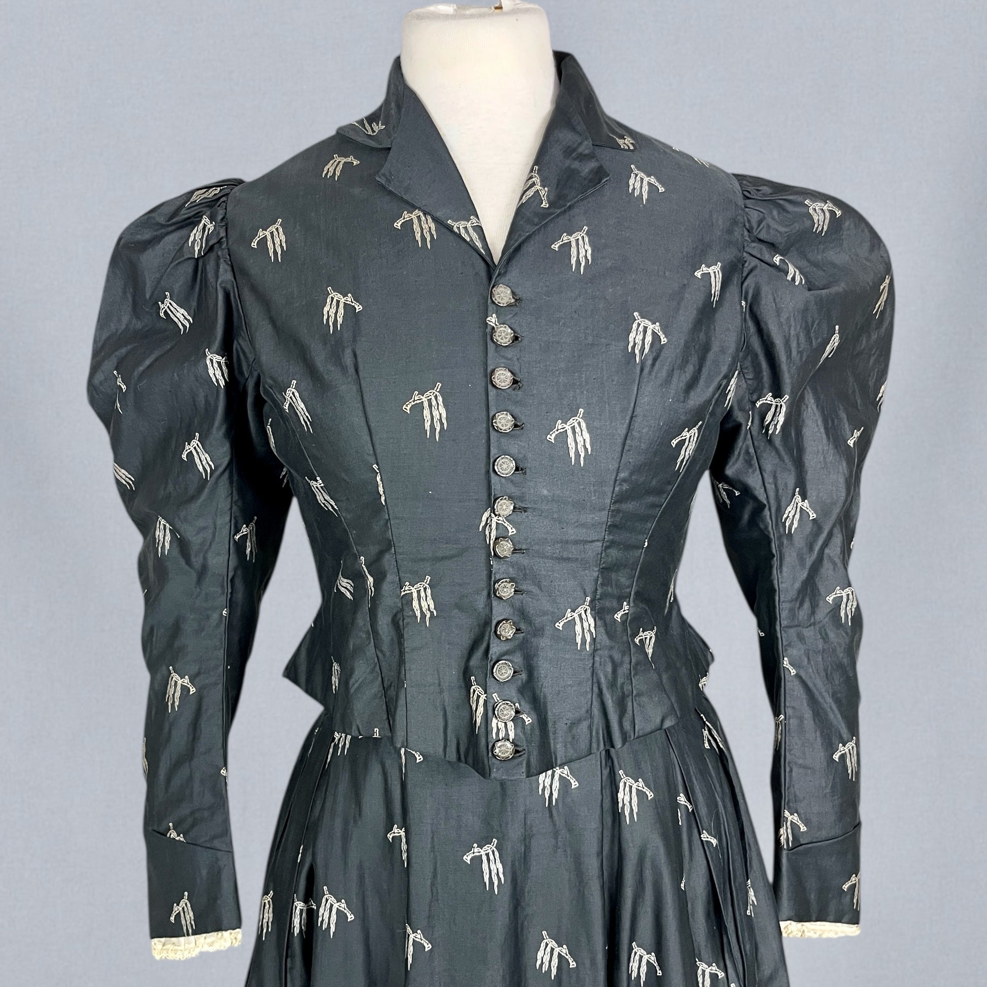 Exceptional antique late Victorian two-piece dress set dating to the 1890s, beautifully crafted in black polished printed cotton with a subtle sheen. The fitted bodice is expertly tailored with a high neckline, sharply nipped waist, and dramatic leg-of-mutton sleeves, creating the bold, sculptural silhouette that defines late-19th-century women’s fashion. The fabric features a delicate repeating of a stylized botanical branch motif resembling willow or drooping tree branches.