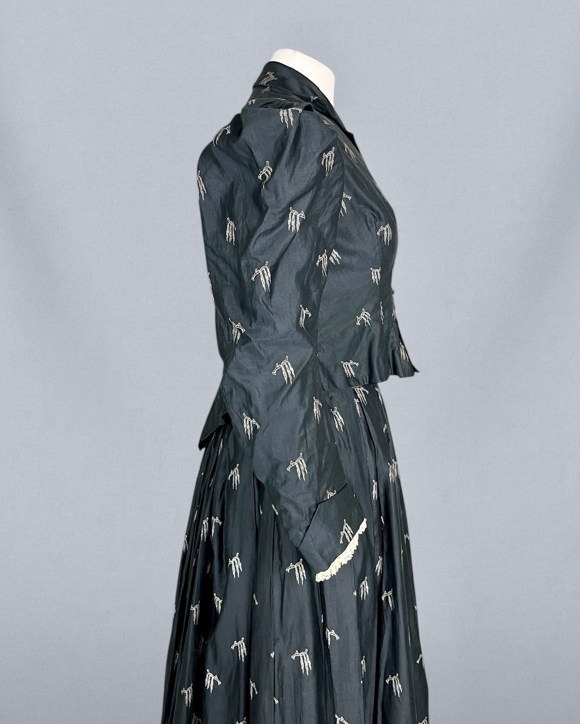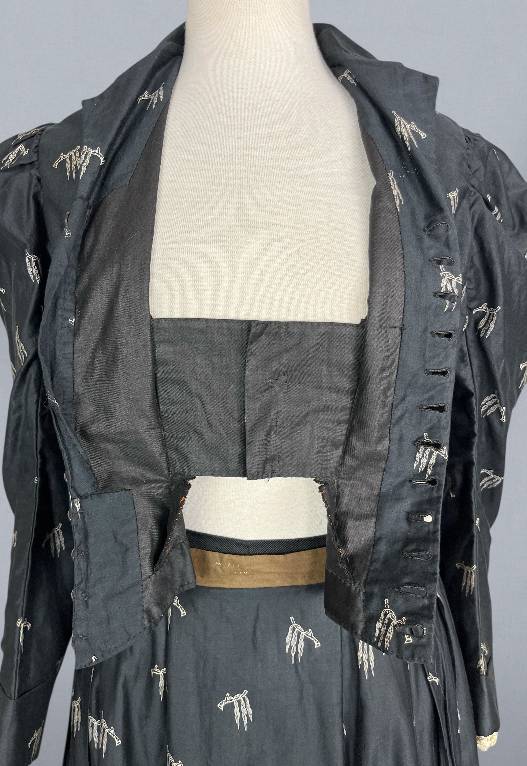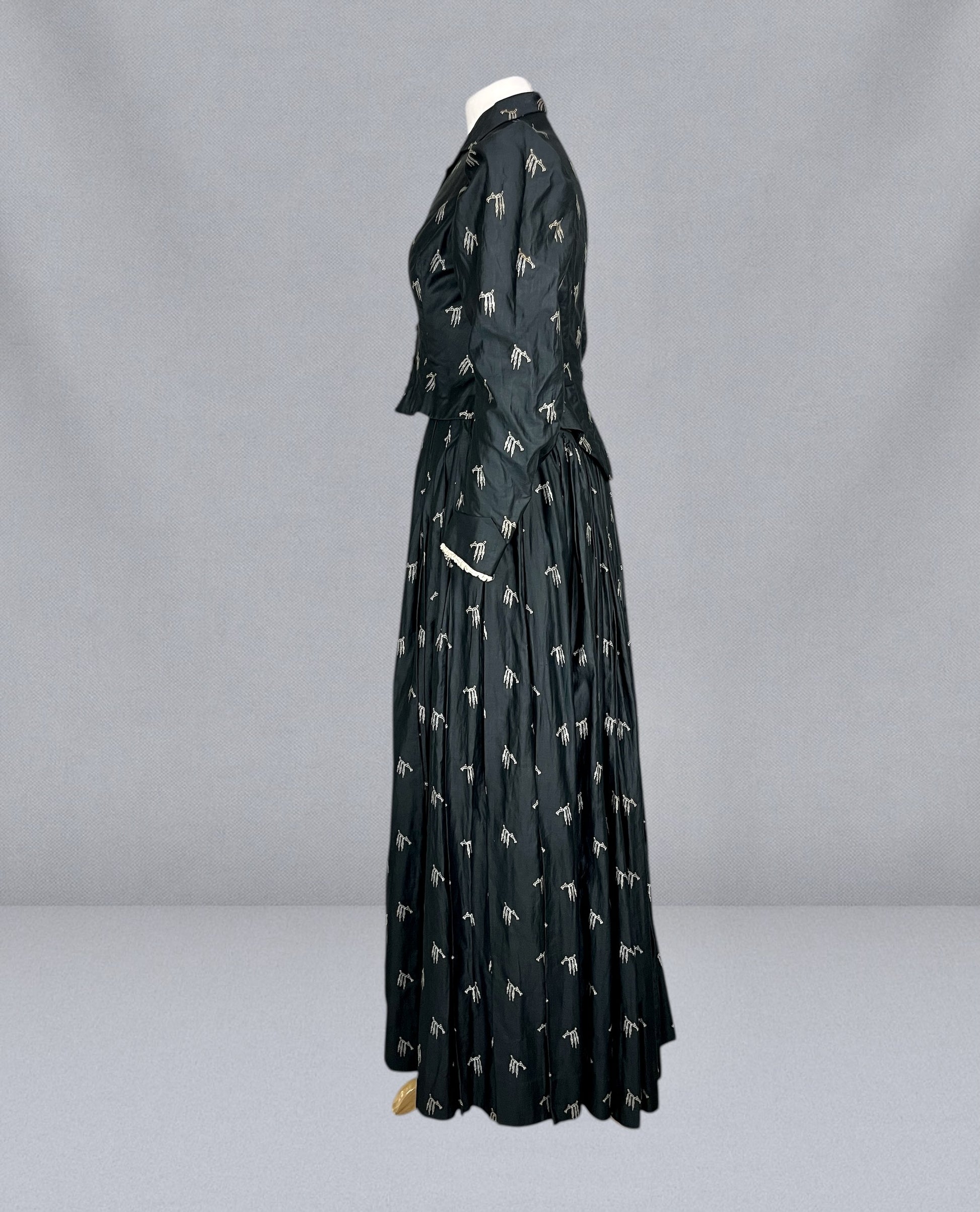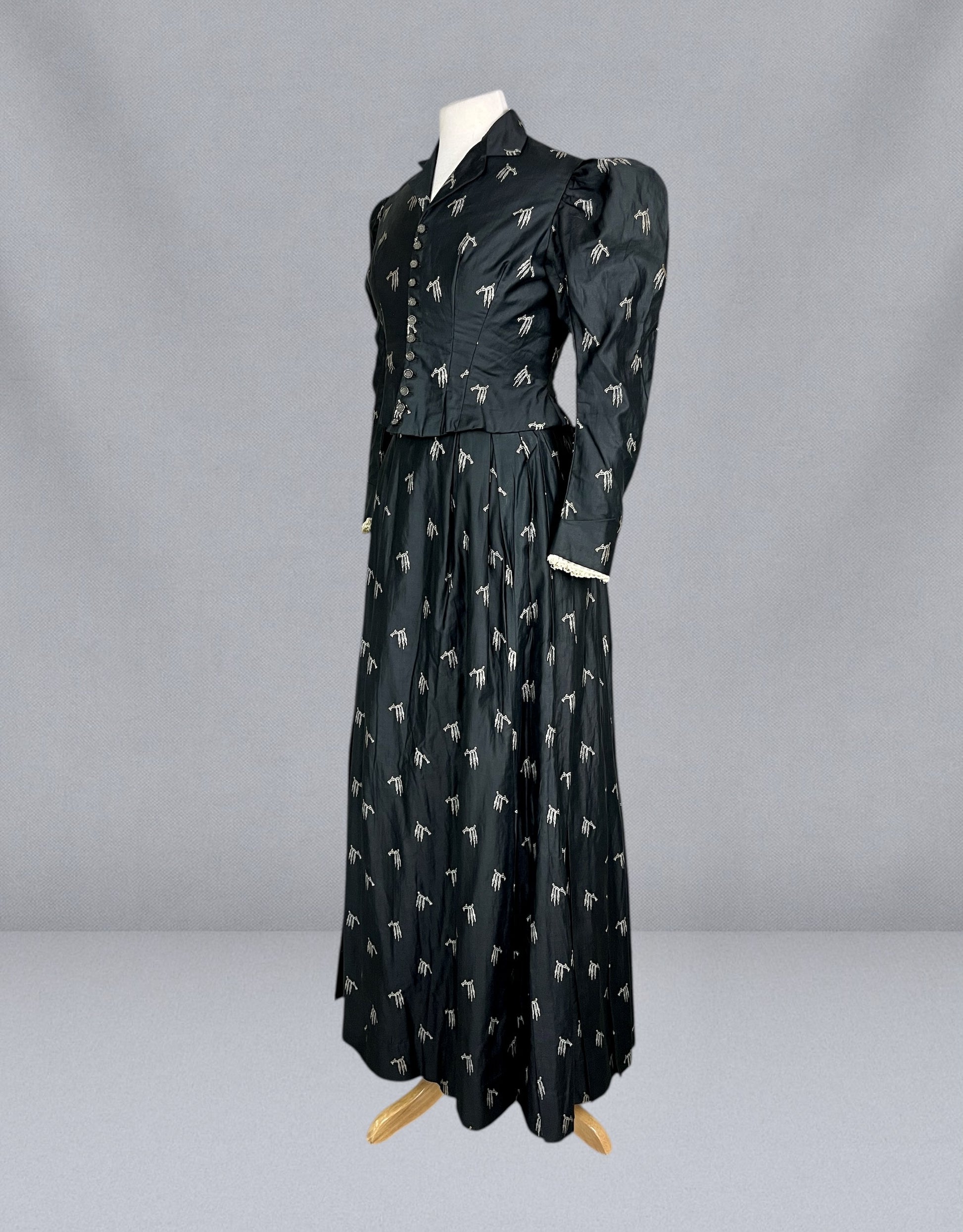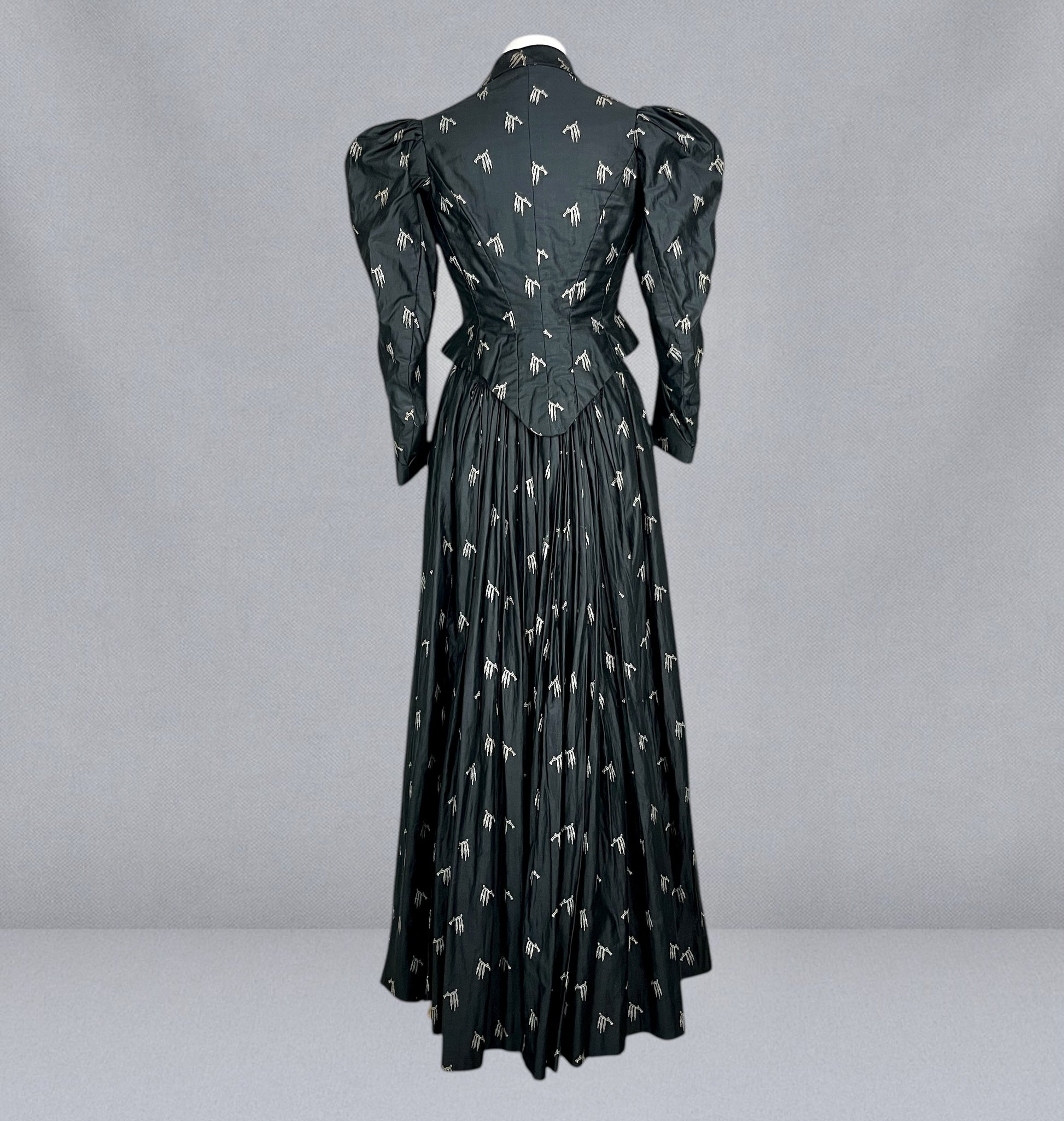 Exceptional antique late Victorian two-piece dress set dating to the 1890s, beautifully crafted in black polished printed cotton with a subtle sheen. The fitted bodice is expertly tailored with a high neckline, sharply nipped waist, and dramatic leg-of-mutton sleeves, creating the bold, sculptural silhouette that defines late-19th-century women’s fashion. The fabric features a delicate repeating of a stylized botanical branch motif resembling willow or drooping tree branches.