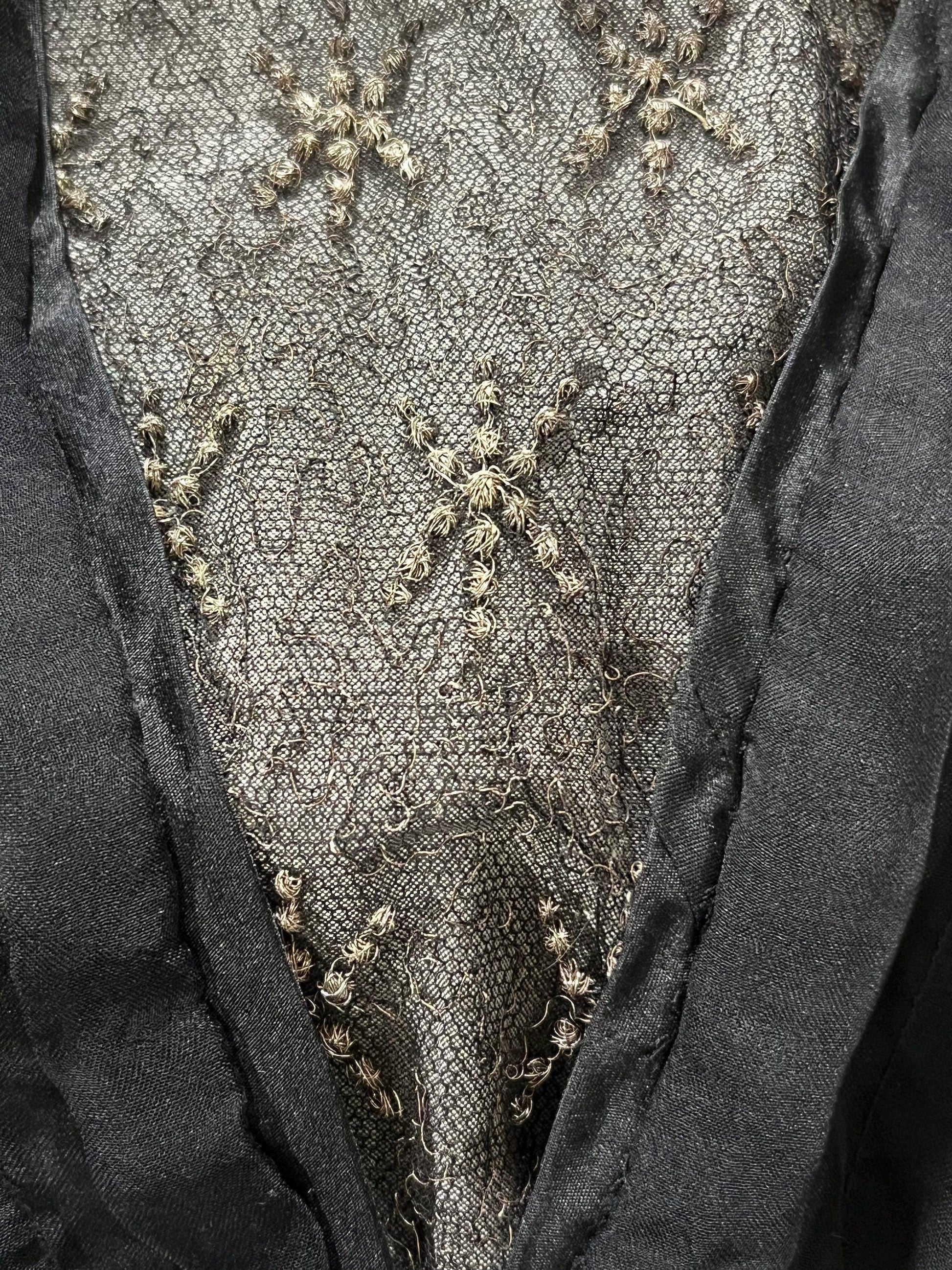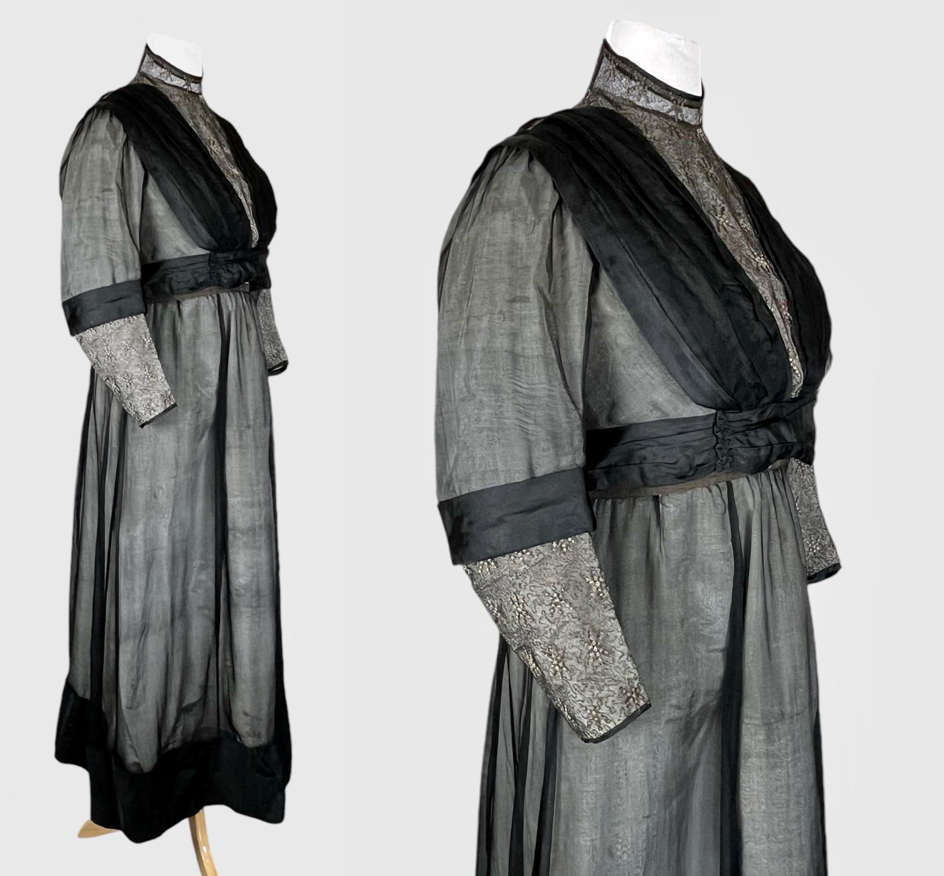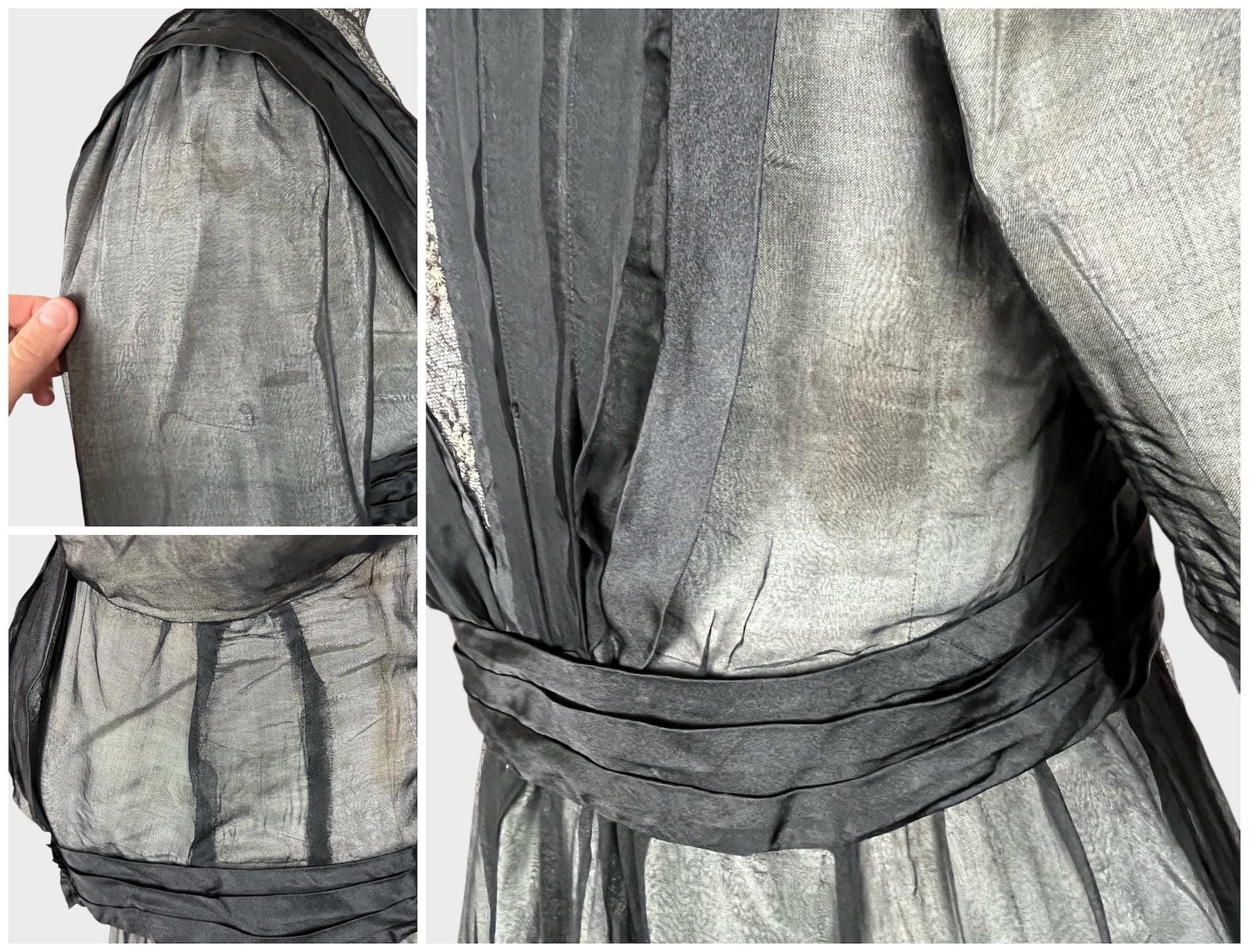 Condition: Good antique condition and presents very well. Spotting and discoloration are present on the interior skirt and are visible through the sheer outer layer. Additional discoloration is present on the interior cotton bodice, also visible beneath the sheer black silk. Please enlarge photos for detailed condition views
