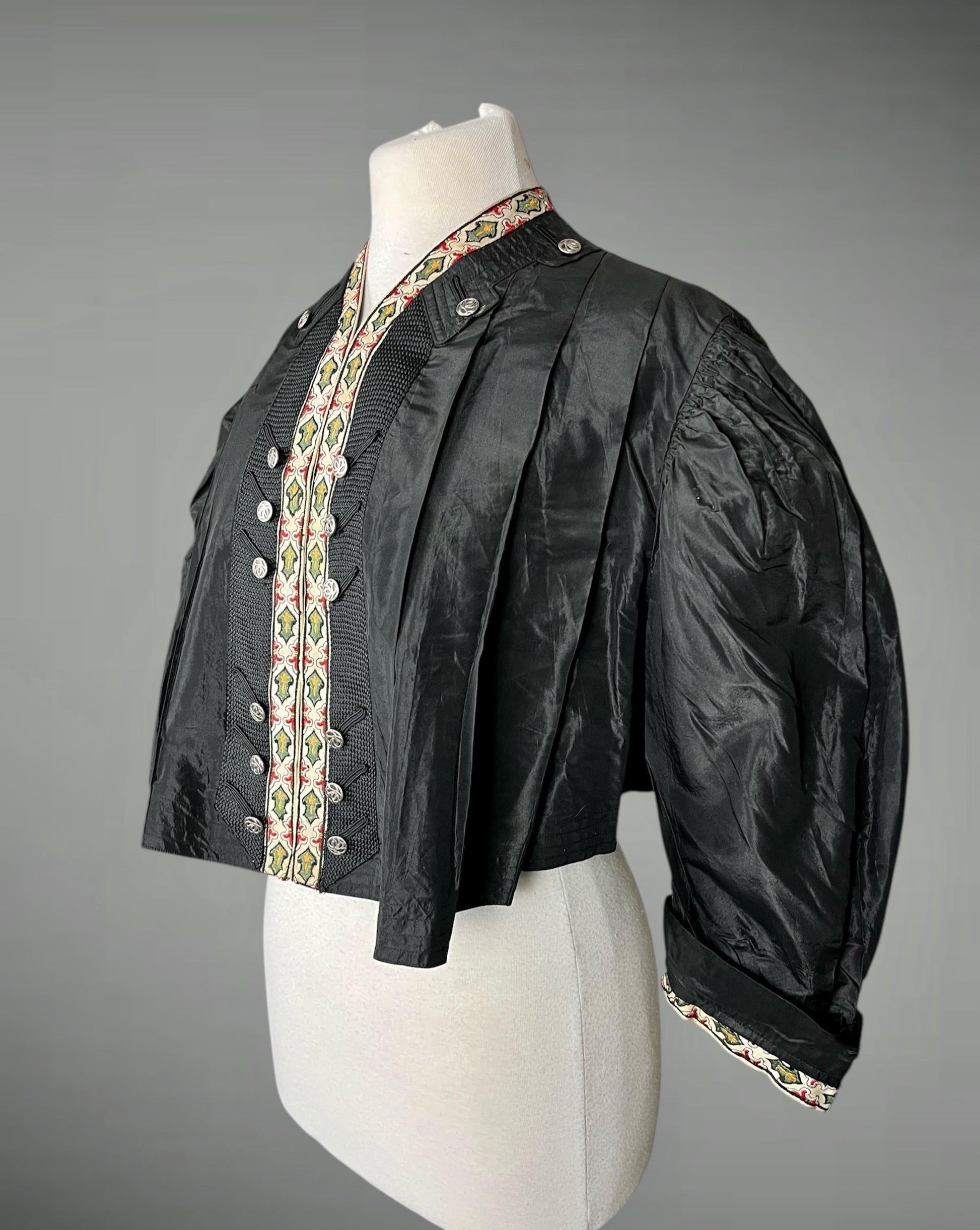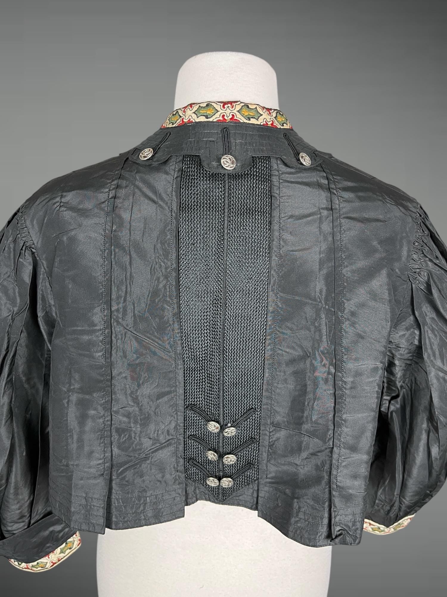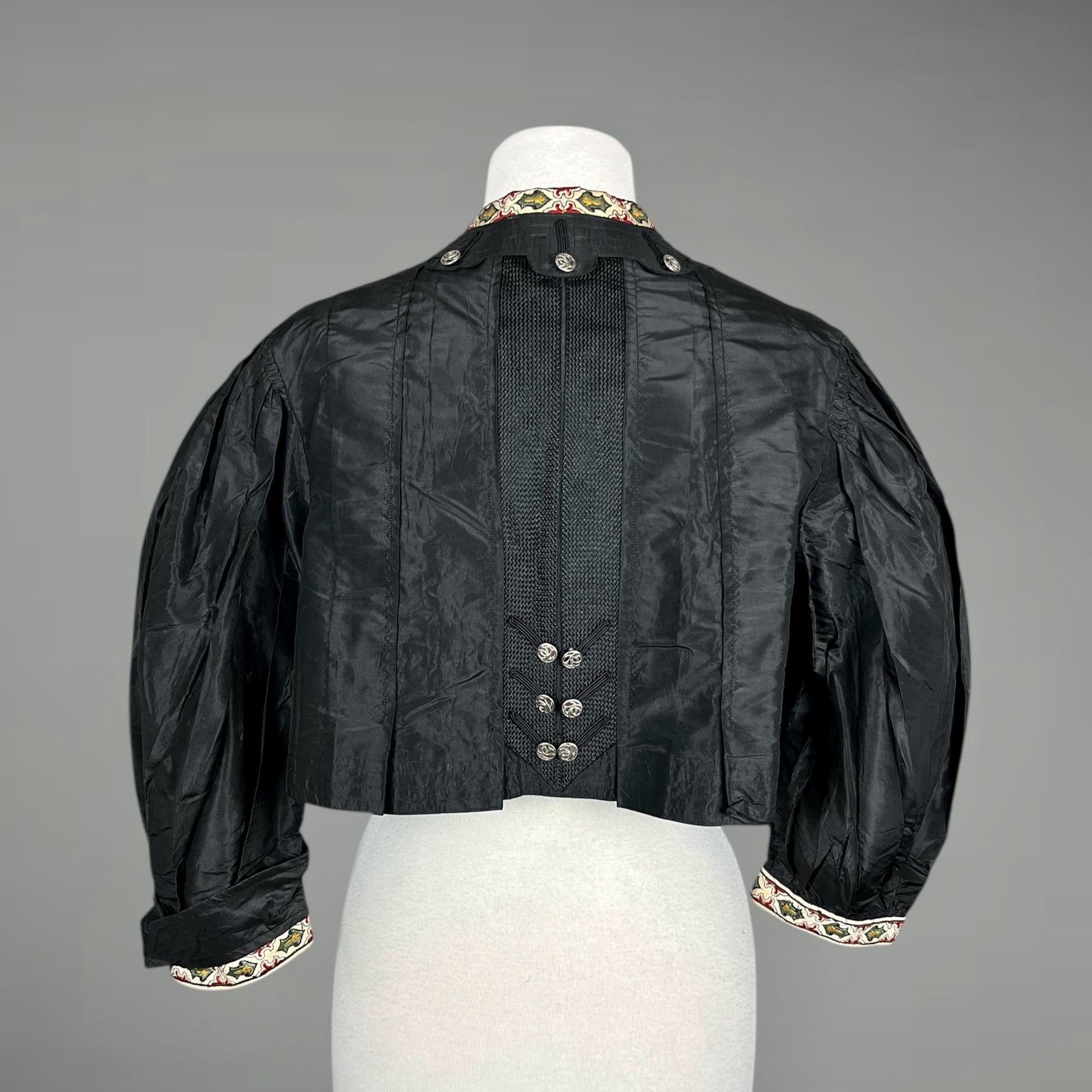 Antique 1900s Edwardian Black Silk Eton Jacket with Embroidered Trim, Folk-Influenced Historic Costume, M–L