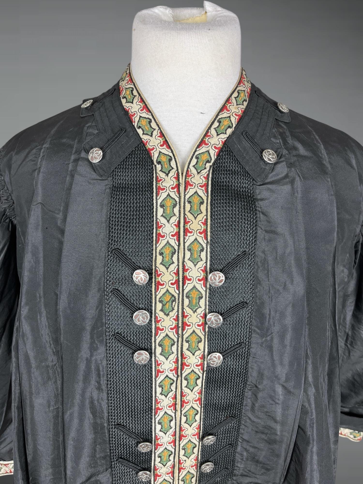 Content: Silk taffeta, blackwork braid, coiled braid loops, silver-tone buttons, embroidered trim