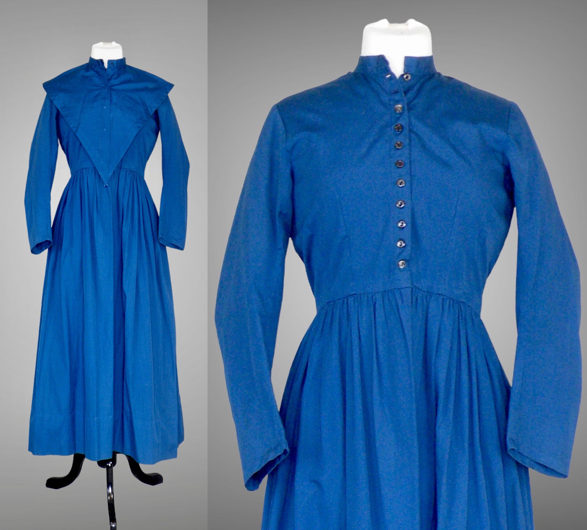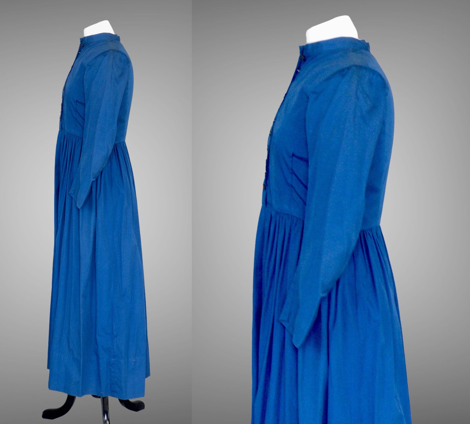 The dress is styled with a fitted neckline and seamed bodice, fastening down the front with eleven black mother-of-pearl buttons and a single hook and eye at the waist. The bodice interior is lined in blue cotton, while the sleeves remain unlined. Side and back seams show hand whip-stitching, highlighting careful construction. The skirt is softly gathered and falls to an ankle-to-floor length, creating a graceful, modest silhouette.
