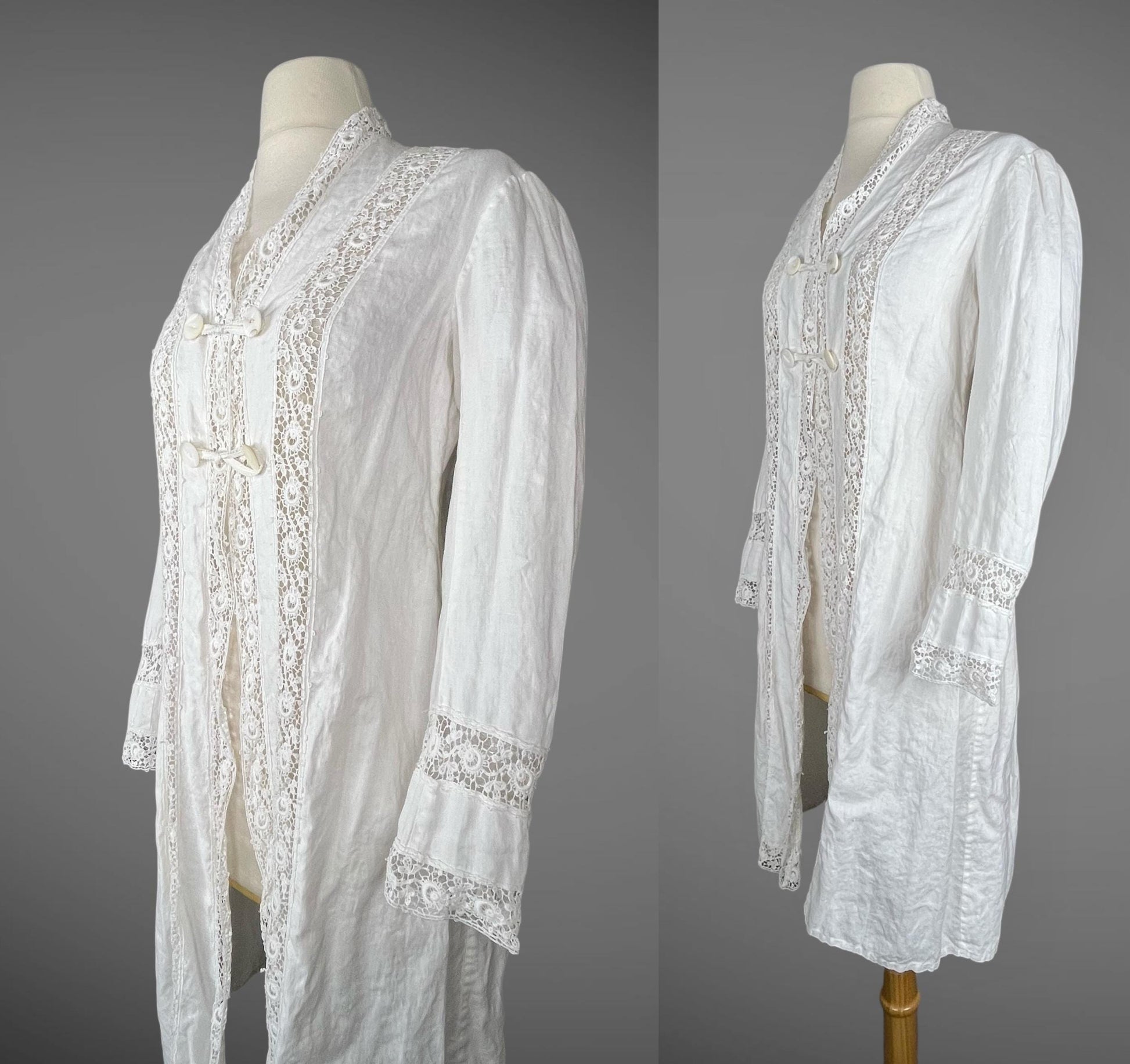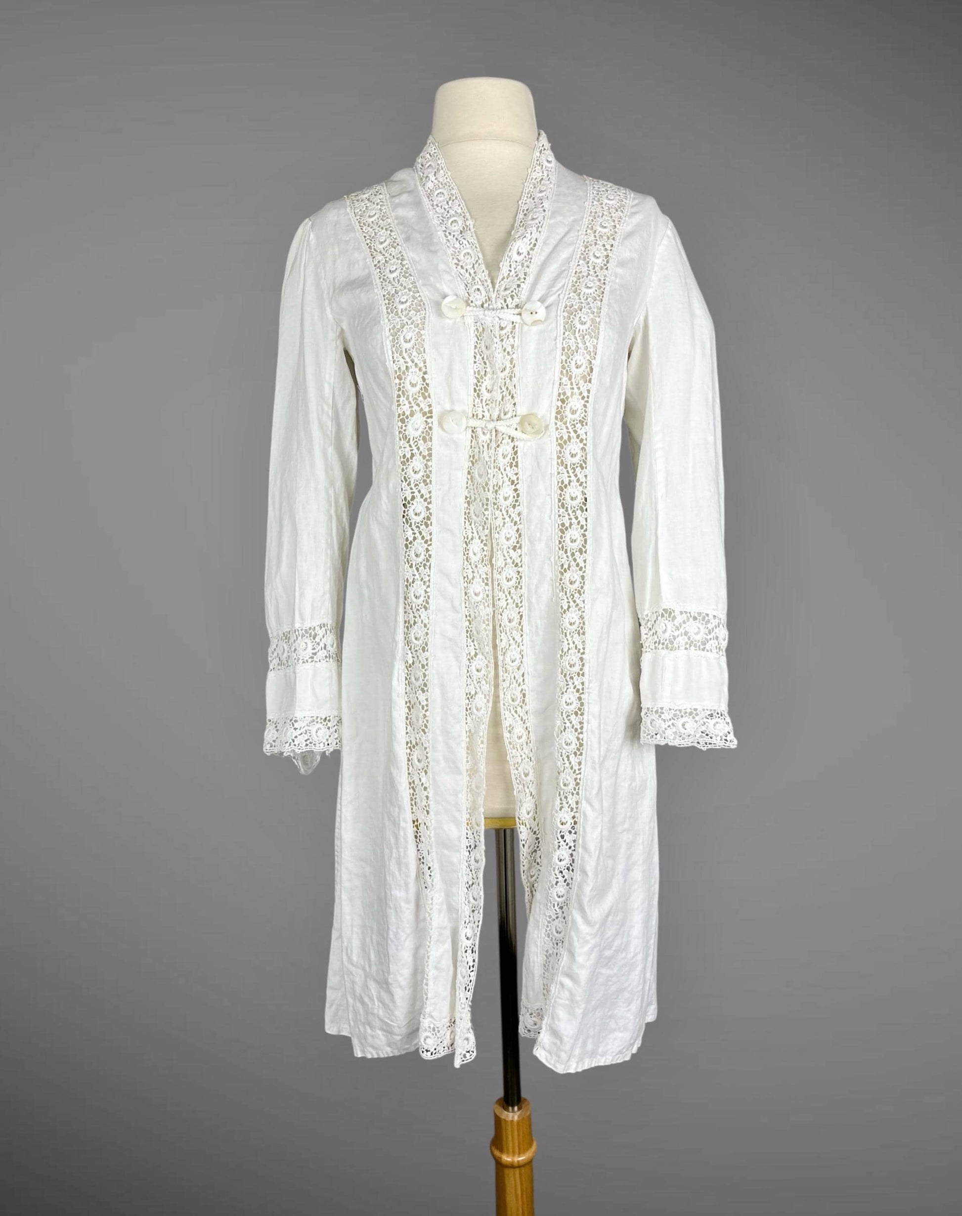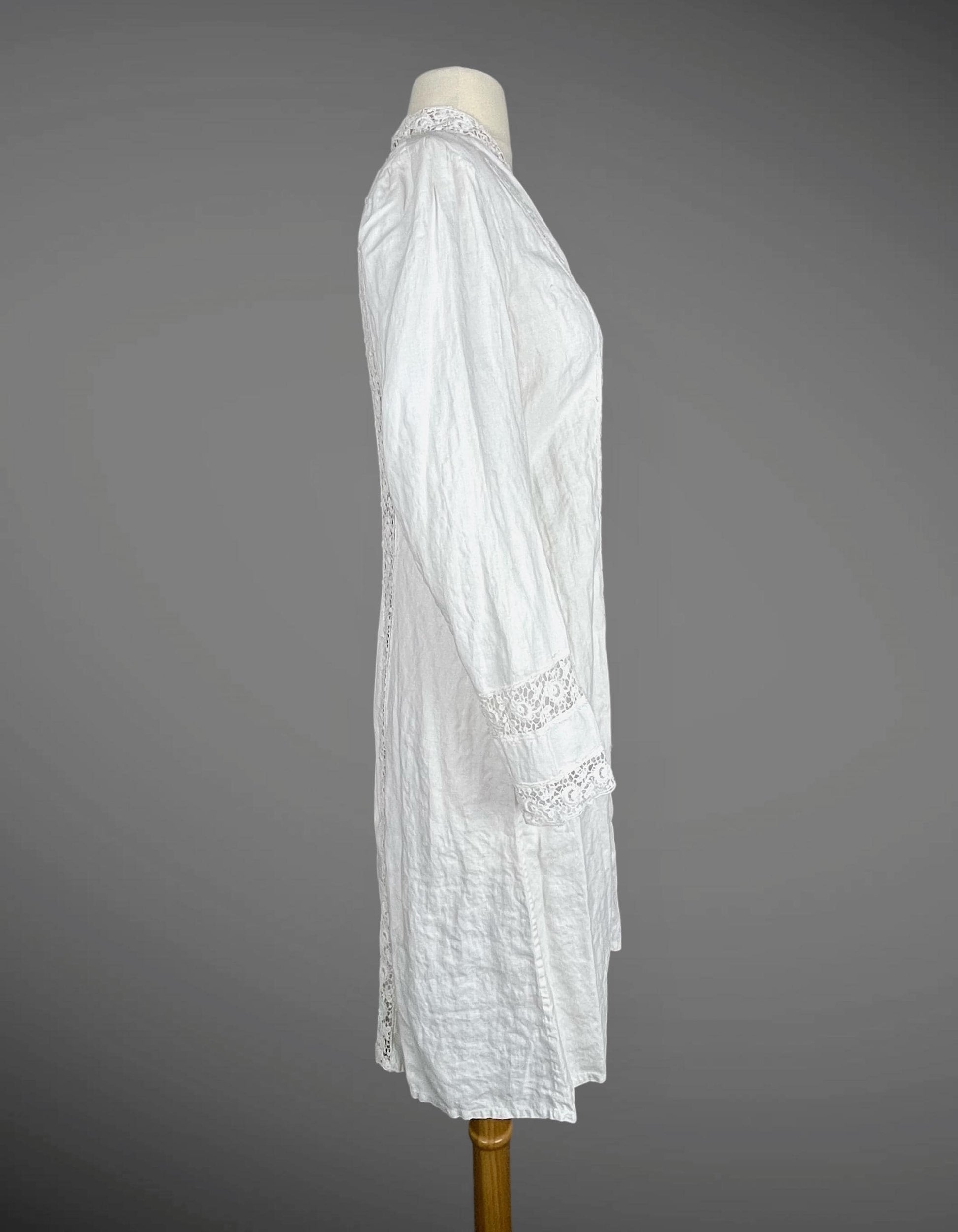 Graceful antique Edwardian jacket, circa 1900s–early 1910s, fashioned from soft, pliable white linen accented with vertical panels of delicate floral needlerun insertion lace. The fluid drape of the linen makes this piece perfect for layering over fine lingerie or summer dresses. Styled with a high-V neckline, decorative double-MOP button closures at the bust, and an open-front silhouette, the jacket skims the figure while allowing for movement and airflow. Long sleeves are finished with lace-trimmed hems, and matching lace panels run down the back for flattering silhouette.