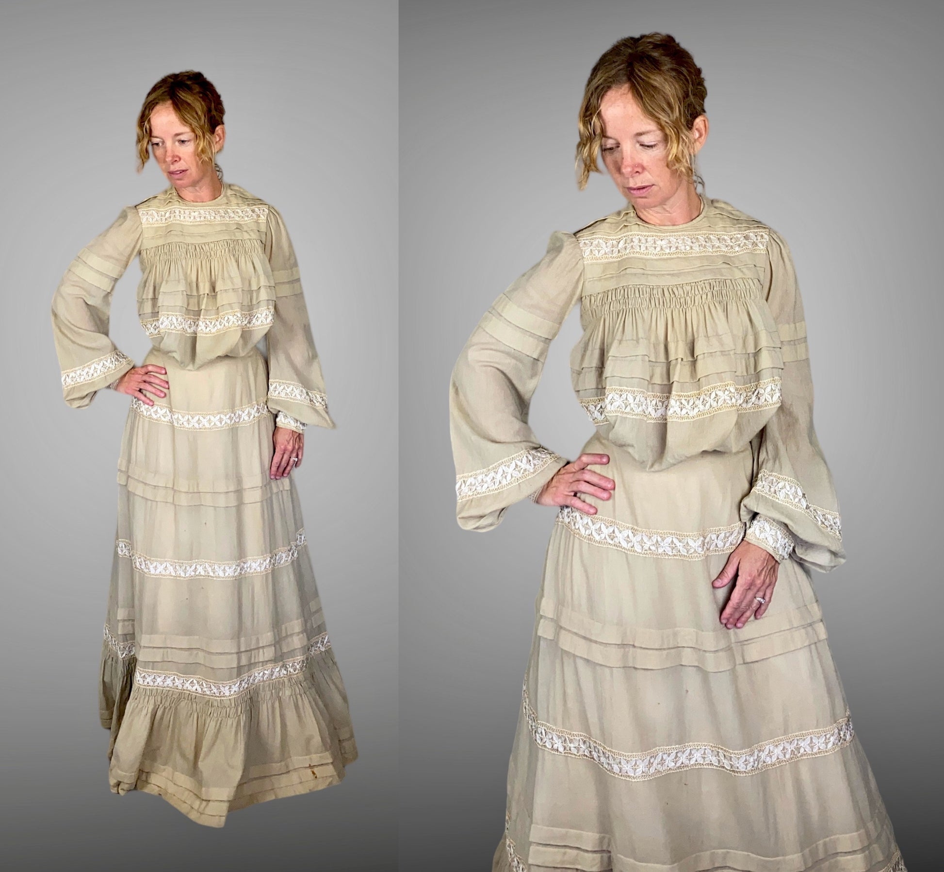 Antique 1900s Edwardian Gibson Girl Dress in Beige Wool, Bishop Sleeves, Pigeon Breast Bodice, XXS