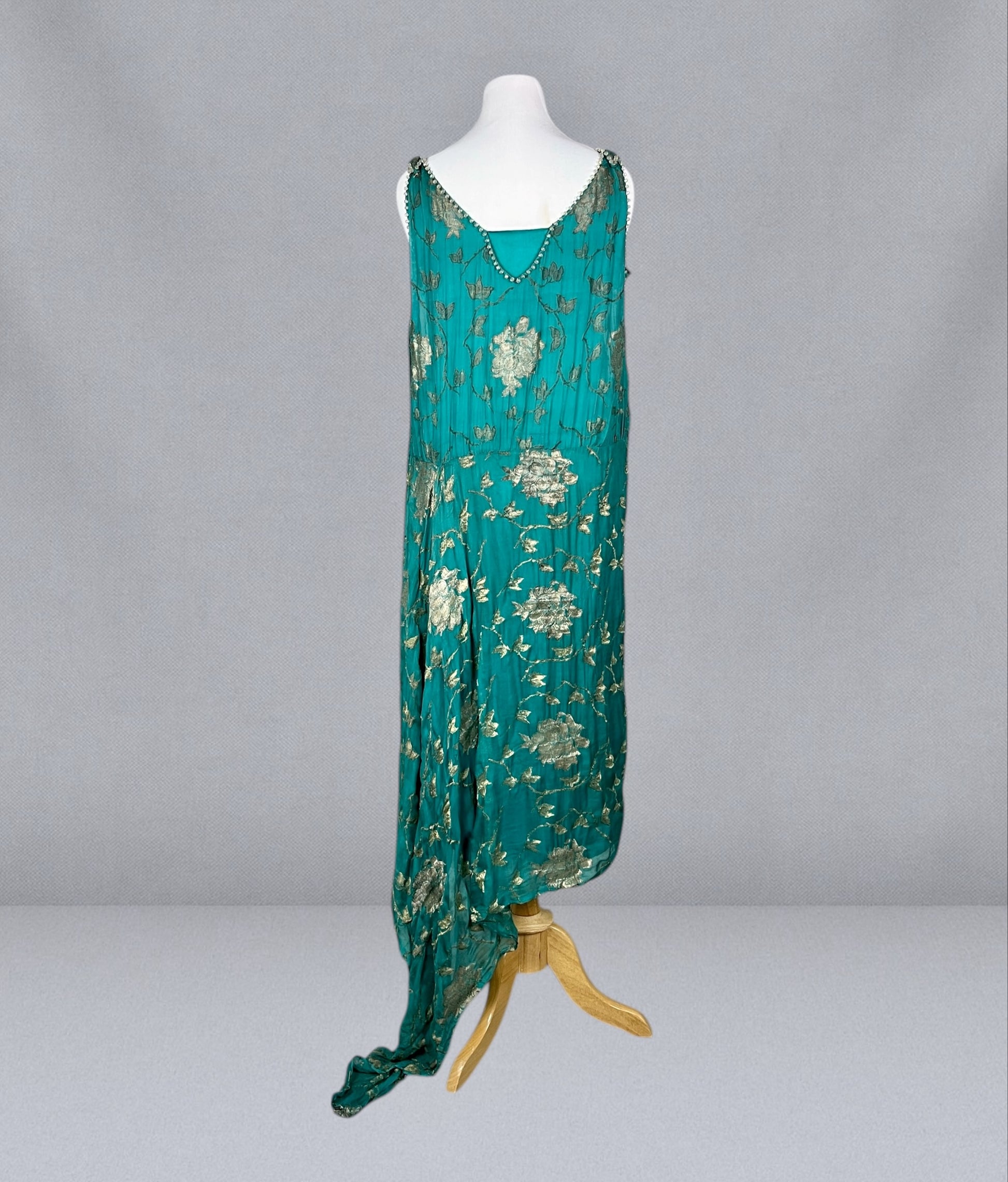 The skirt falls straight and fluid from the hip, finishing with a dramatic side train that trails elegantly behind — a stunning detail that firmly places this piece in the realm of true Jazz Age eveningwear.