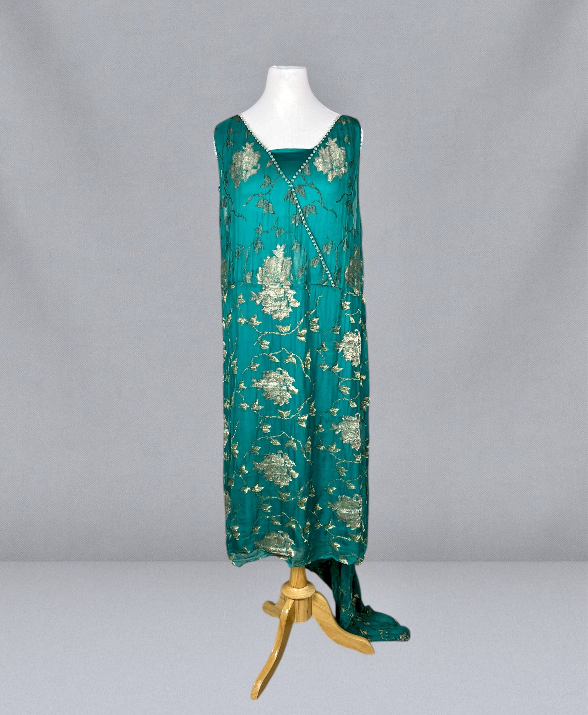 Exceptional antique 1920s Jazz Age evening dress crafted in rich teal silk, lavishly decorated with gold floral lamé motifs that shimmer beautifully against the saturated jewel-tone ground. A striking and fluid example of true 1920s design, this gown is further elevated by its original label: J.M. Gidding & Co., New York • Paris • Duluth • Cincinnati — a respected early 20th-century retailer known for high-quality fashion and cosmopolitan influence.