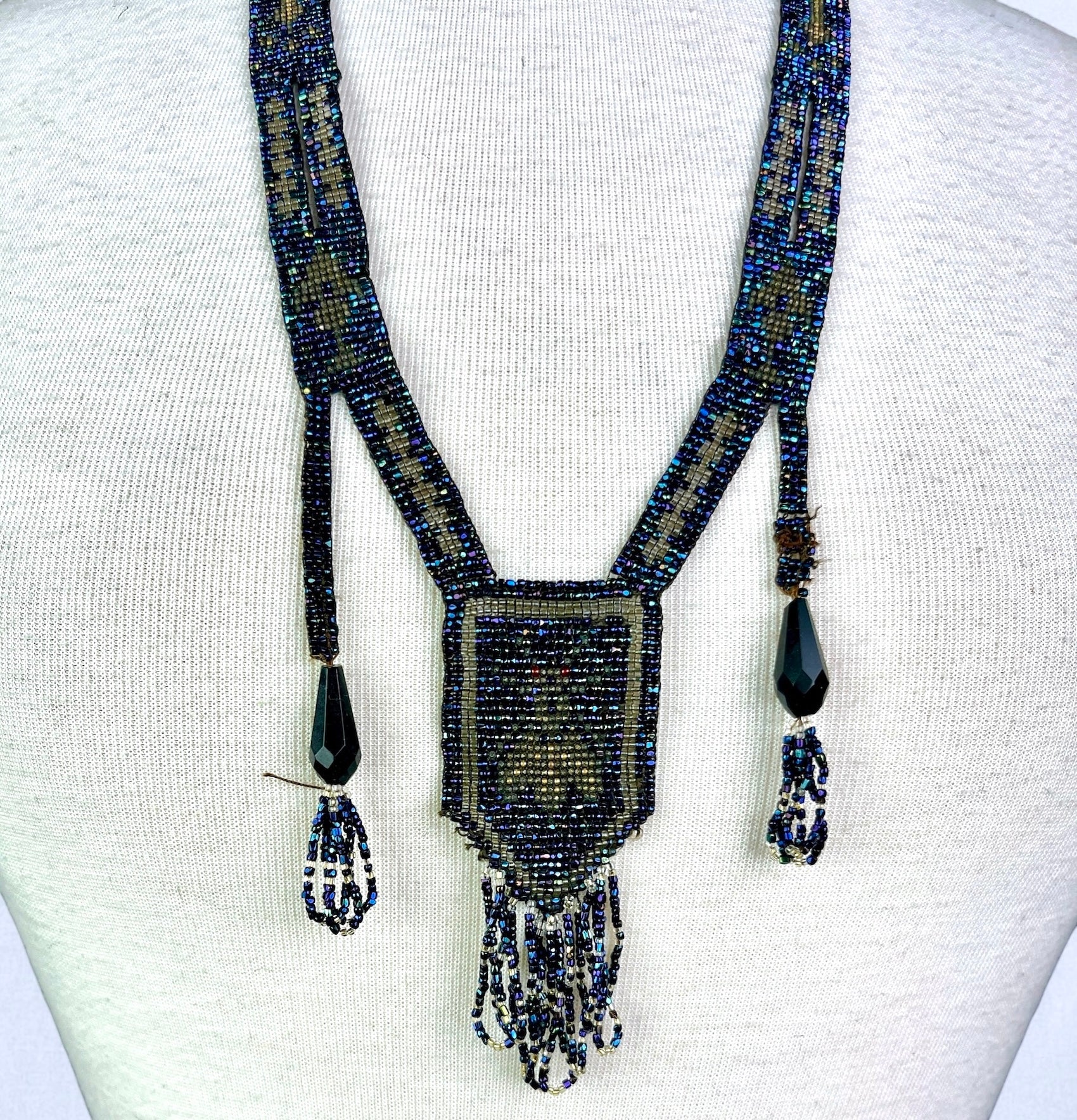 Antique early 1920s beaded sautoir necklace, richly worked in iridescent blue, teal, gold and black glass beads. The long strands frame a striking central beaded medallion depicting a stylized beetle or scarab motif, flanked by faceted black glass drops and finished with beaded fringe. A bold, graphic Jazz Age accessory with subtle Egyptian Revival influence.