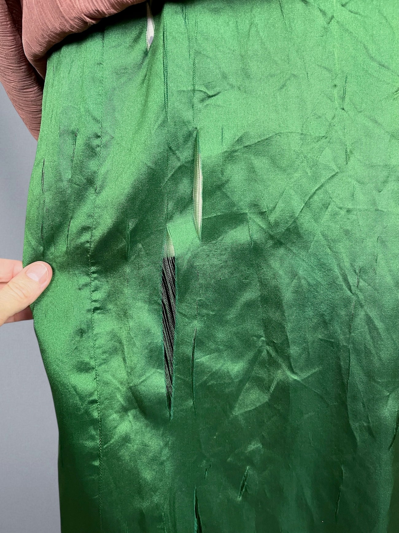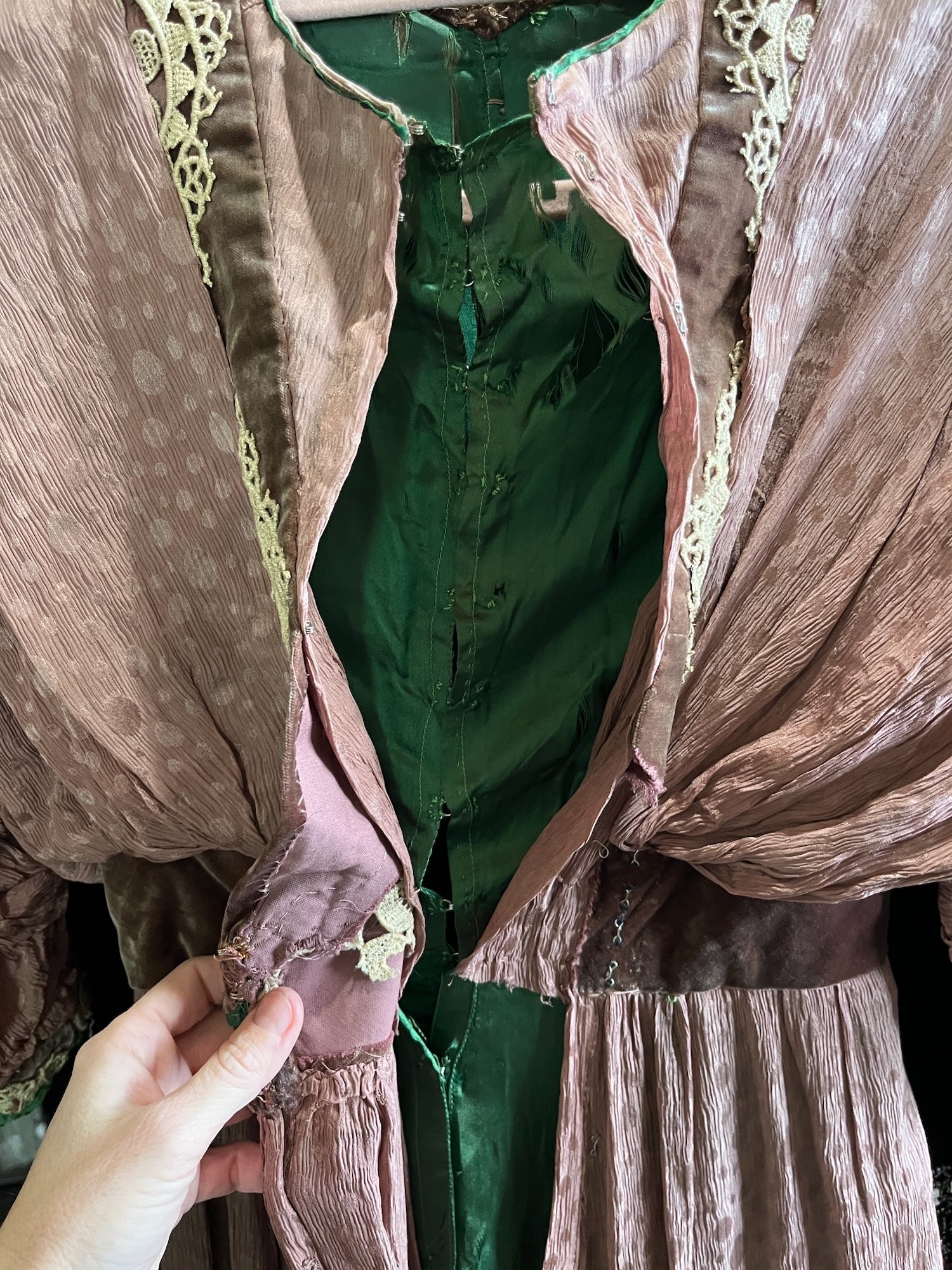 Good- antique condition overall, with important notes. The exterior taupe silk presents beautifully overall; however, there is wear at the underarms, including green discoloration and a tear to the outer taupe silk at one underarm (see photos). The second underarm shows discoloration and seam breakaway. These areas are fully concealed when worn due to the layered sleeve overlay design but do affect the condition of the outer silk. The emerald green silk interior lining is fragile and shows significant splitting and shredding. Lace, velvet, and remaining outer silk are visually strong. This dress should be handled gently and is best suited for light wear, display, or collection.