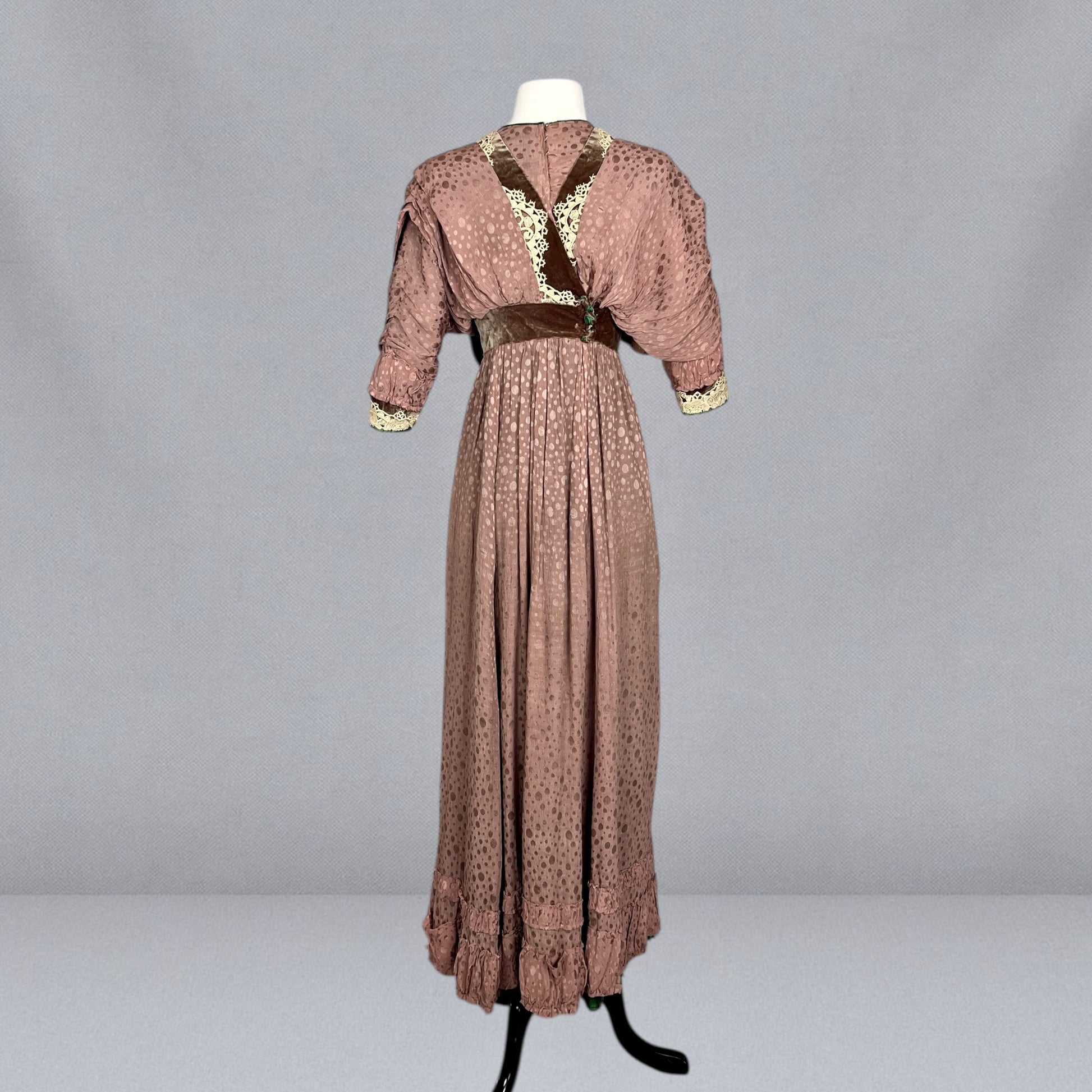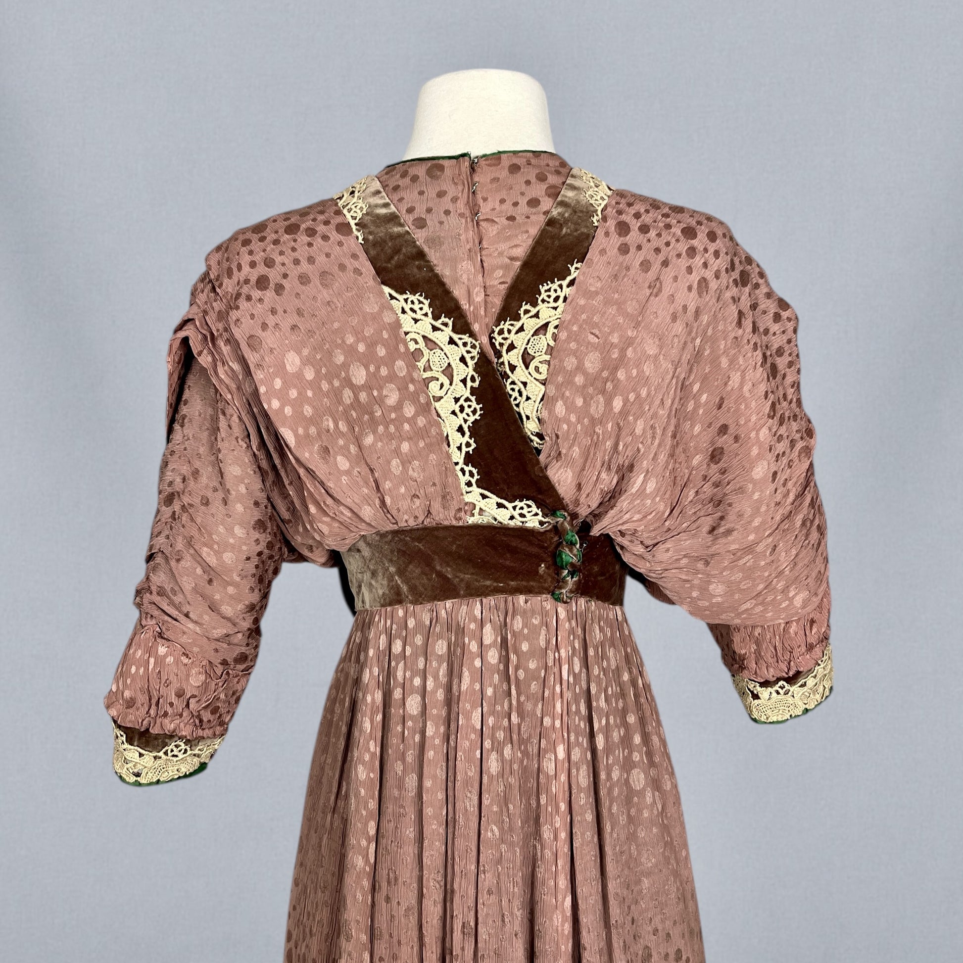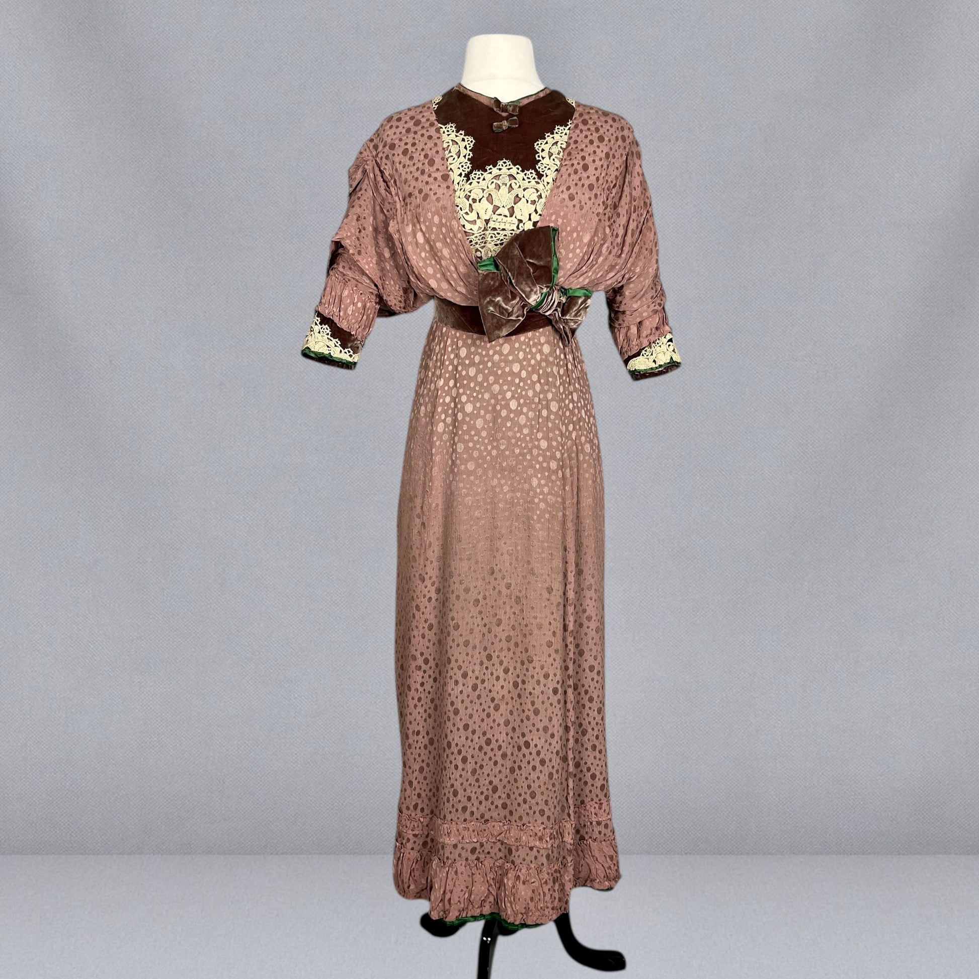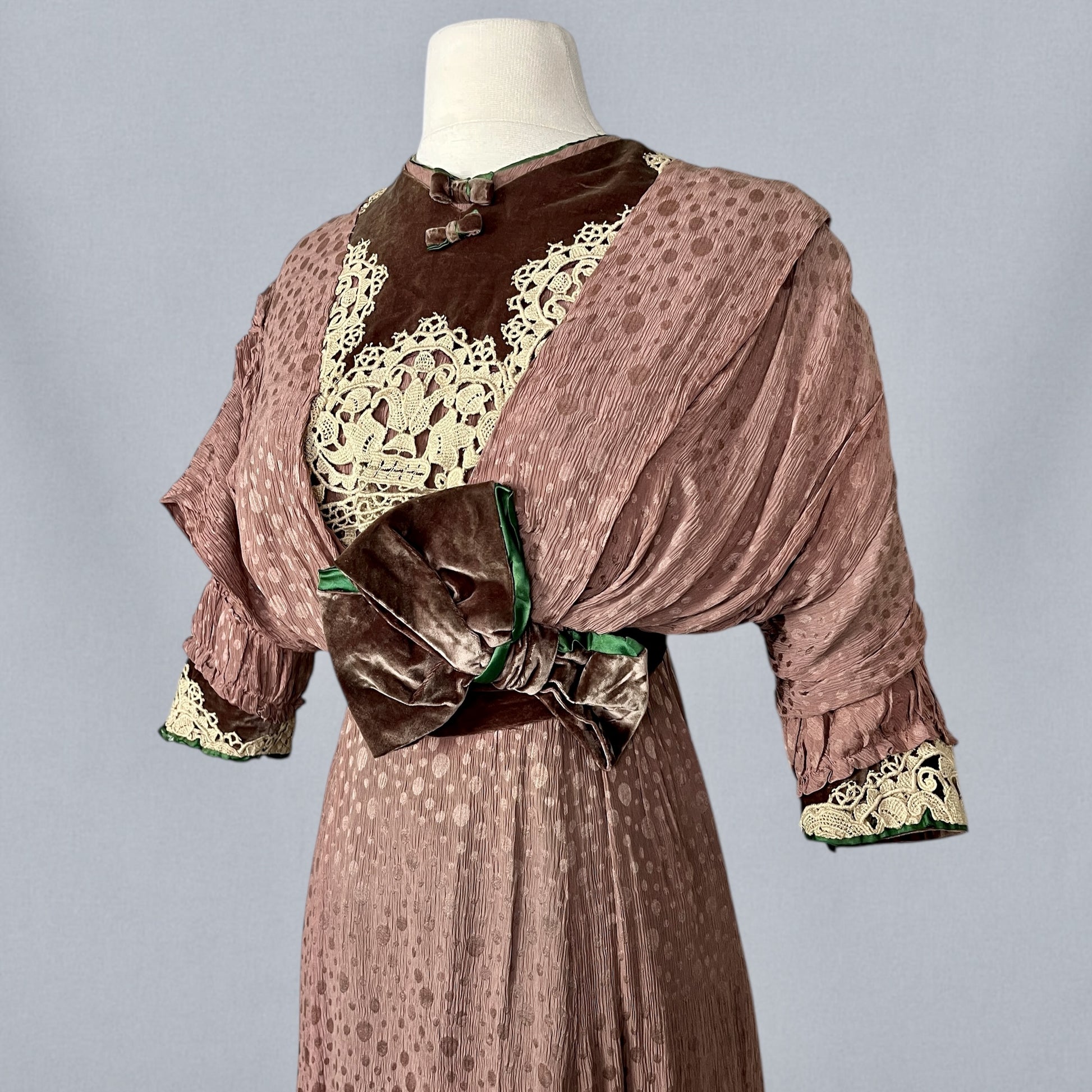 Beautiful antique Edwardian dress dating to the early 1900s, crafted in a textured taupe silk with a soft, fluid drape. The silk features a subtle dot motif that gently varies in scale across the body. The bodice is anchored by rich brown velvet panels and trimmed with intricate cream lace, forming a striking contrast against the taupe silk. At the neckline, two adorable small brown velvet bows trimmed in emerald green silk sit at the top. The lacework is especially lovely, with organic, scrolling motifs that frame the neckline and continue through the back. A wide brown velvet sash defines the waist and is finished with a dramatic oversized velvet bow, accented with emerald green silk trim.