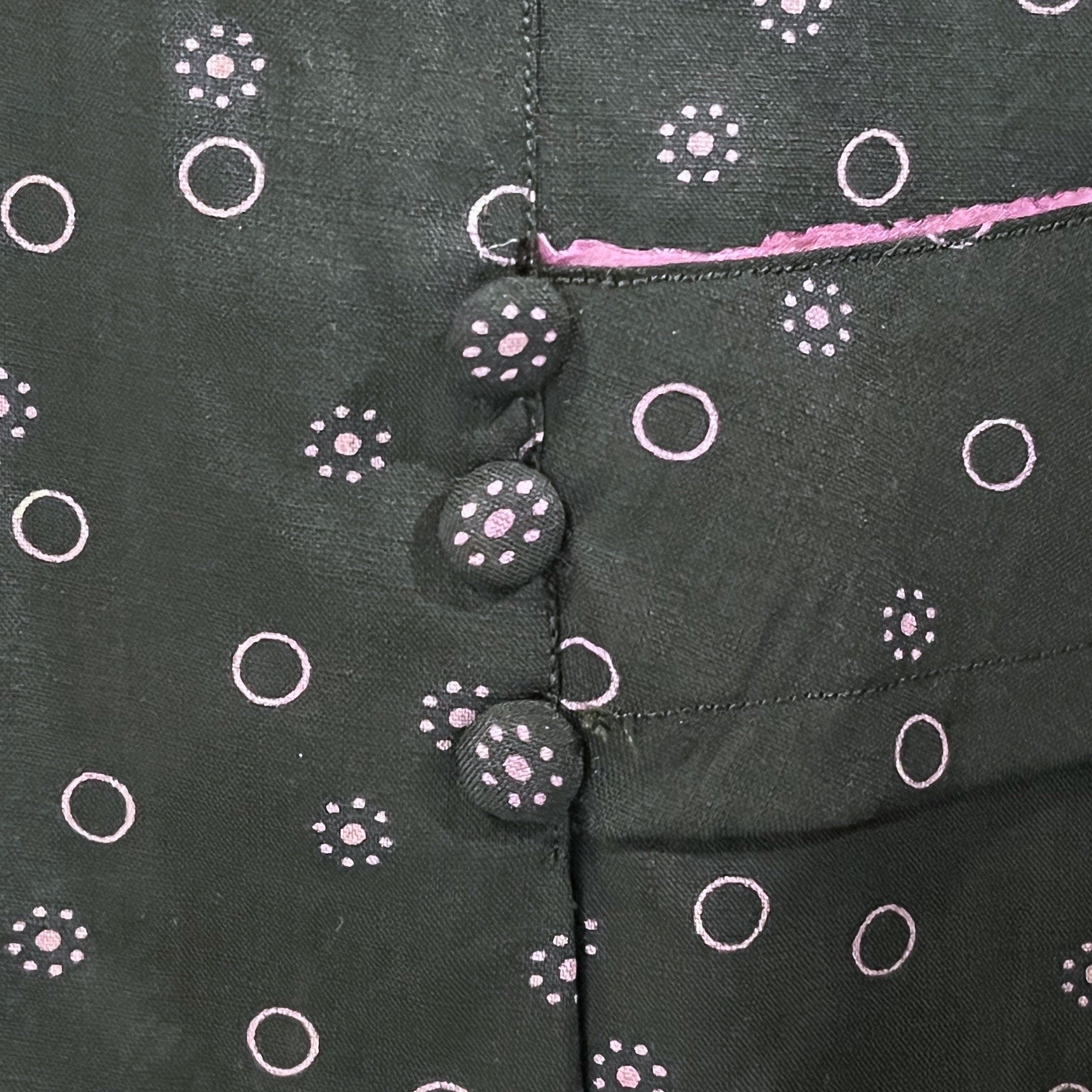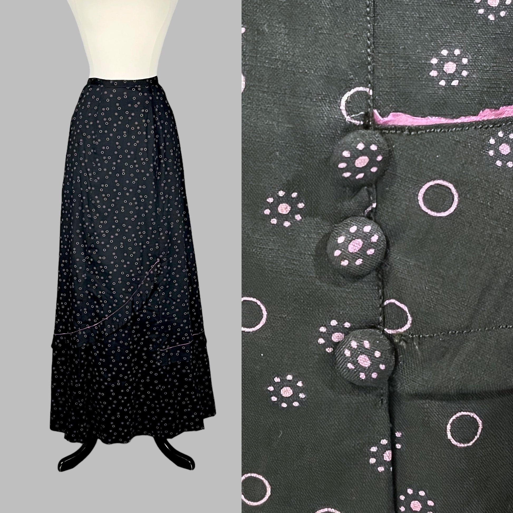Antique Edwardian walking skirt dating to the 1900s–1910s, crafted in a lightweight black cotton silk-blend printed with a striking lilac pink floral and circular motif. The skirt is styled with a fitted high waistband and beautifully executed seamwork, creating a flattering A-line silhouette that remains softly fitted through the upper hip before flaring gently toward the hem.