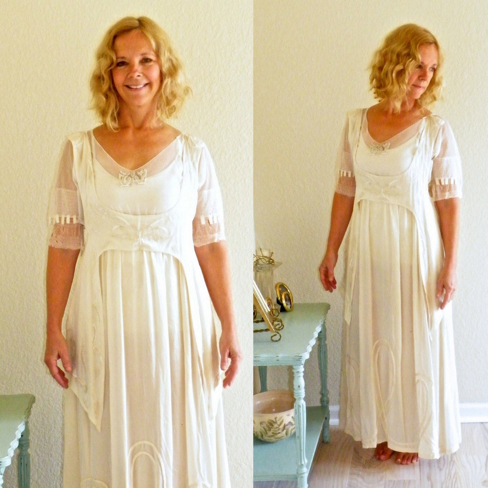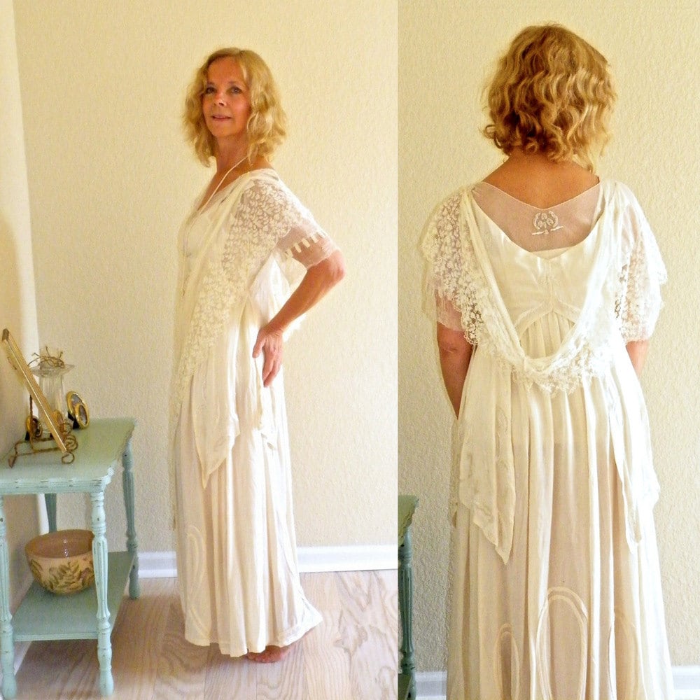 Breathtaking antique Edwardian wedding gown dating to the late 1910s or early 1920s, crafted in luminous cream silk and richly adorned with ivory embroidery and clear iridescent beadwork. This exceptional Titanic-era bridal dress is accompanied by a scalloped floral net lace shawl and a cream silk knotted tassel, creating a truly ethereal, bohemian presentation.