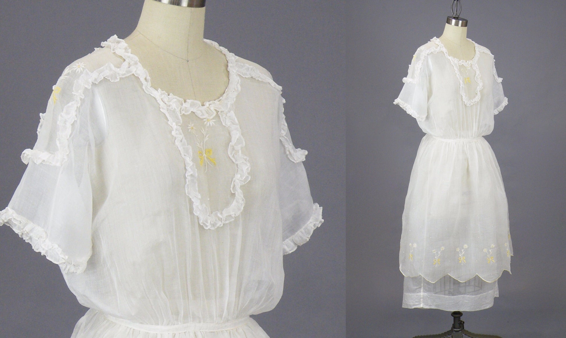 Antique Late 1910s–1920s White Embroidered Organdy Summer Dress, 2-Piece, XS 25" Waist