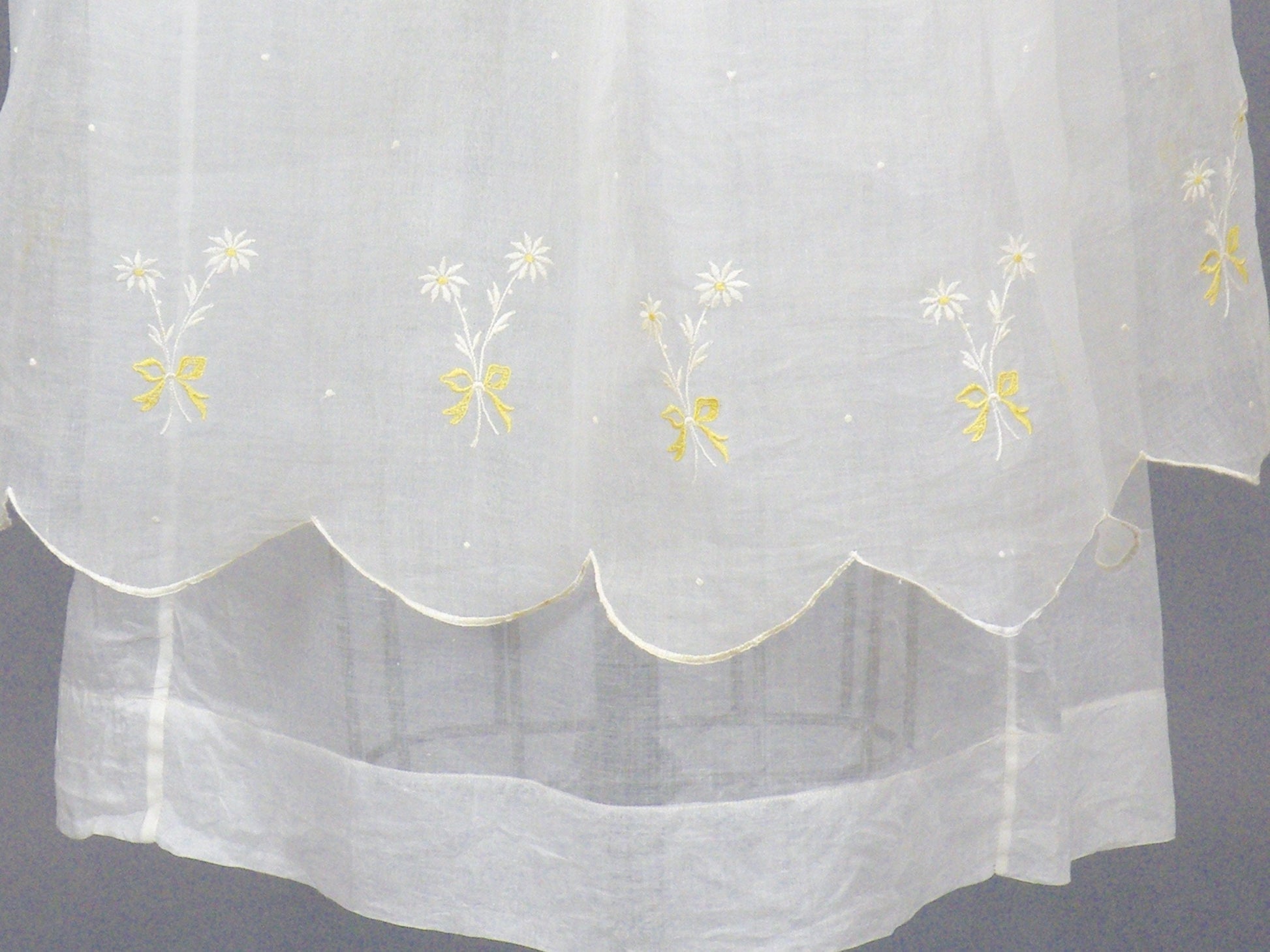 A separate fine cotton underskirt creates a lovely tiered effect and adds subtle structure beneath the sheer organdy layer. The dress fastens at the left side waist with a single hook and eye, along with a snap below the waist at the left side skirt opening. The underskirt closes at the back waistband with two hook and eye closures.