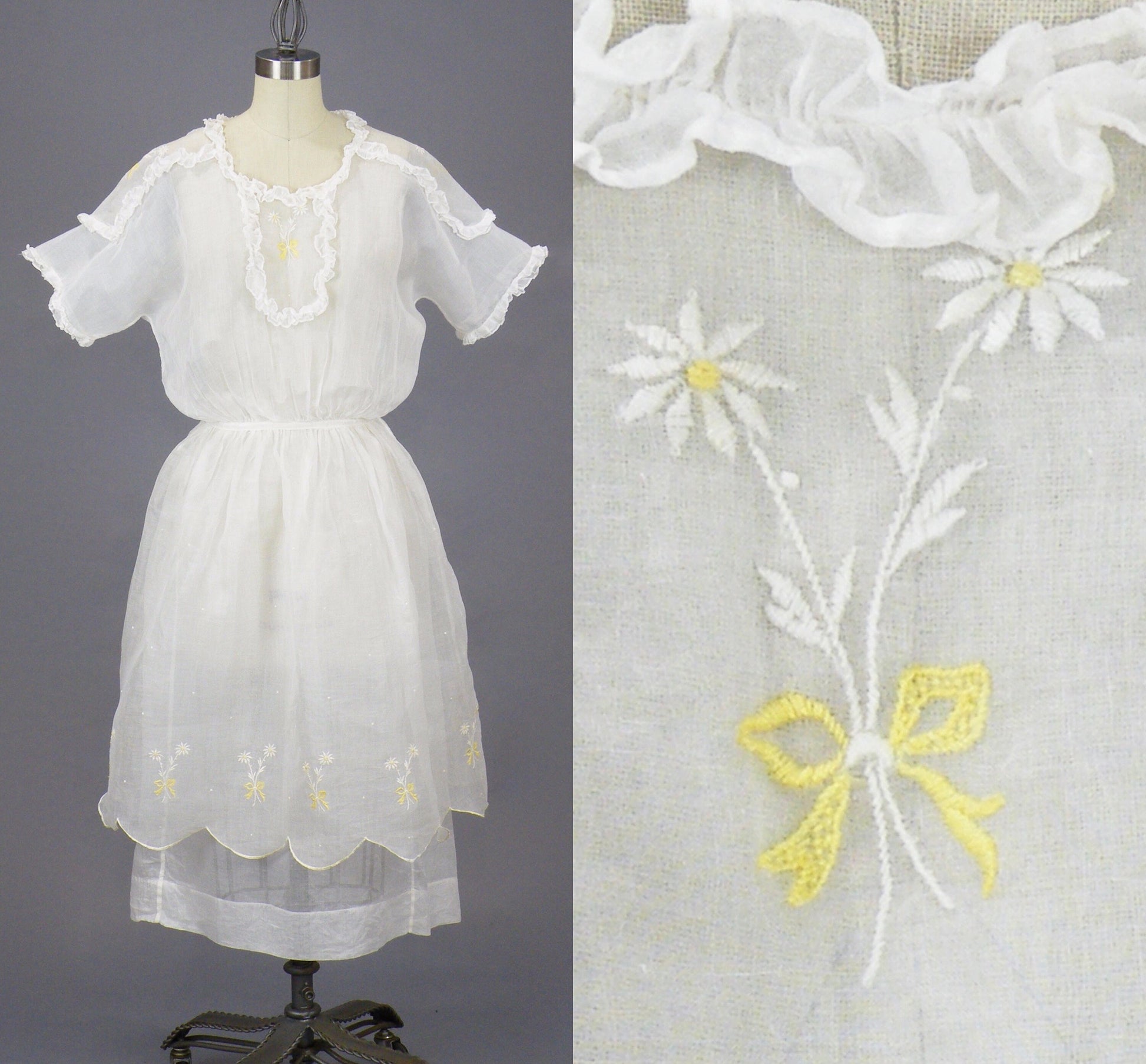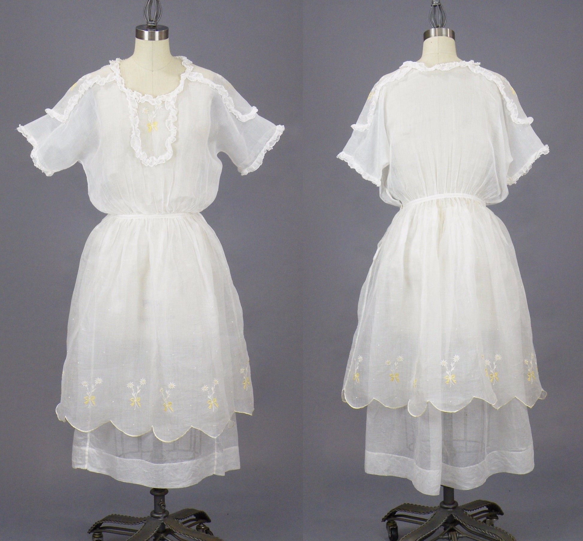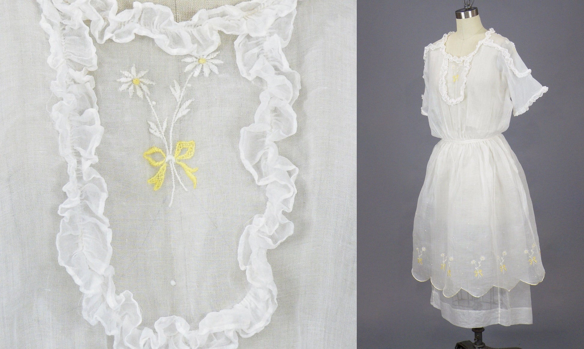 Ethereal antique late 1910s to very early 1920s two-piece summer dress set, crafted in fine sheer white cotton and beautifully embroidered organdy. This delicate ensemble features a soft blouson-style cotton bodice adorned with dainty daisy and bow floral embroidery, trimmed with gentle ruffles for a light, feminine finish. The coordinating skirt is made entirely of organdy (possibly silk organza), finished with a scalloped hem and matching embroidery positioned above each scallop.