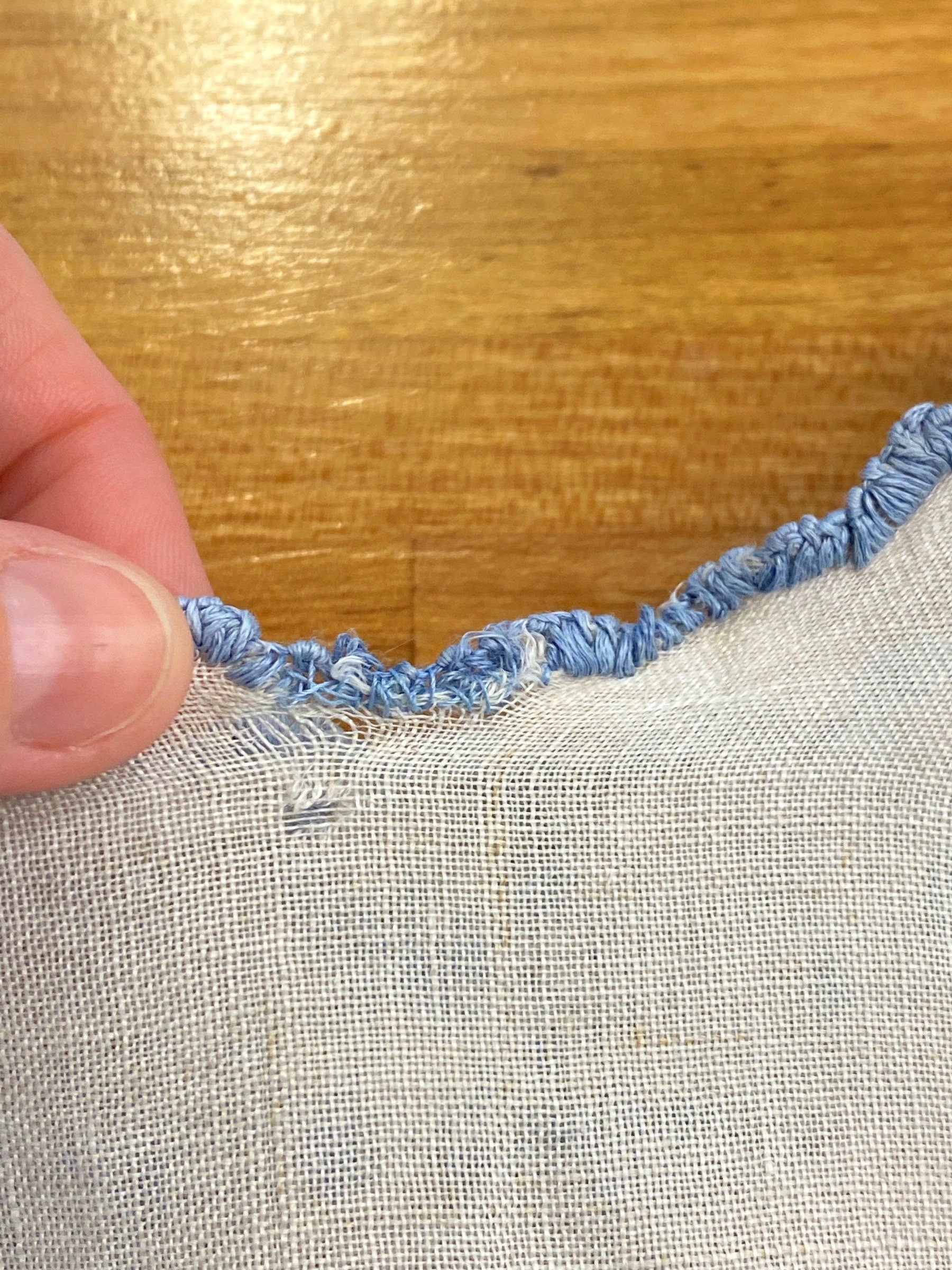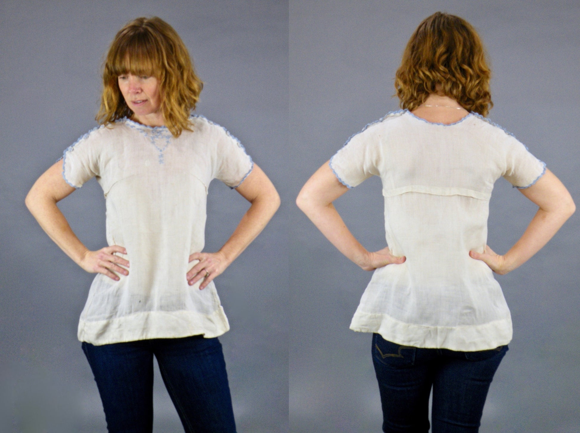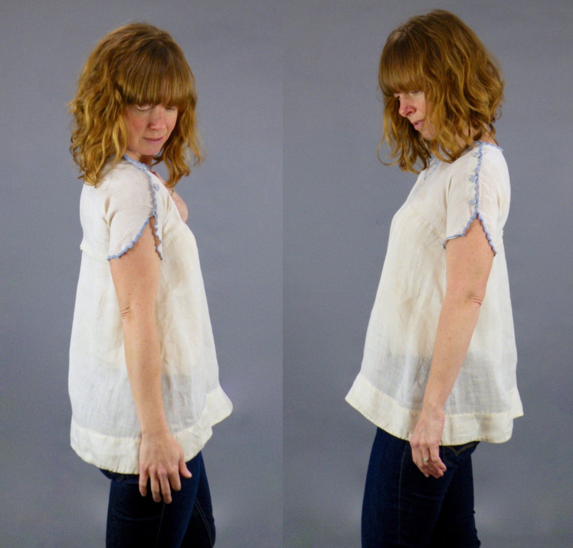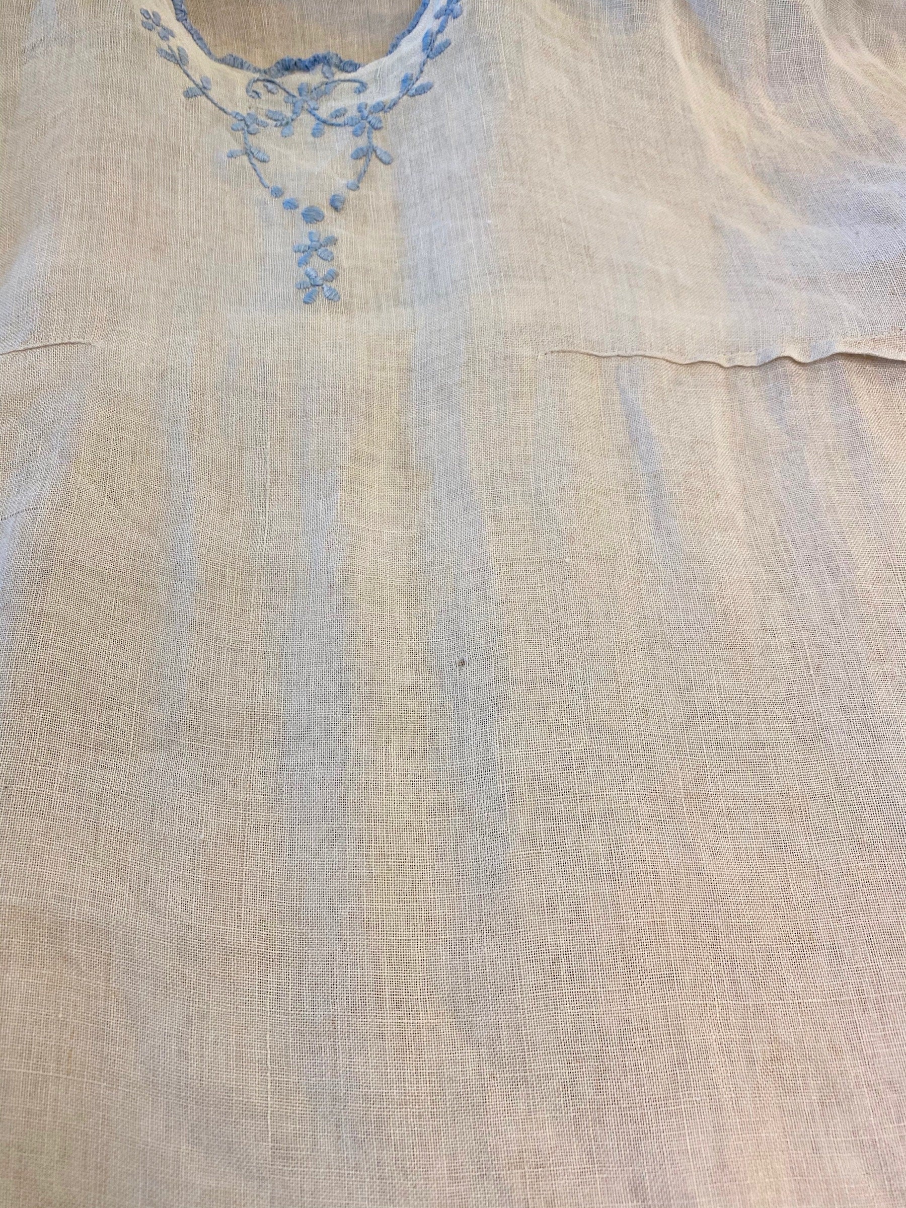 Antique embroidered peasant blouse believed to be circa late 1910s to 1920s. Made of natural linen featuring grayish blue floral embroidery at neckline, scalloped sleeves and up shoulders. Embroidered buttons accent the shoulders and the buttons on the left shoulder have hidden snaps underneath allowing the blouse to completely unbutton on that shoulder. The corresponding right side buttons are non-functional. At first glance, I believed this to be a small child's dress, however, the sleeves fit me very well and would be too big for a small child. Best for an XS adult size or teen. No closures with exception of snaps down left shoulder / sleeve.