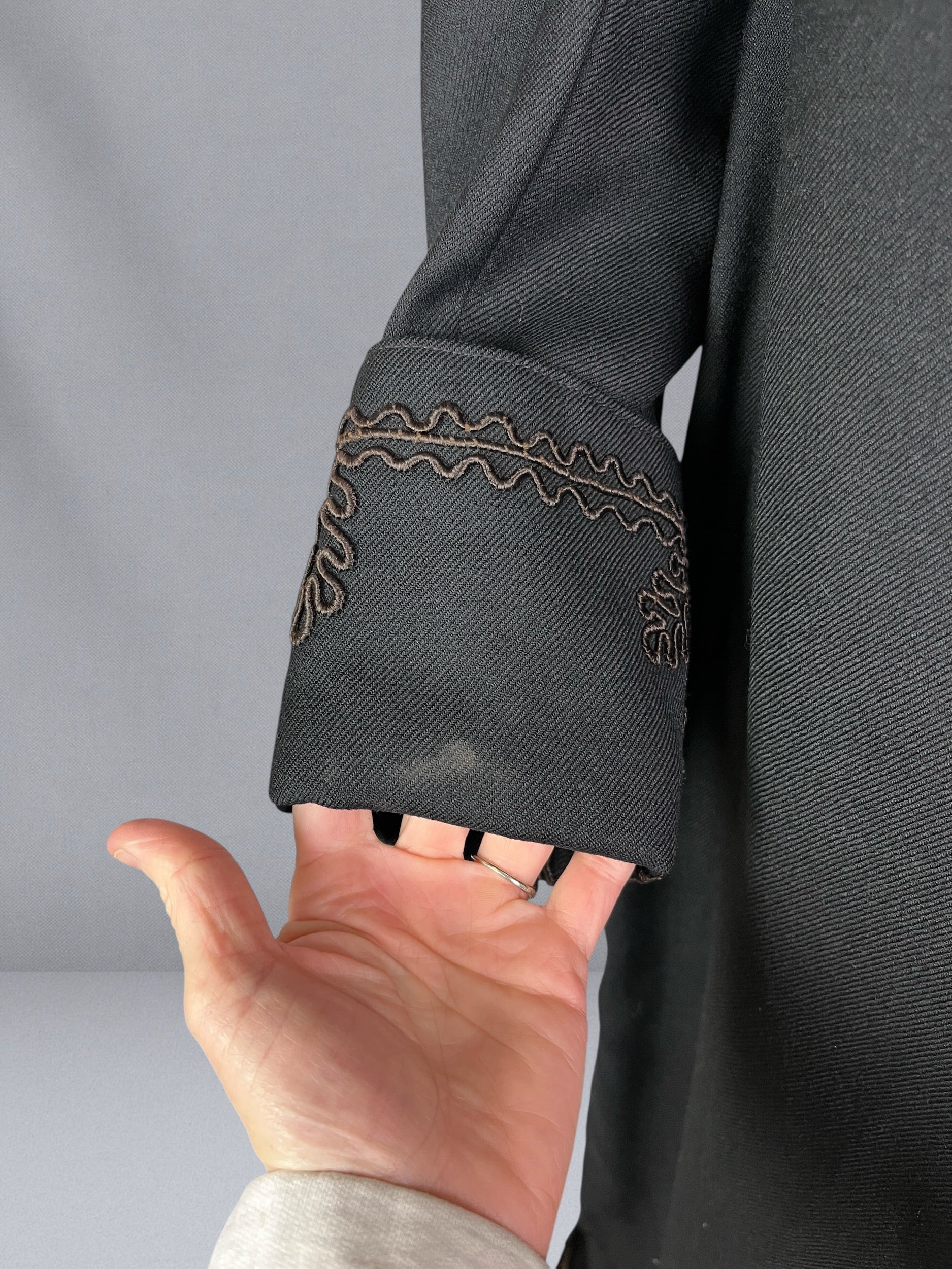 Antique Late 1910s Black Wool Twill Car Coat with Soutache Embroidery, M - M/L