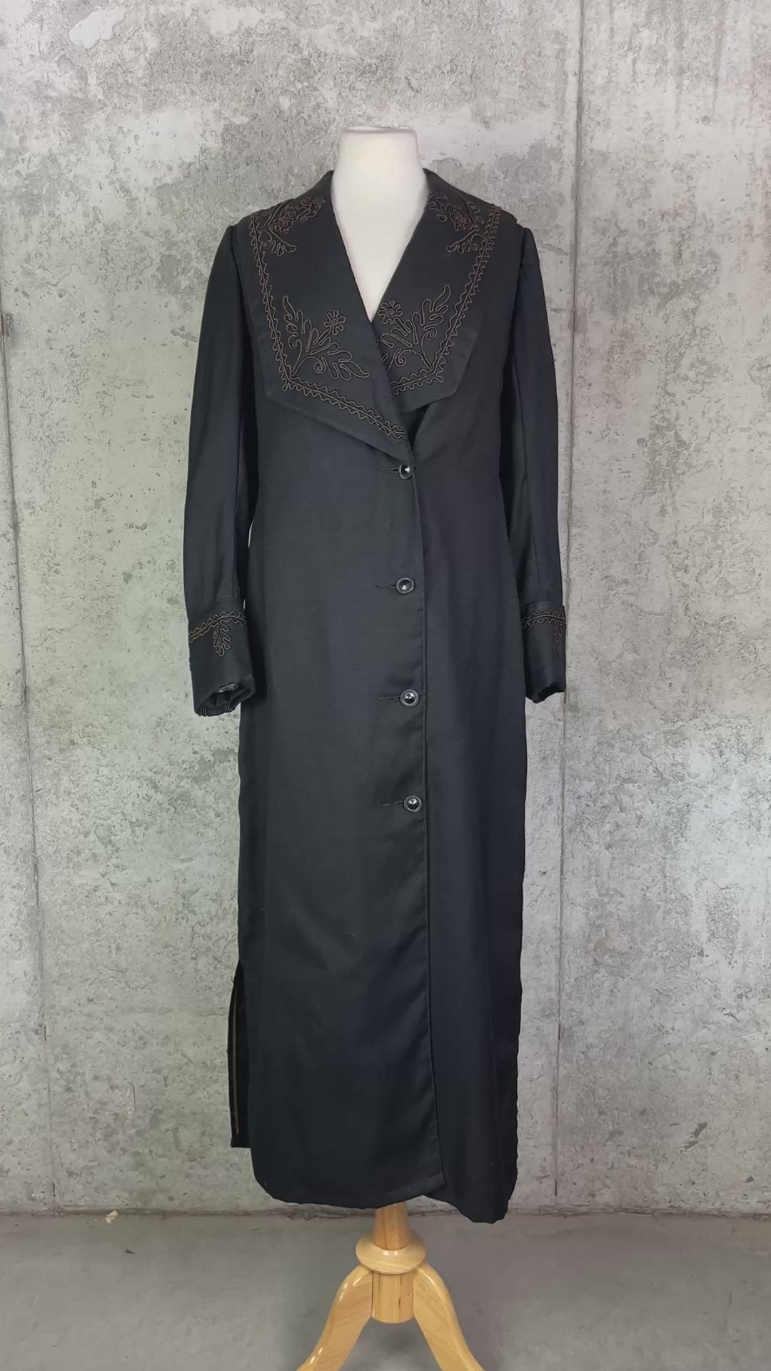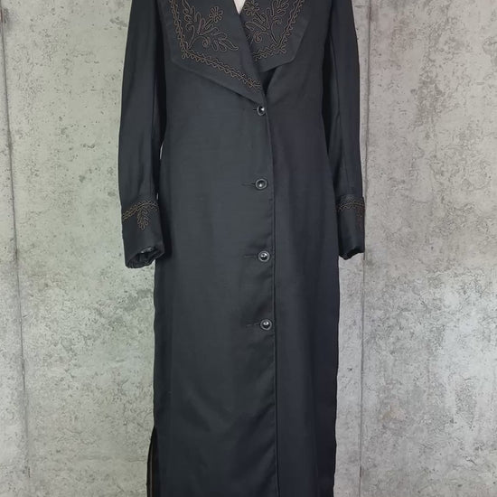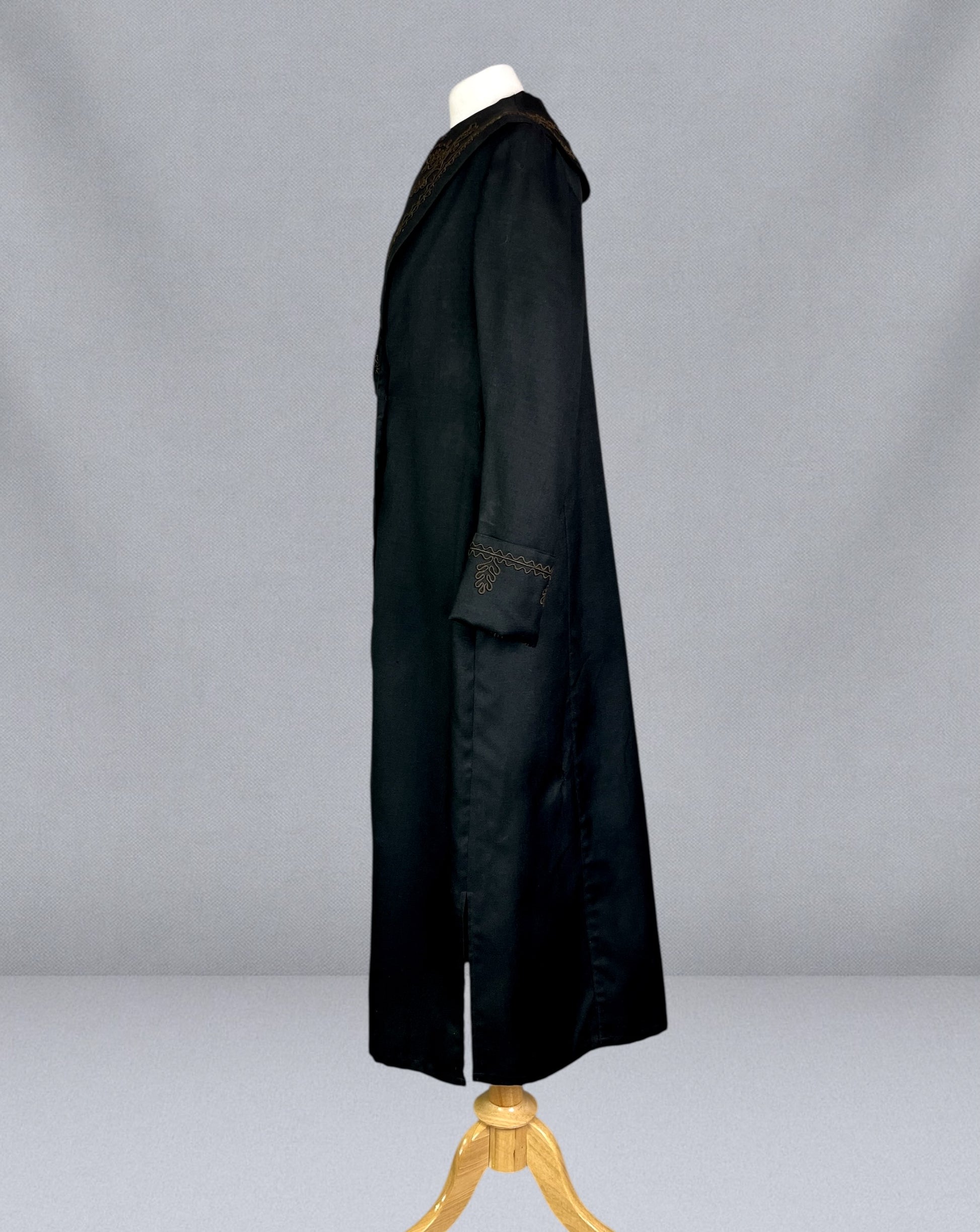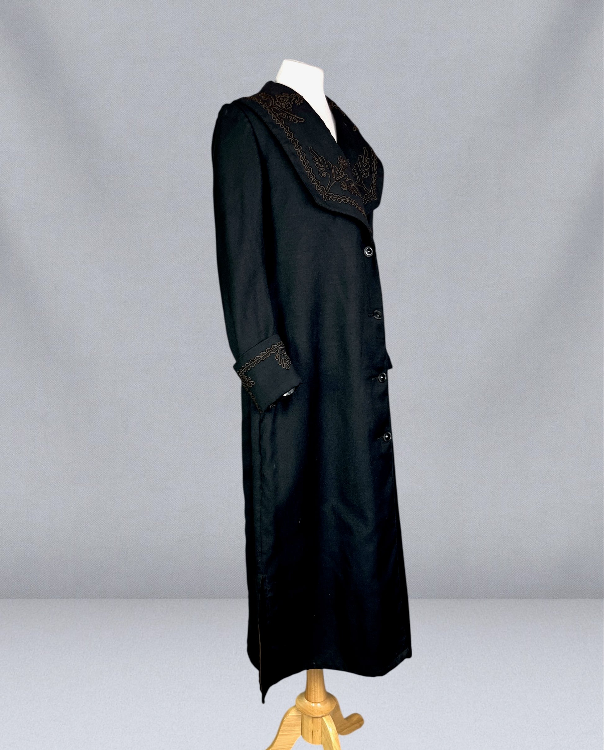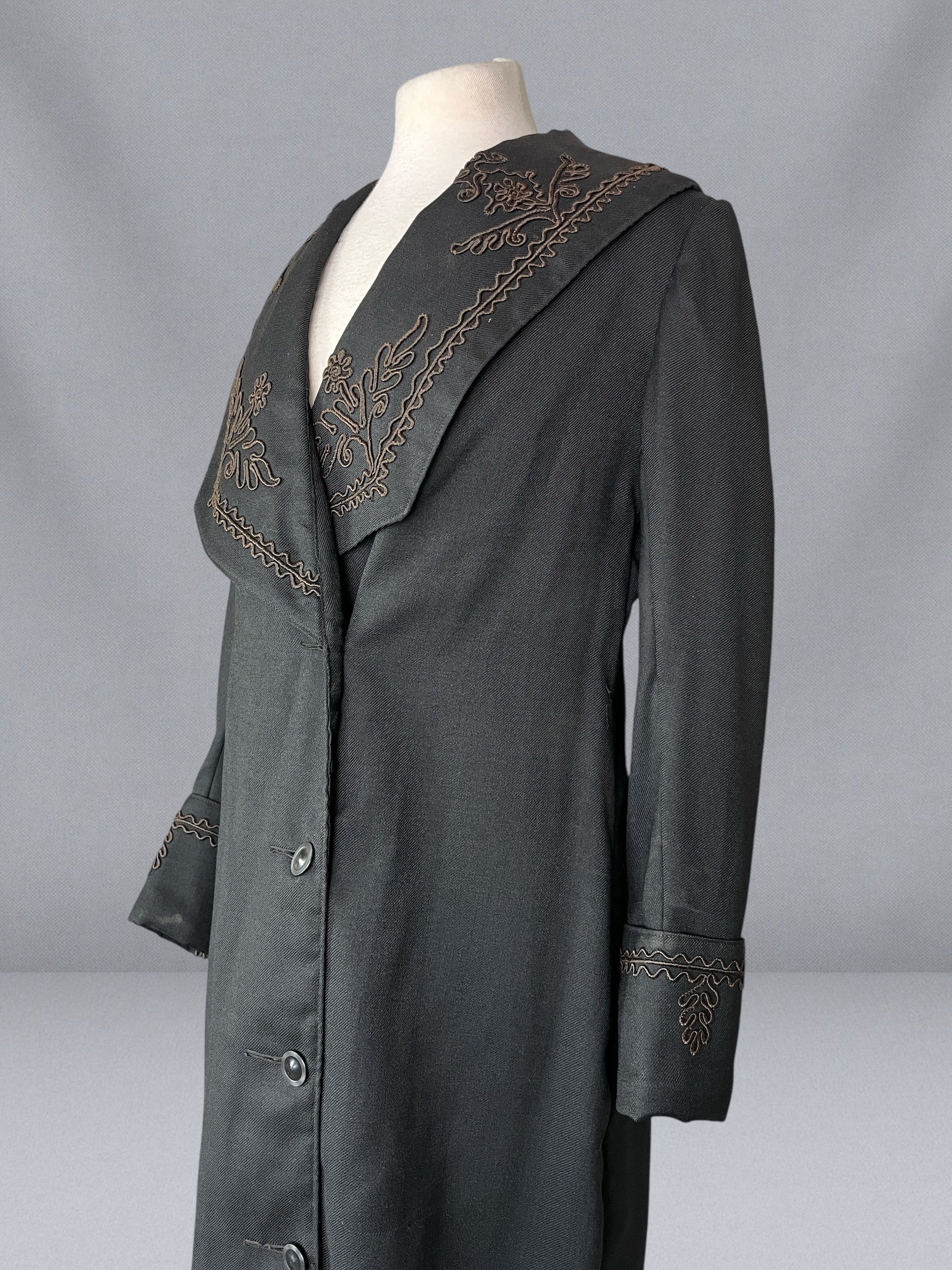 Antique late-1910s tailored car coat crafted in black wool twill with a fine diagonal weave, featuring a streamlined, gently shaped silhouette and an offset button front. The wide collar is decorated with hand-applied soutache embroidery framing the lapels and extending across the back neckline, with coordinating soutache trim at the cuffs. The cut is long and lean, designed for ease of movement while seated, with two narrow side slits at the hem.