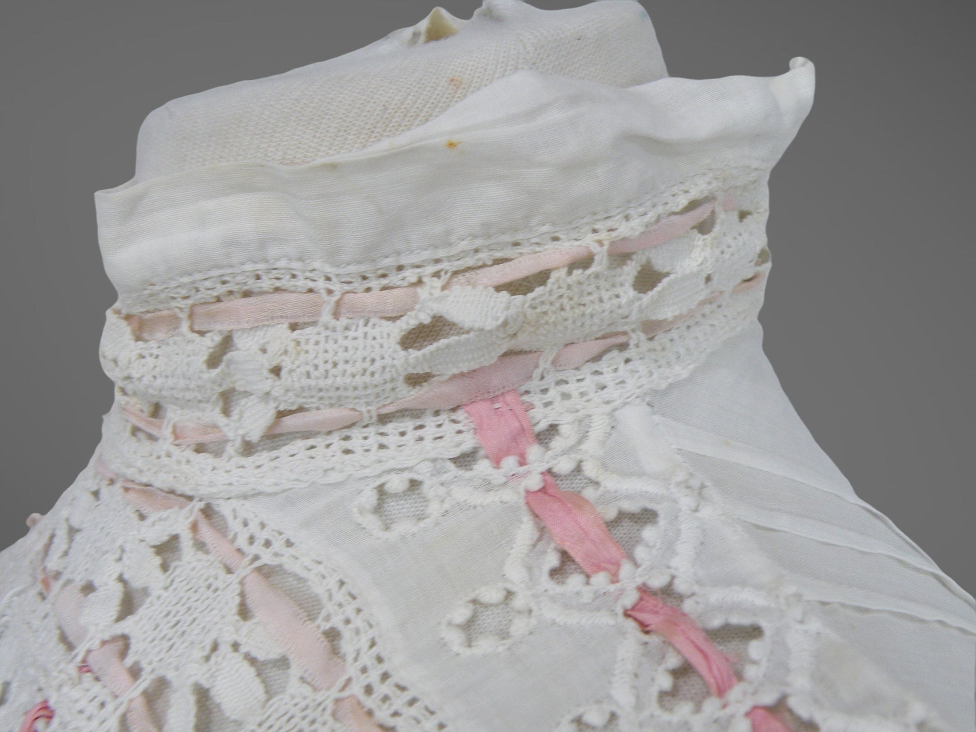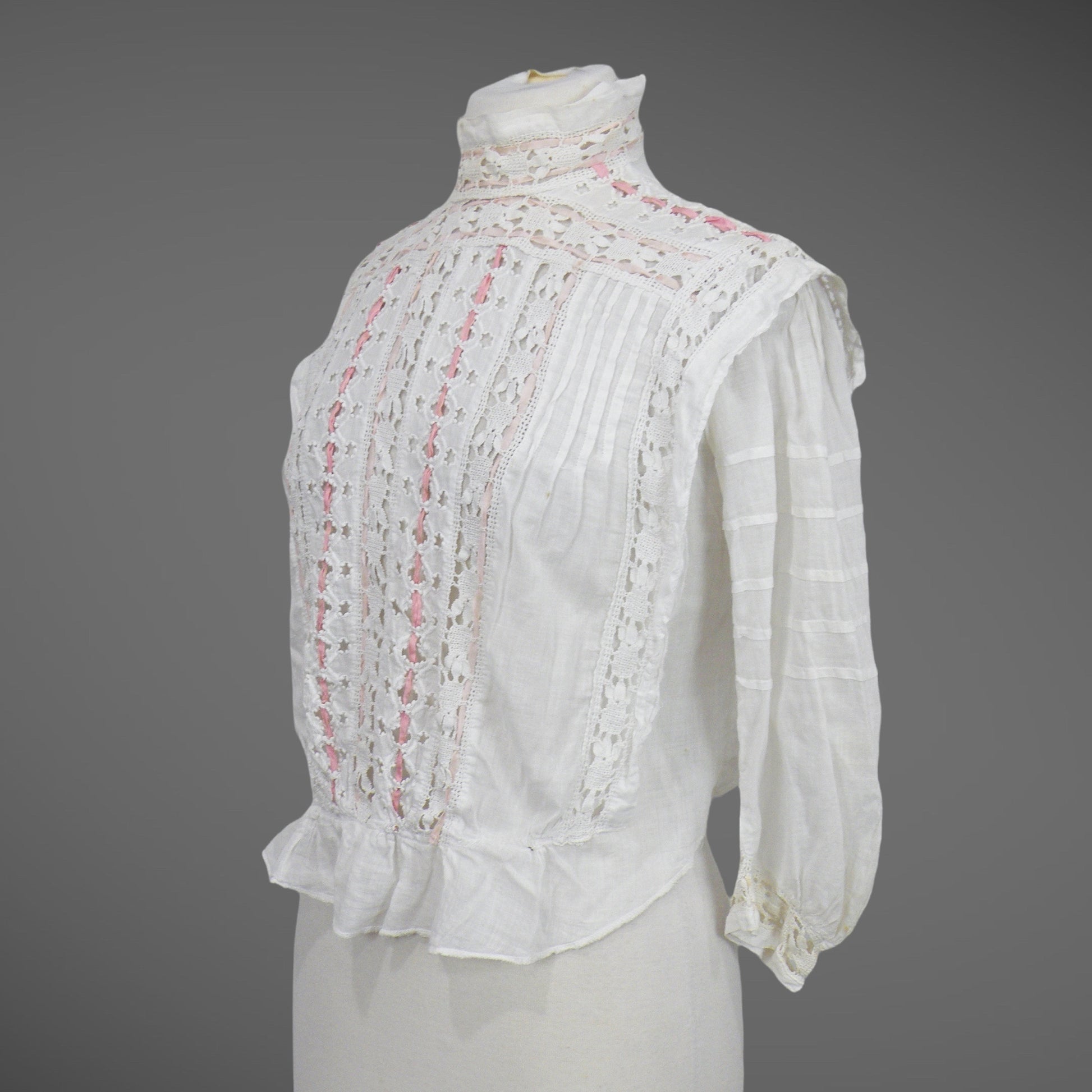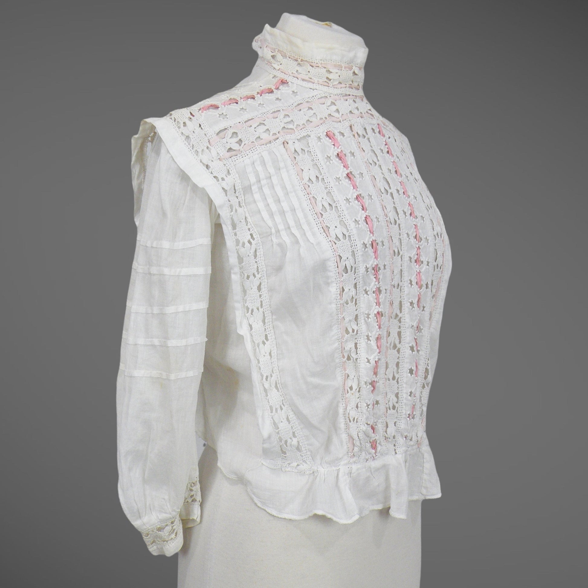 Stunning antique 1900s Edwardian white cotton blouse beautifully detailed with embroidered eyelet cutouts, Cluny lace, and softly interwoven pink silk ribbons. Crafted from semi-sheer white cotton, this blouse exemplifies the delicate surface decoration and thoughtful construction typical of early Edwardian lingerie blouses.