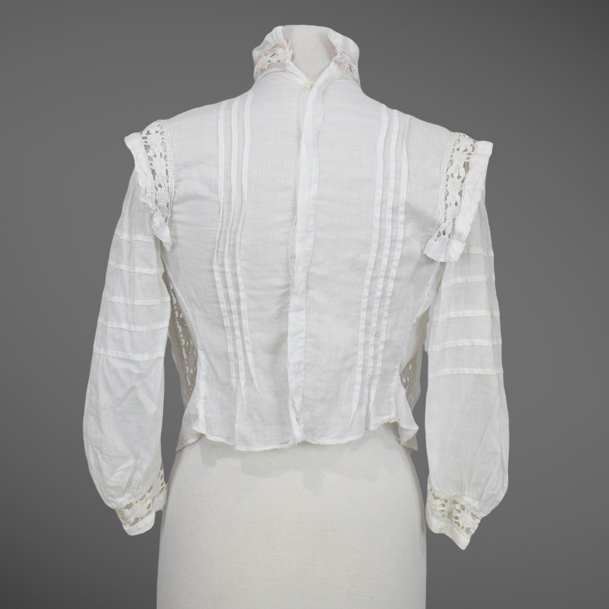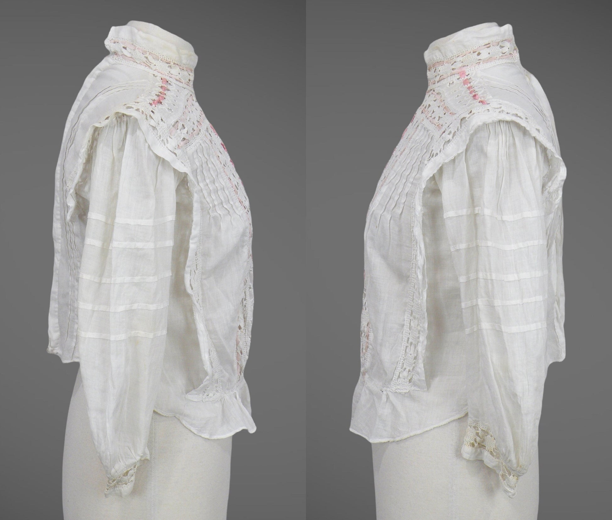 Condition: Very good antique condition. Light yellowing is present on the left sleeve and left side of the blouse, along with a couple of very small spots at the shoulder and neckline (please enlarge photos for detail). Spot treatment should further lighten or remove these marks.