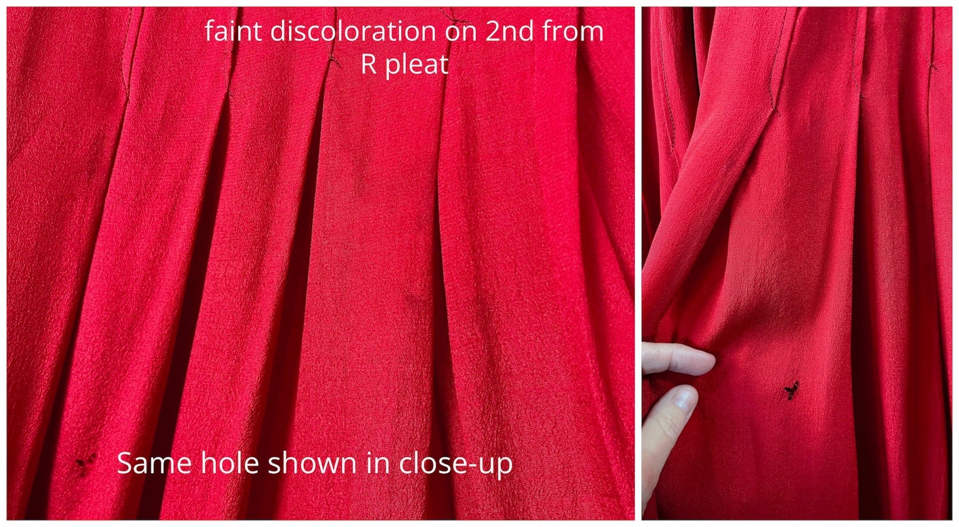 Condition: Good. Presents beautifully with minor, age-appropriate flaws. The bodice lining shows areas of tearing. A small hole is present in the skirt. There is faint discoloration and subtle water marking at the back of the skirt, visible only upon close inspection. Light underarm darkening and pinking to the lace at the seam are present, along with a couple of minor spots and a few loose silk floss ends.