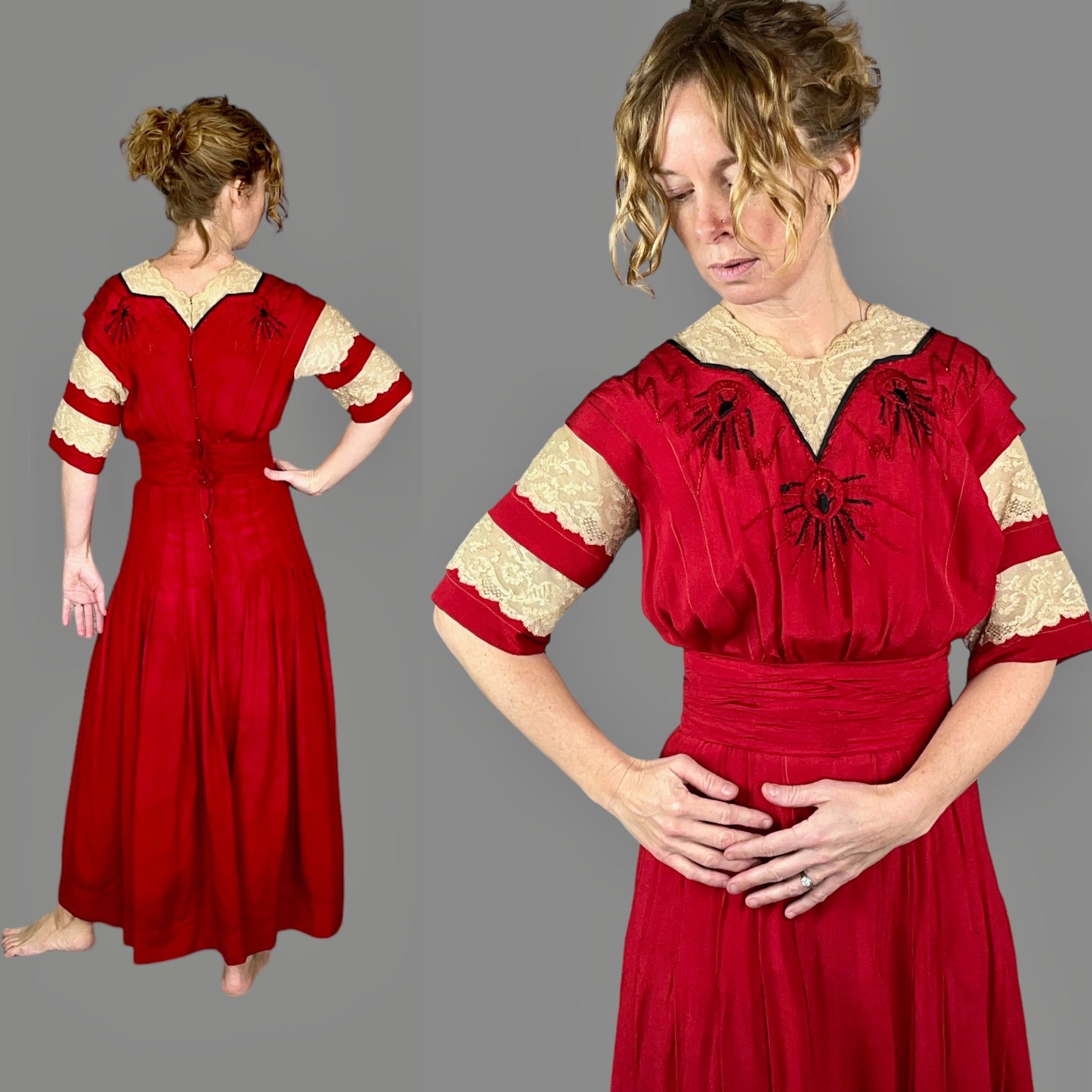 Gorgeous antique Edwardian dress dating to the 1910s, crafted in luscious red silk and finished with intricate hand embroidery and lace detailing. The silk has a beautiful depth and softness, while the yoke is especially striking, featuring red and black silk embroidered medallions accented with zigzag stitching. A scalloped cream floral lace trim frames the neckline, complemented by tiered half sleeves that add softness and movement.