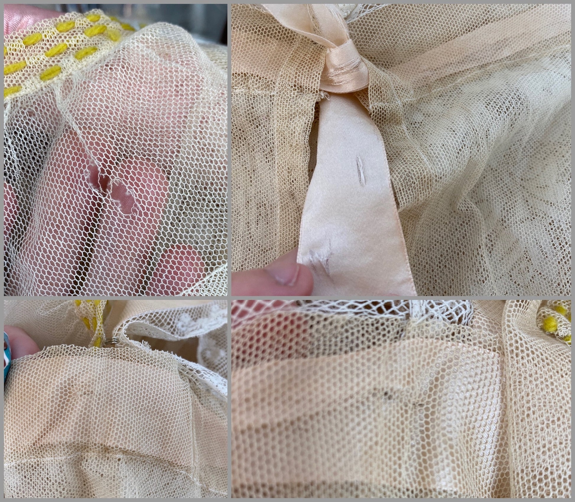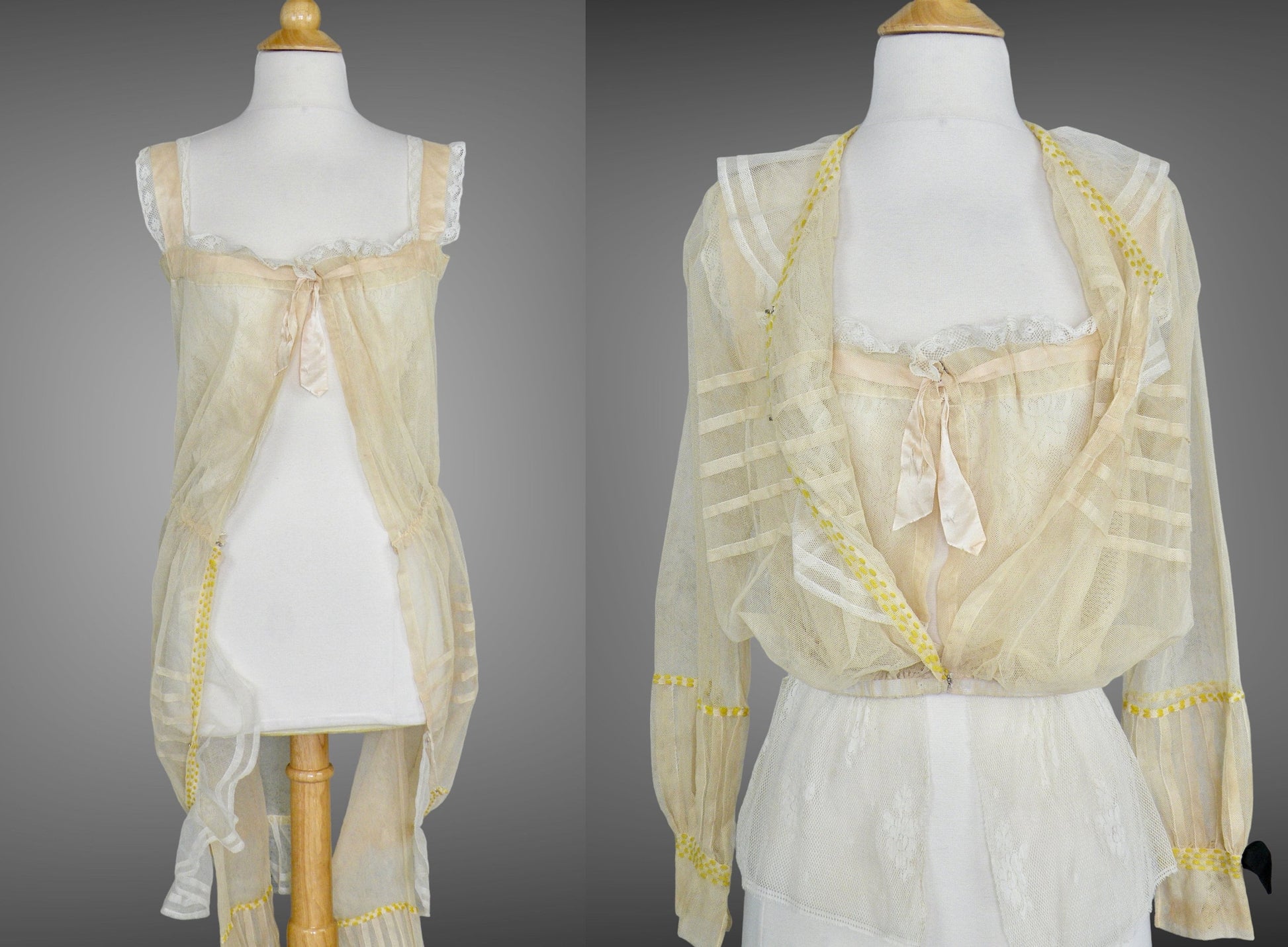 Condition: Very good antique condition. The silk ribbon on the camisole is fragile with some shredding. Light yellowing is present, primarily at the sleeve hems. Please note: the garment has not been cleaned. All condition details are noted for transparency.