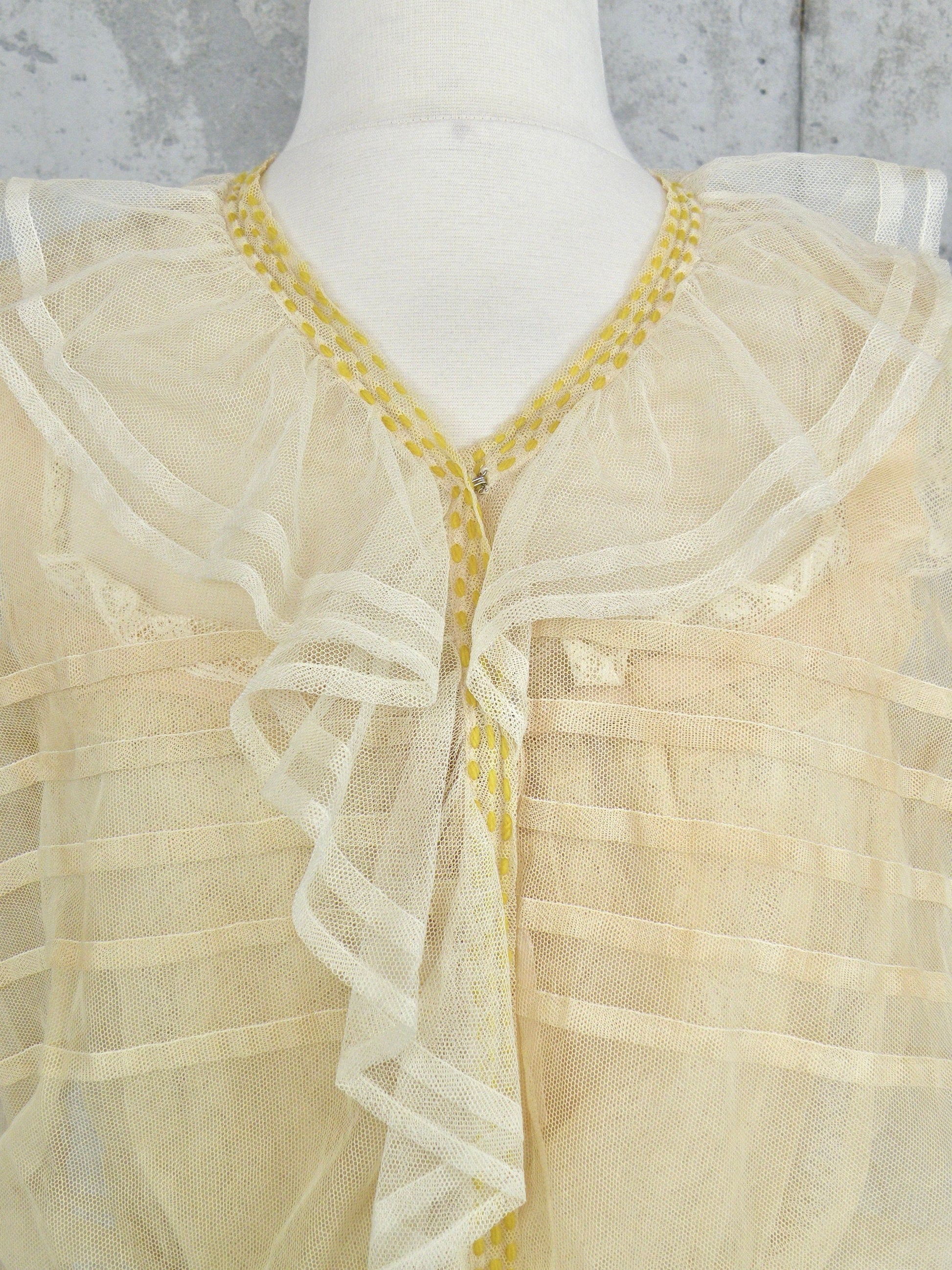 The outer net lace blouse is styled with a softly pouched Gibson Girl silhouette and finished with a ruffled collar neckline accented with yellow yarn embroidery, which continues along the sleeves for a charming period detail. Long sleeves complete the look, with the left sleeve hem accented by a small black silk taffeta bow. The blouse and camisole are joined at an elasticized waistline, providing gentle shaping and flexibility.