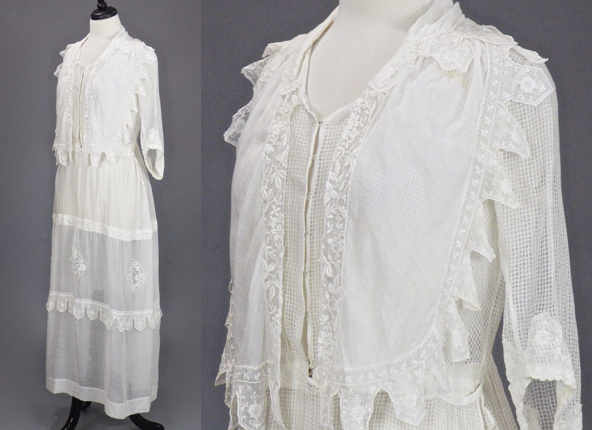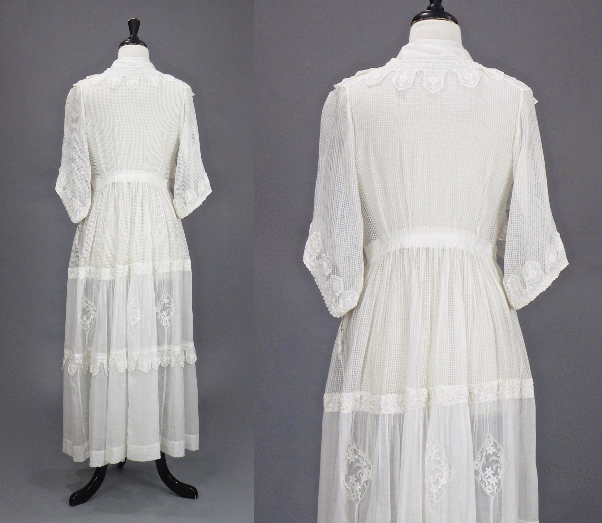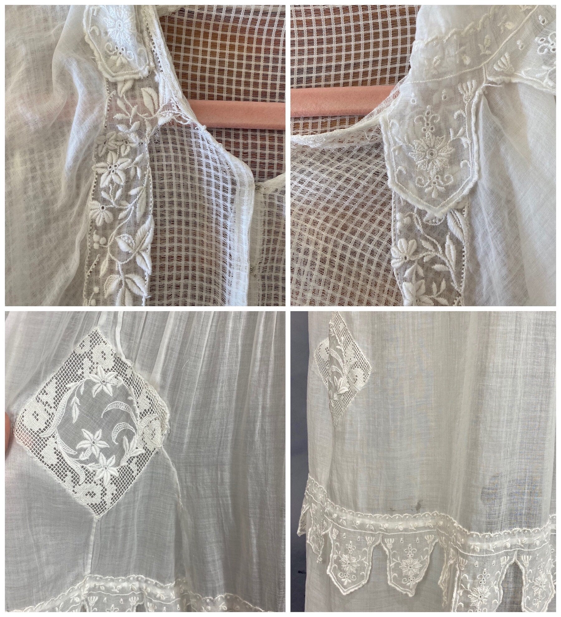 Antique Edwardian 1910s Sheer White Cotton Lingerie Dress with Embroidery, Medium 28" Waist
