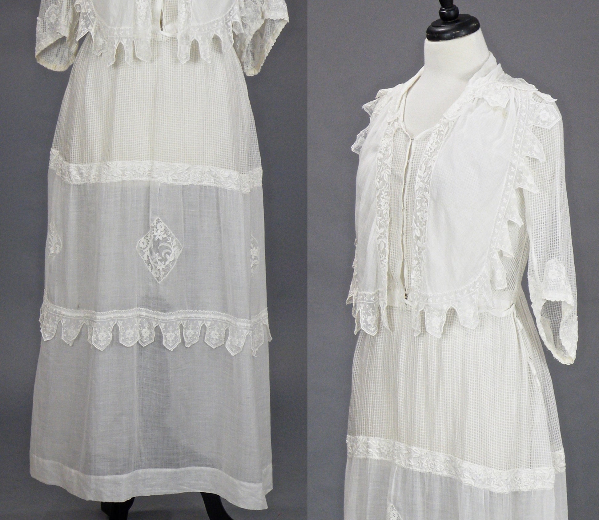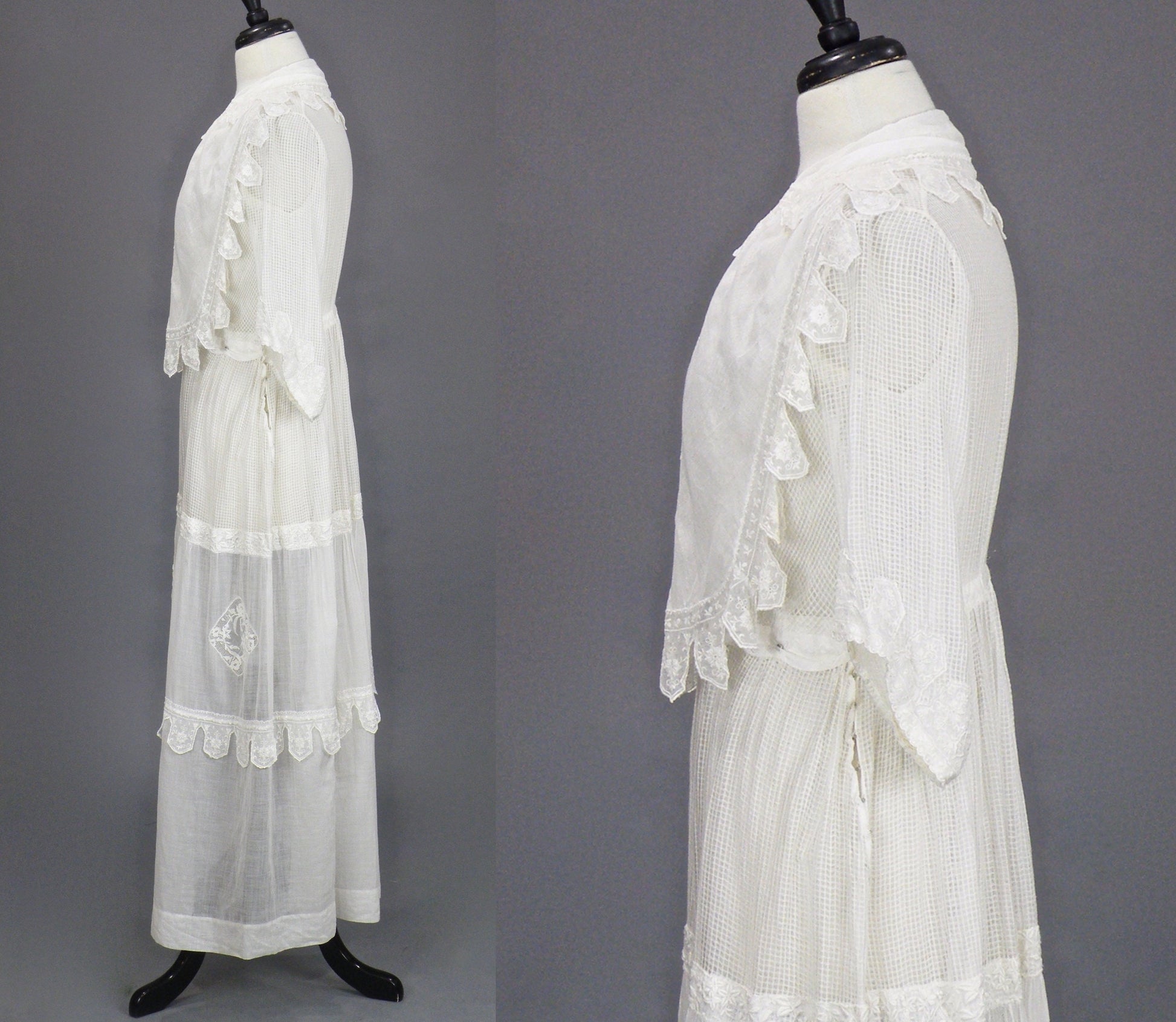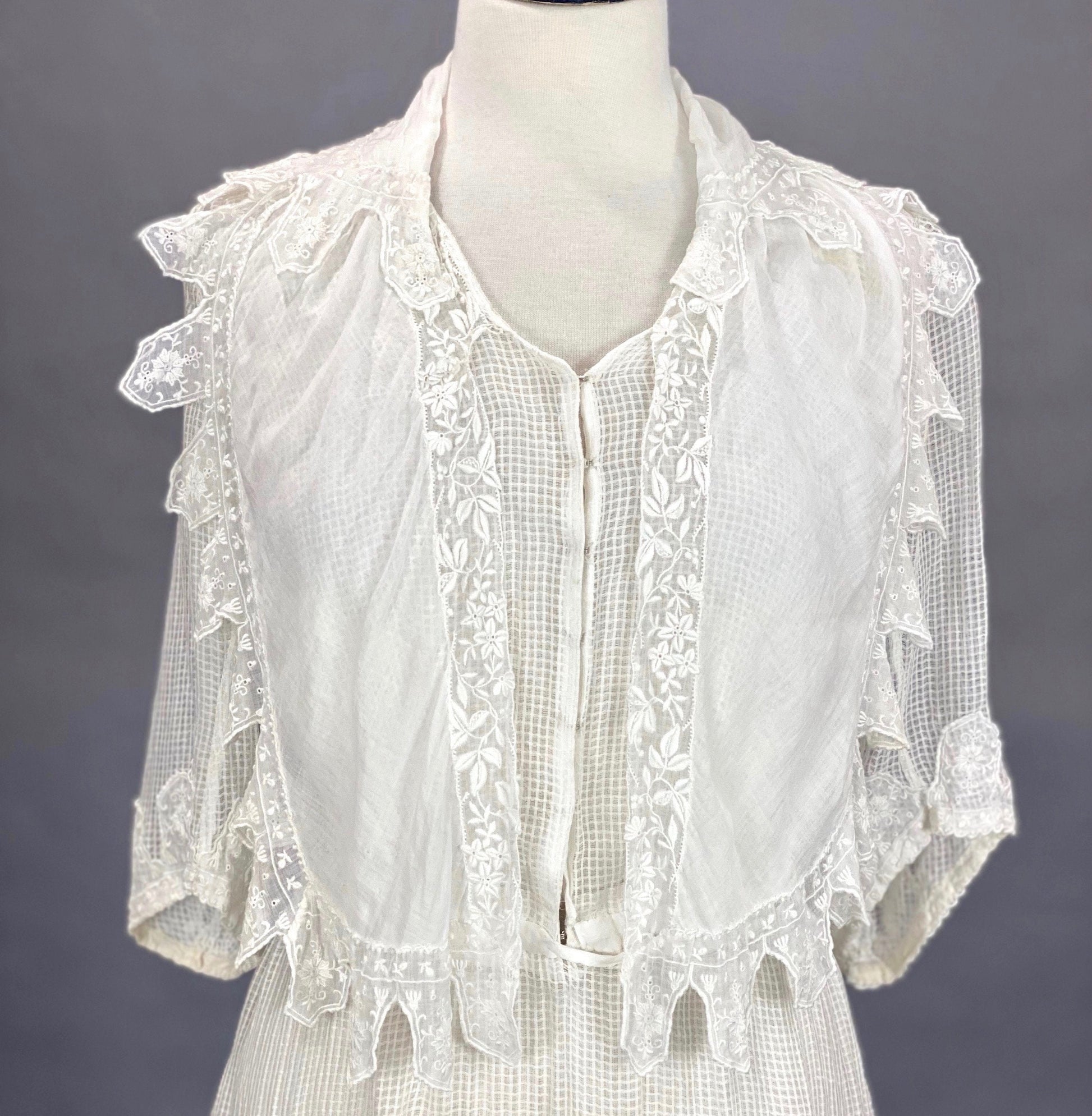 Gorgeous antique 1910s Edwardian cotton lingerie dress crafted from exceptionally fine, sheer, and lightweight materials. The body of the dress is composed of an airy windowpane-weave cotton combined with equally delicate sheer white cotton, creating a soft, translucent effect typical of high-quality lingerie dresses from the period.