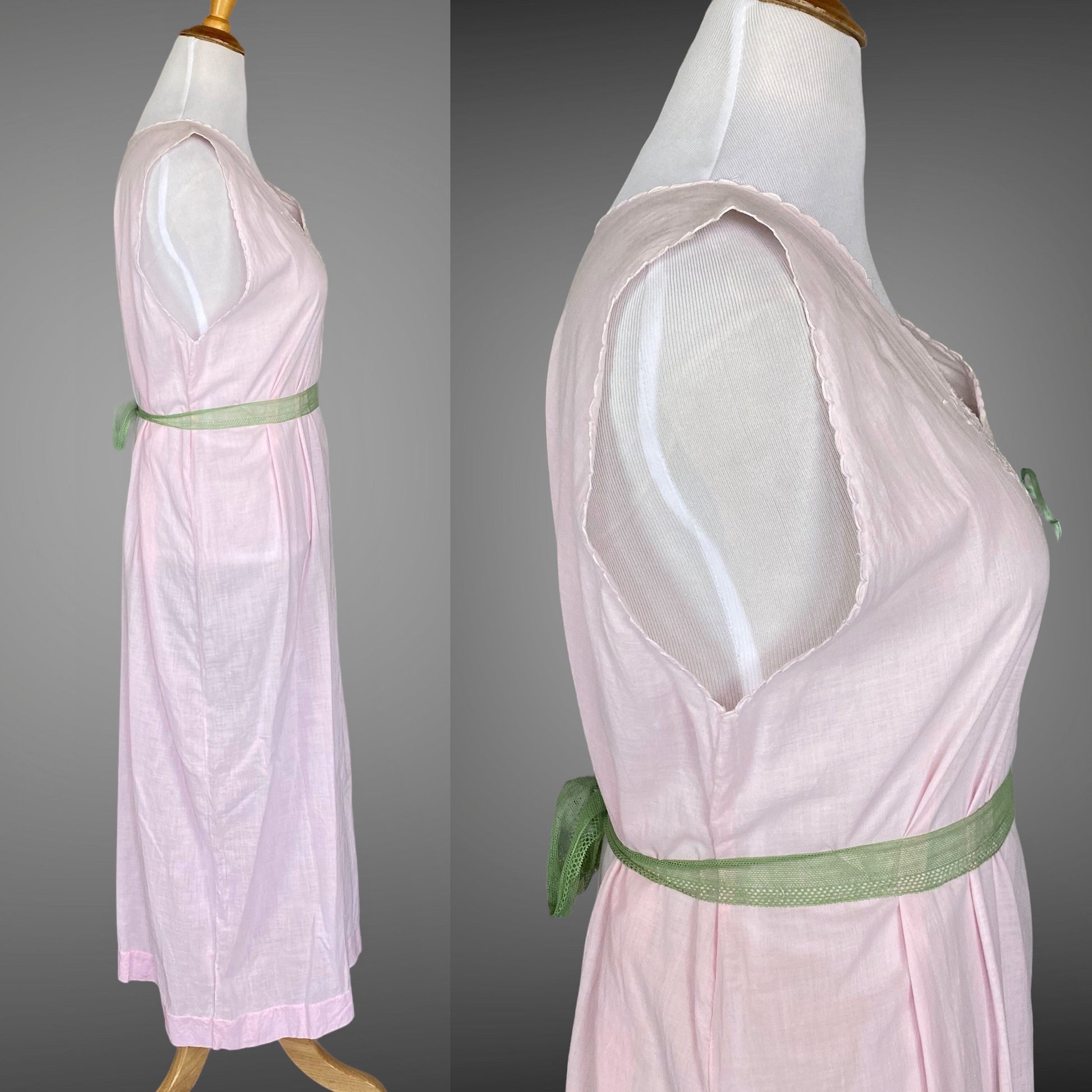 The neckline is styled with a sleeveless, trimmed, scalloped V shape, finished with a center silk ribbon tie just below the neckline. The silhouette is loose and flowing, designed as a pull-on shift with no closures, falling to an ankle-length hem depending on height. Shown styled with a vintage green lace tie waistband, which will be included with the nightgown if you wish to cinch the waist.