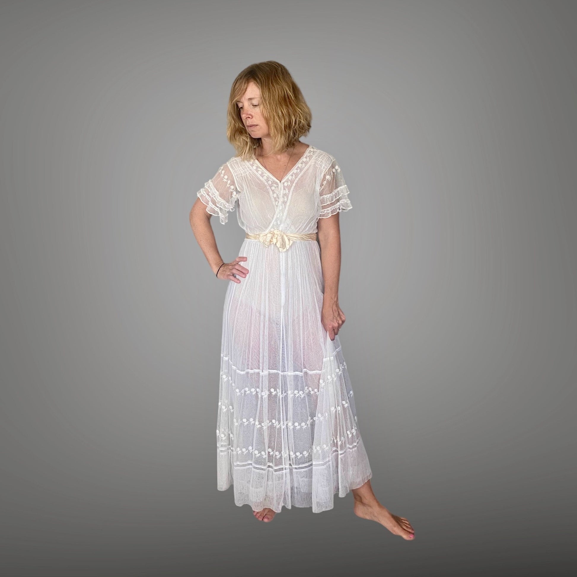 Antique 1910s White Embroidered Net Lace Edwardian Dress with Ruffle Sleeves, XS