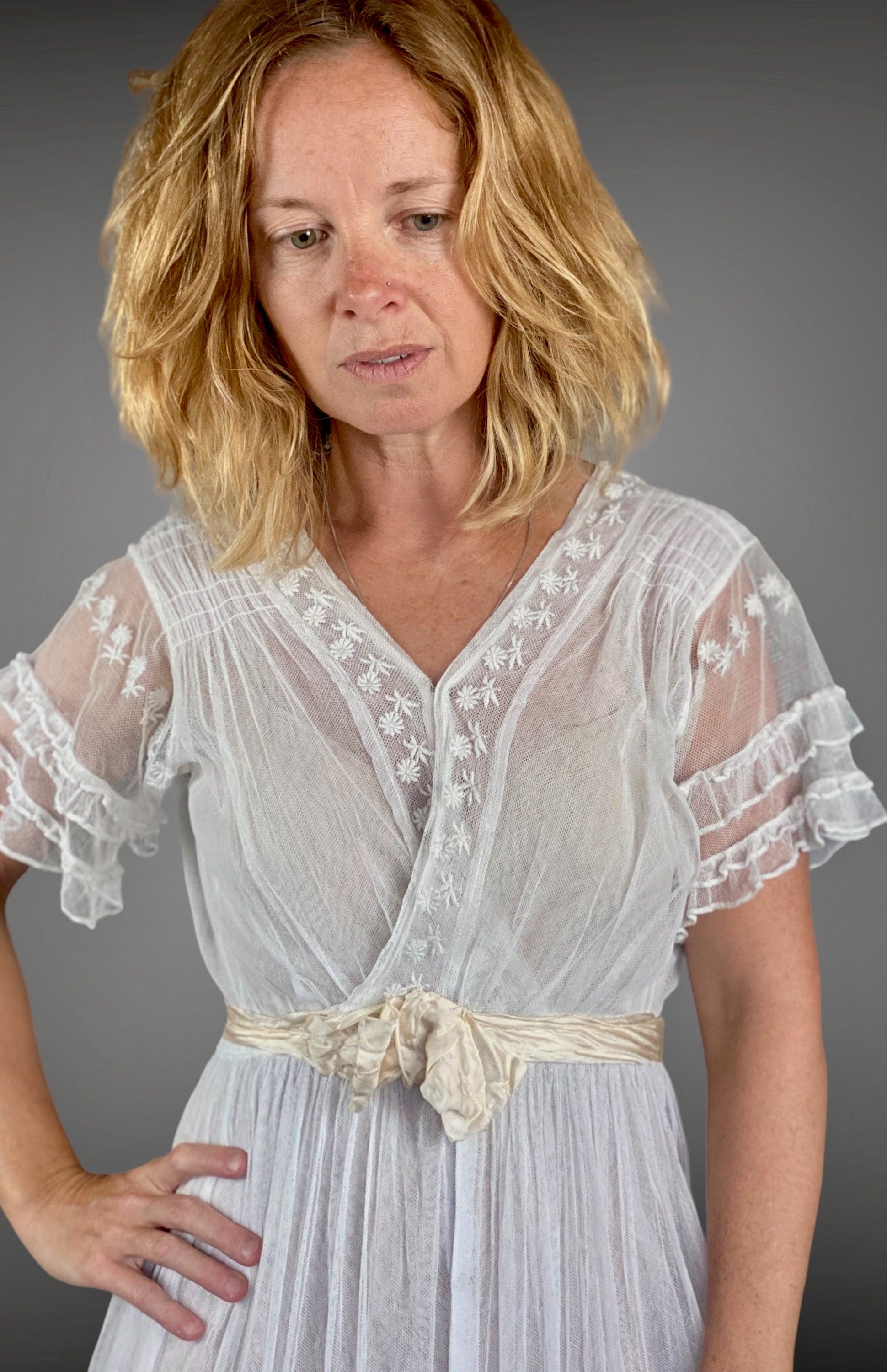 Beautiful antique 1910s embroidered white net lace Edwardian summer dress. Styled with a cross-over V neckline trimmed in embroidered daisy flowers, ruched shoulders, short tiered ruffle sleeves with embroidery, a nipped waistline enhanced with a partially attached silk satin tie sash and an embellished flowing gathered ankle length skirt. The skirt has an additional net lace under lining. She closes with hook/eyes and a few snaps down the front. Please note: I have shown the closures in both the front and back.
