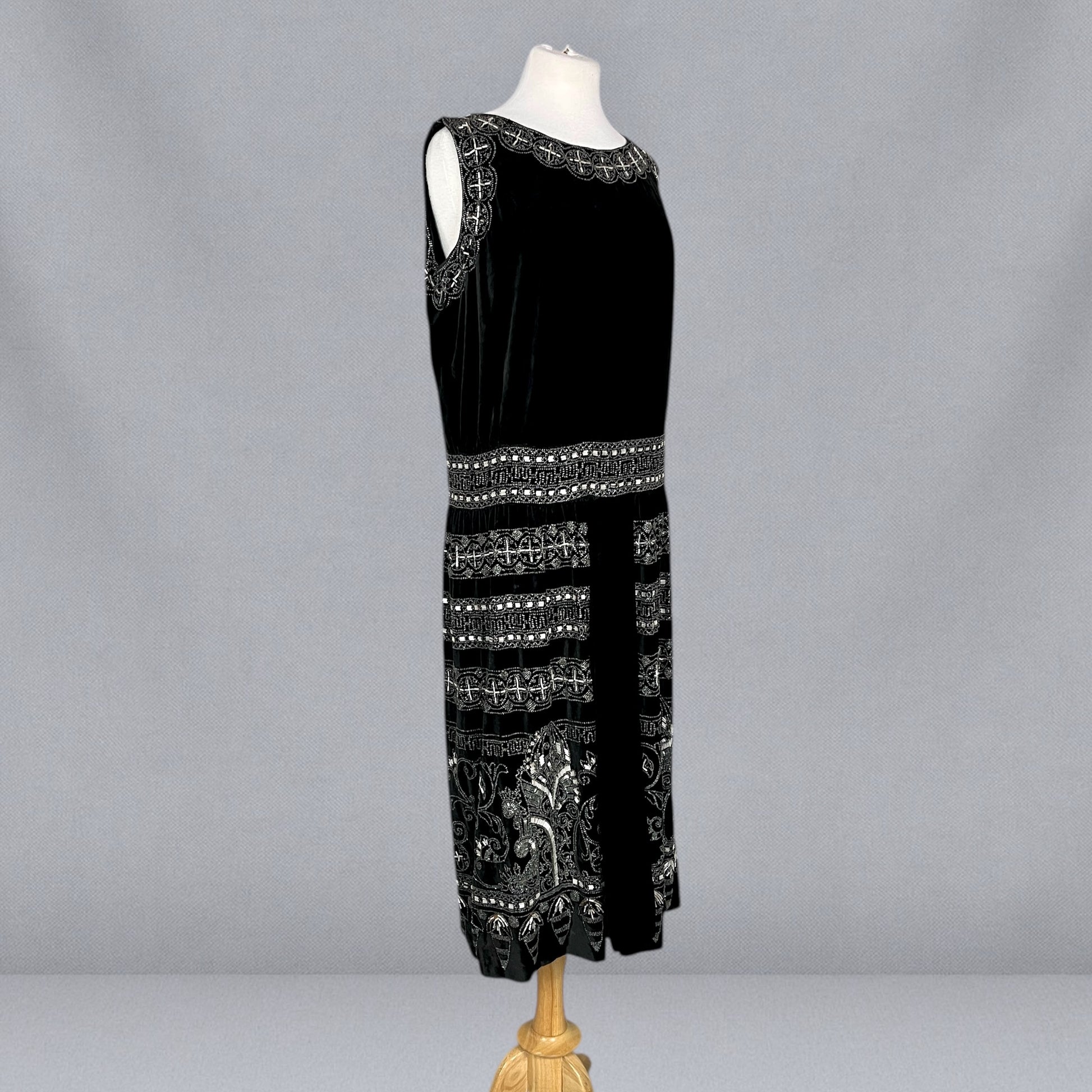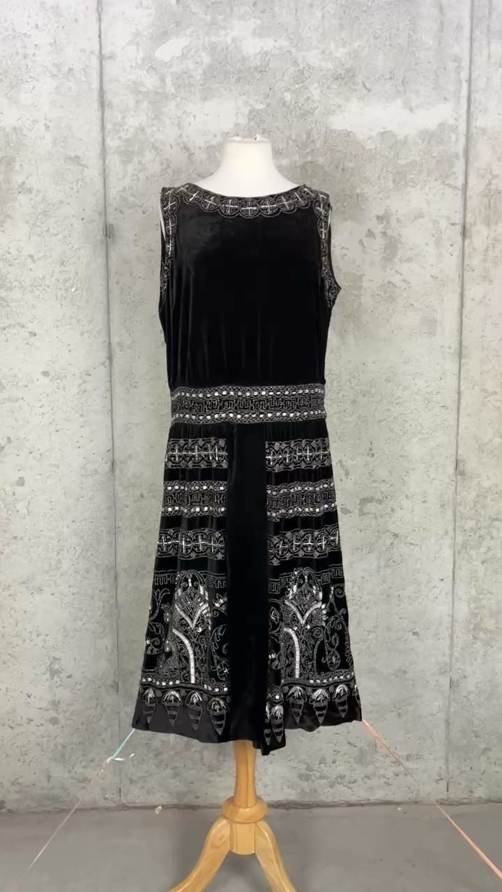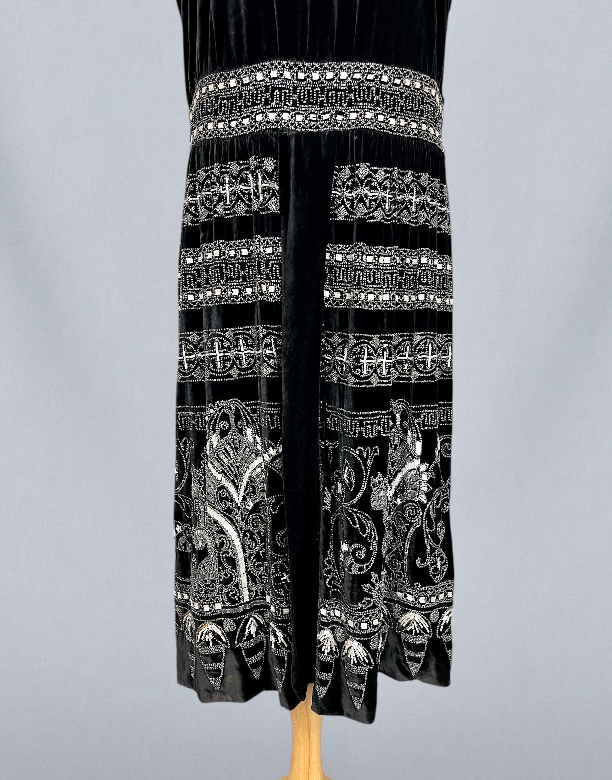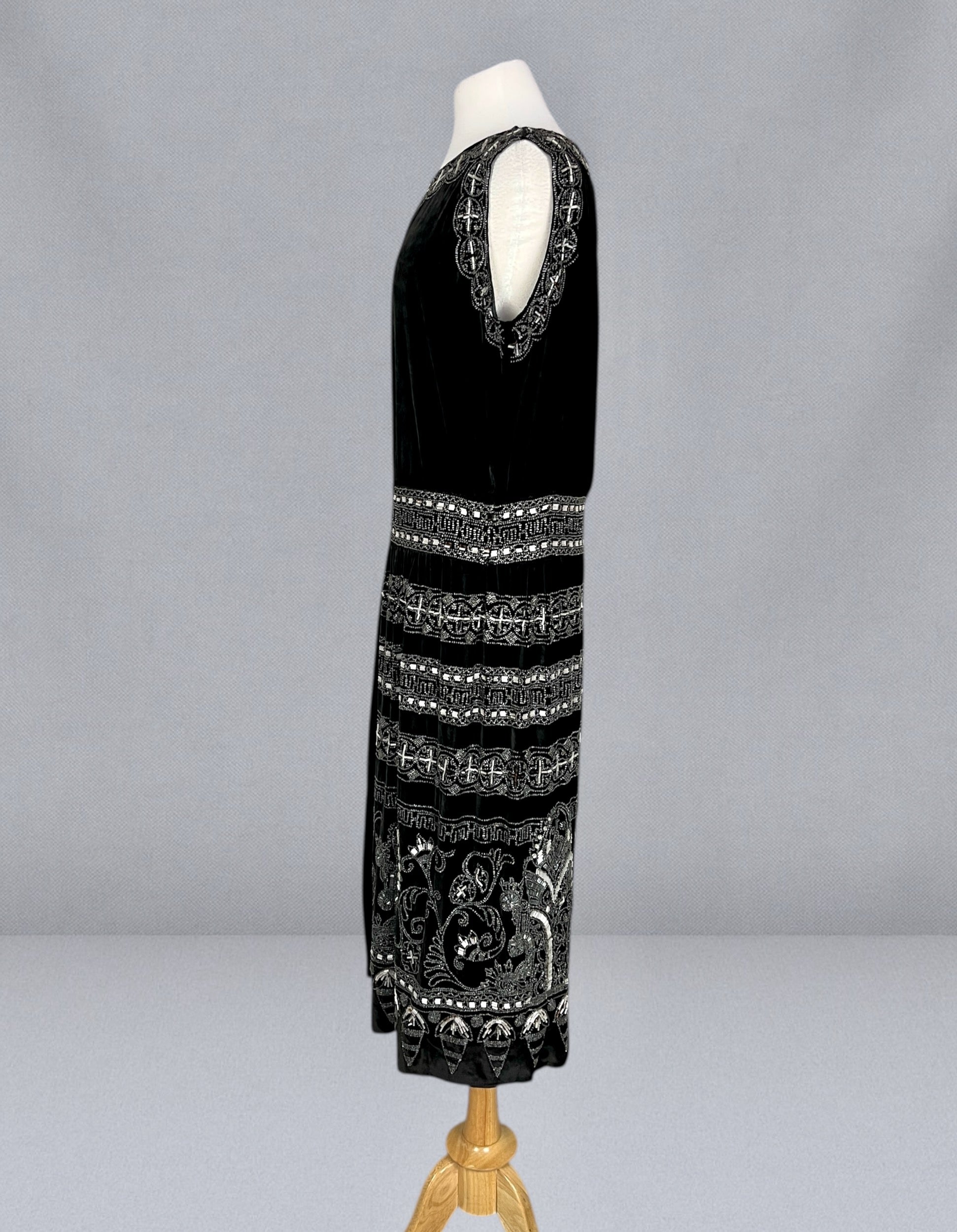 Exceptional antique 1920s evening dress crafted in rich black velvet and lavishly adorned with intricate silver and white beadwork, offering bold graphic presence. The neckline is framed with dense beaded decoration featuring repeating circular and cross-like geometric motifs, echoed throughout the skirt in beautifully layered horizontal bands. The waist features a more geometric design. The beadwork is highly detailed and architectural, combining seed and tube beads that catch the light without overwhelming the velvet ground.