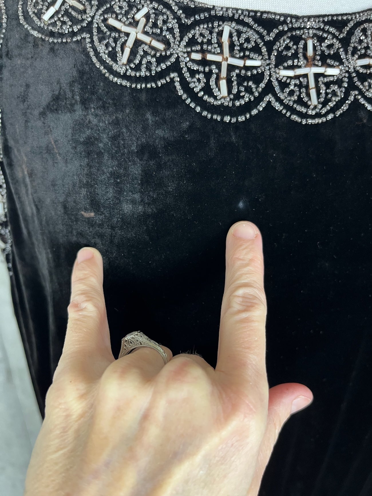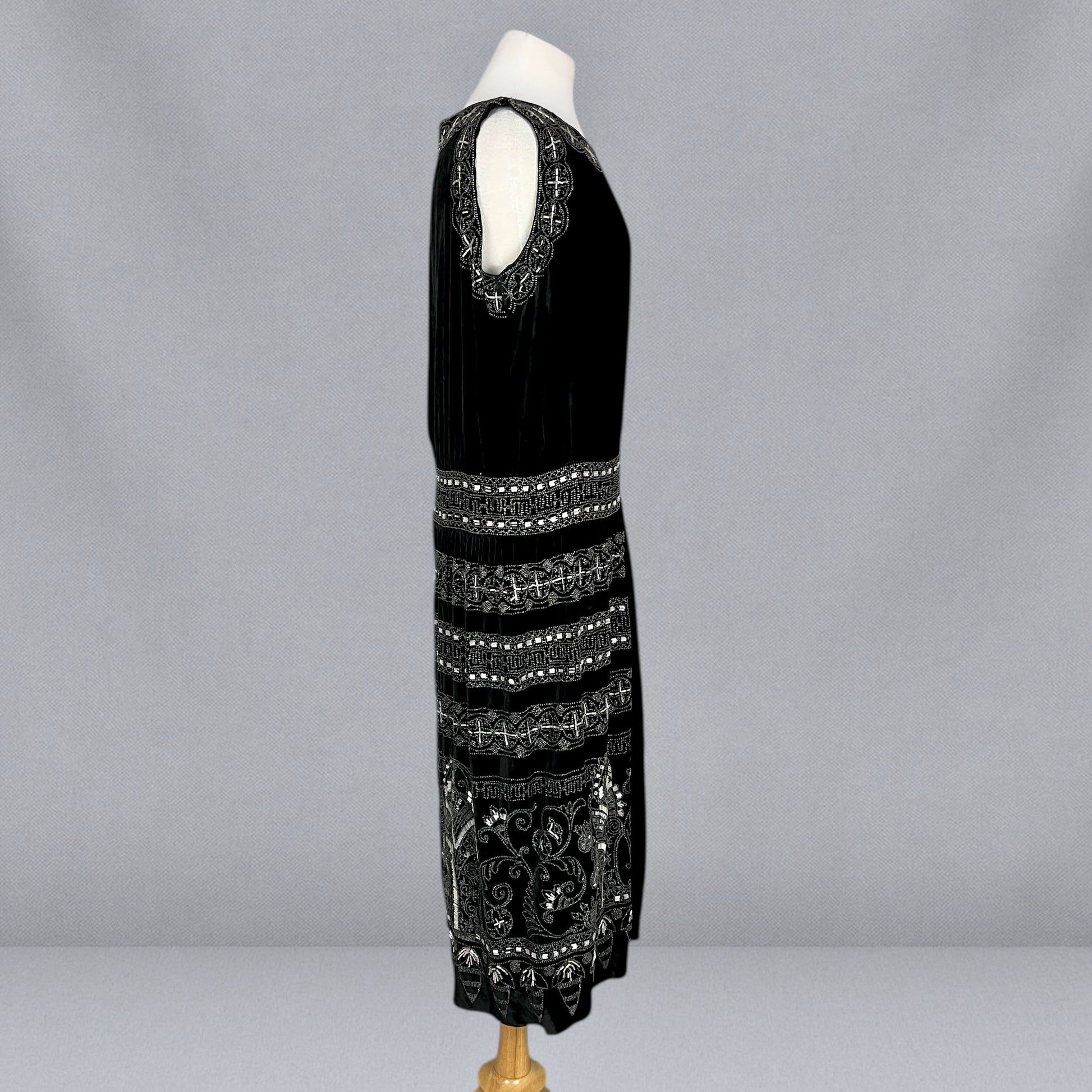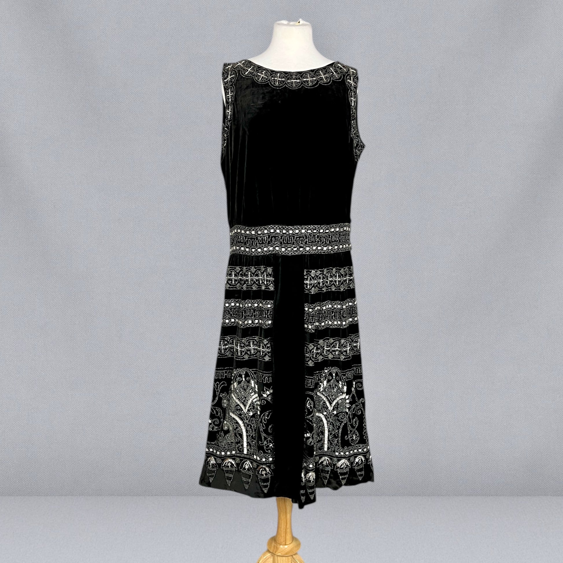 Exceptional antique 1920s evening dress crafted in rich black velvet and lavishly adorned with intricate silver and white beadwork, offering bold graphic presence. The neckline is framed with dense beaded decoration featuring repeating circular and cross-like geometric motifs, echoed throughout the skirt in beautifully layered horizontal bands. The waist features a more geometric design. The beadwork is highly detailed and architectural, combining seed and tube beads that catch the light without overwhelming the velvet ground.